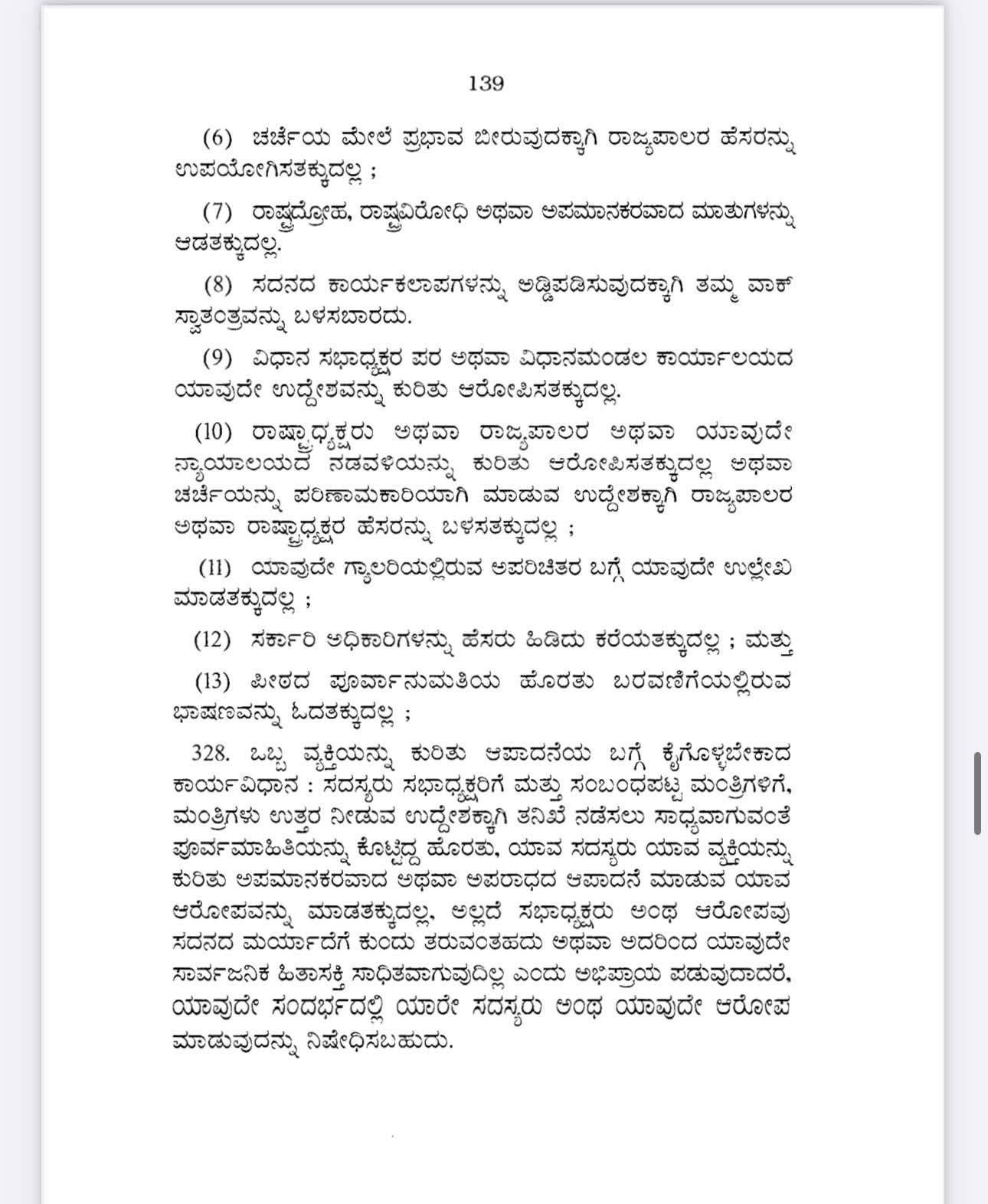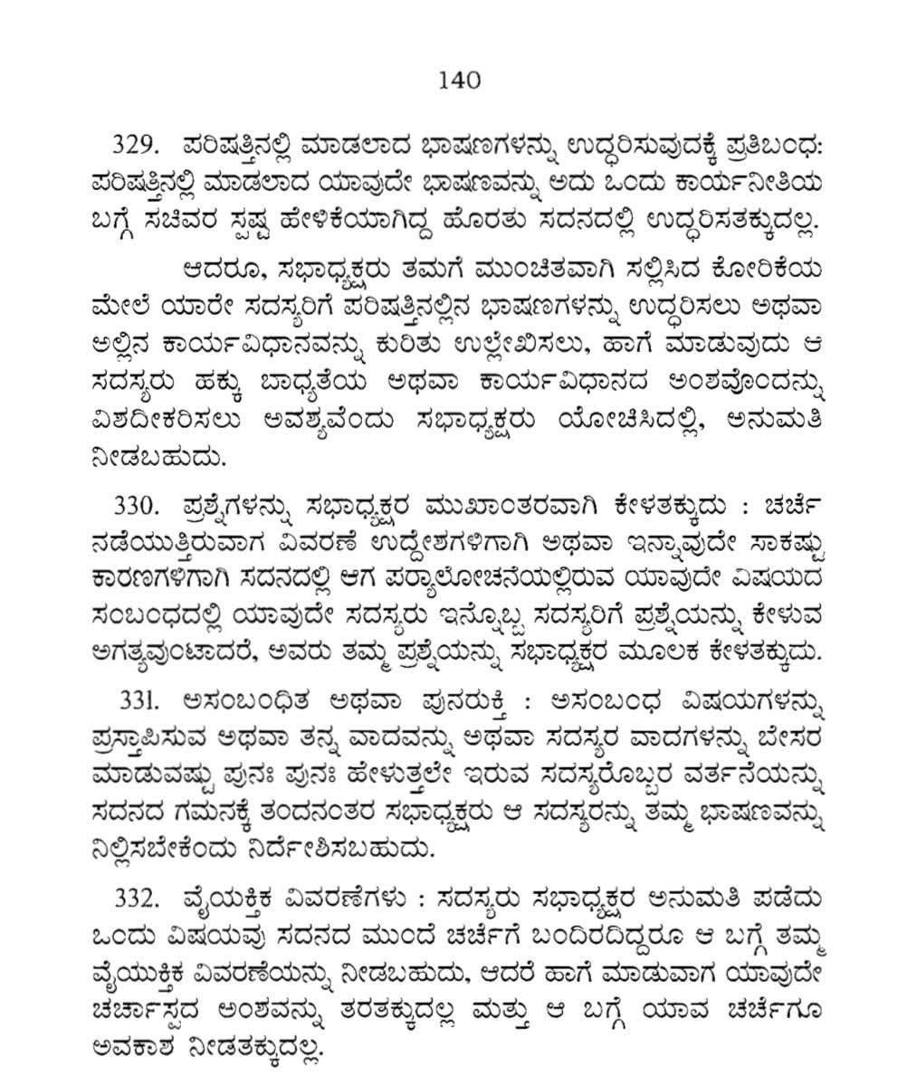 (5) ಸರಿಯಾದ ವಾಕ್ಯಗಳಲ್ಲಿ ರಚಿಸಲಾದ ಆಧಾರಸಹಿತ ಪ್ರಸ್ತಾವದ ಮೇಲೆ ಚರ್ಚೆ ನಡೆಸಿದ್ದ ಹೊರತು ಉನ್ನತಾಧಿಕಾರದಲ್ಲಿರುವ ವ್ಯಕ್ತಿಗಳ ನಡವಳಿಕೆ ಕುರಿತು ಆರೋಪಿಸತಕ್ಕುದಲ್ಲ.