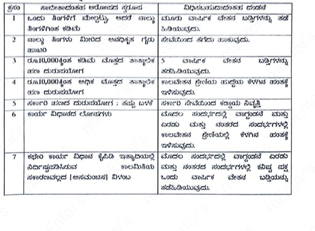 ಕರ್ನಾಟಕ ಸಿವಿಲ್ ಸೇವಾ ನಿಯಮಾವಳಿಗಳ ಅಡಿಯಲ್ಲಿ, ಶಿಸ್ತು ಪ್ರಾಧಿಕಾರಗಳು ಏಕರೂಪದ ದಂಡನೆ ವಿಧಿಸಲು ಅನುಕೂಲವಾಗುವಂತೆ ಸರ್ಕಾರವು ಕೆಲವು ಪ್ರಮುಖ ಉದಾಹರಣೆಗಳನ್ನು ಪಟ್ಟಿ ಮಾಡಿದೆ. ಅದರ ವಿವರ ಇಲ್ಲಿದೆ.