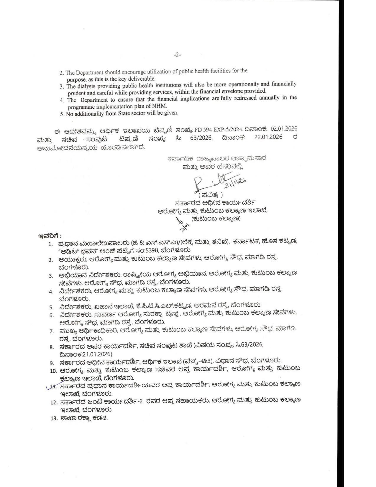 ಅಭಿಯಾನ ನಿರ್ದೇಶಕರ ಪುಸ್ತಾವನೆಯಂತೆ ಪ್ರಧಾನಮಂತ್ರಿ ರಾಷ್ಟ್ರೀಯ ಡಯಾಲಿಸಿಸ್ ಕಾರ್ಯಕ್ರಮದಡಿಯಲ್ಲಿ ಕಲ್ಬುರ್ಗಿ ವಿಭಾಗವನ್ನು ಒಳಗೊಂಡಂತೆ ಪಿ.ಪಿ.ಪಿ. ಮಾದರಿಗೆ ಒಳಪಡದ ಎಲ್ಲಾ ಸರ್ಕಾರಿ ಆಸ್ಪತ್ರೆಗಳು ಸ್ವಯಂ ಚಾಲನೆಯ ಆಧಾರದ ಮೇಲೆ ಡಯಾಲಿಸಿಸ್ ಸೇವೆಯನ್ನು ಒದಗಿಸಲು, ಡಯಾಲಿಸಿಸ್ ಸೇವೆಯನ್ನು SAST ಸಂಸ್ಥೆಯ ಮುಖಾಂತರ ಅನುಷ್ಟಾನಗೊಳಿಸಲು ಹಾಗೂ PHH ಕಾರ್ಡ್ದಾರರಿಗೆ ಉಚಿತವಾಗಿ ಮತ್ತು PHH ಕಾರ್ಡ್ದಾರರಲ್ಲದ ಫಲಾನುಭವಿಗಳಿಗೆ ಸಬ್ಸಿಡಿ ದರದಲ್ಲಿ ನೀಡಲಾಗಿದ್ದು, ಪ್ರತಿ ಡಯಾಲಿಸಿಸ್ ಸೈಕಲ್ ಕಾರ್ಯಾಚರಣೆಯ ವೆಚ್ಚವನ್ನು ರೂ.1000/-ದಂತೆ ಮರುಪಾವತಿಸಲು ದಿನಾಂಕ: 17.09.2024 ರಂದು ನಡೆದ ಸಚಿವ ಸಂಪುಟವು ಅನುಮೋದನೆ ನೀಡಿರುವುದನ್ನು ಮಾರ್ಪಡಿಸಿ ಕಲಬುರಗಿ ವಿಭಾಗದ ಆರೋಗ್ಯ ಕೇಂದ್ರಗಳಲ್ಲಿ In house ಮಾದರಿಯಲ್ಲಿ ಡಯಾಲಿಸಿಸ್ ಸೇವೆಗಳನ್ನು ಒದಗಿಸುತ್ತಿರುವ ಪತಿ ಡಯಾಲಿಸಿಸ್ ಸೈಕಲ್ ದರವನ್ನು ಹೆಚ್ಚಿಸಿ ನಿಗಧಿಪಡಿಸಲು ತೀರ್ಮಾನಿಸಿ ಕೆಳಕಂಡಂತೆ ಆದೇಶಿಸಿದ್ದಾರೆ.
