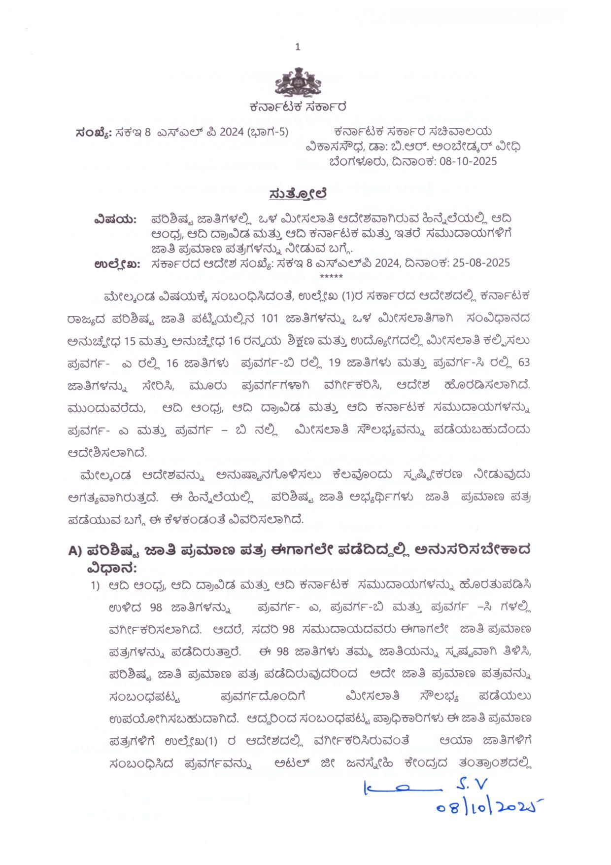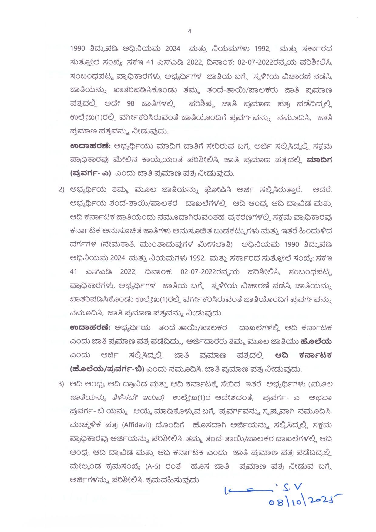 1) ಆದಿ ಆಂಧ್ರ, ಆದಿ ದ್ರಾವಿಡ ಮತ್ತು ಆದಿ ಕರ್ನಾಟಕ ಜಾತಿಗಳನ್ನು ಹೊರತುಪಡಿಸಿ, ಉಳಿದ 98 ಜಾತಿಗಳನ್ನು ನಮೂದಿಸಿ, ಅರ್ಜಿ ಸಲ್ಲಿಸಿದ್ದಲ್ಲಿ ಅಂತಹ ಅರ್ಜಿಗಳನ್ನು ಅರ್ಜಿ ಸ್ವೀಕರಿಸಿದ ಪ್ರಾಧಿಕಾರಗಳು ಕರ್ನಾಟಕ ಅನುಸೂಚಿತ ಜಾತಿಗಳು ಅನುಸೂಚಿತ ಬುಡಕಟ್ಟುಗಳು ಮತ್ತು ಇತರೆ ಹಿಂದುಳಿದ ವರ್ಗಗಳ (ನೇಮಕಾತಿ, ಮುಂತಾದುವುಗಳ ಮೀಸಲಾತಿ) ಅಧಿನಿಯಮ 41990 ತಿದ್ದುಪಡಿ ಅಧಿನಿಯಮ 2024 ಮತ್ತು ನಿಯಮಗಳು 1992, ಮತ್ತು ಸರ್ಕಾರದ ಸುತ್ತೋಲೆ ಸಂಖ್ಯೆ: ಸಕಇ 41 ಎಸ್ಡಿ 2022, ದಿನಾಂಕ: 02-07-2022ರನ್ವಯ ಪರಿಶೀಲಿಸಿ, ಸಂಬಂಧಪಟ್ಟ ಪ್ರಾಧಿಕಾರಗಳು, ಅಭ್ಯರ್ಥಿಗಳ ಜಾತಿಯ ಬಗ್ಗೆ ಸ್ಥಳೀಯ ವಿಚಾರಣೆ ನಡೆಸಿ, ಜಾತಿಯನ್ನು ಖಾತರಿಪಡಿಸಿಕೊಂಡು ತಮ್ಮ ತಂದೆ-ತಾಯಿ/ಪಾಲಕರು ಜಾತಿ ಪ್ರಮಾಣ ಪತ್ರದಲ್ಲಿ ಅದೇ 98 ಜಾತಿಗಳಲ್ಲಿ ಪರಿಶಿಷ್ಟ ಜಾತಿ ಪ್ರಮಾಣ ಪತ್ರ ಪಡೆದಿದ್ದಲ್ಲಿ ಉಲ್ಲೇಖ(1)ರಲ್ಲಿ ವರ್ಗೀಕರಿಸಿರುವಂತೆ ಜಾತಿಯೊಂದಿಗೆ ಪವರ್ಗವನ್ನು ನಮೂದಿಸಿ, ಜಾತಿ ಪಮಾಣ ಪತ್ರವನ್ನು ನೀಡುವುದು.