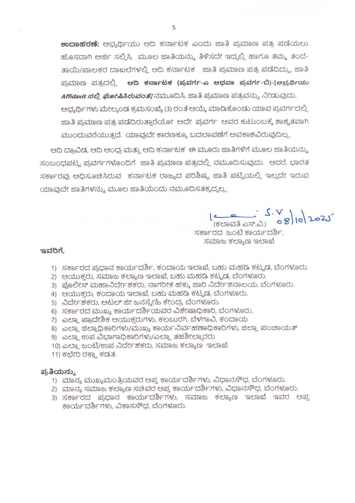 ಆದಿ ದ್ರಾವಿಡ ಮತ್ತು ಅದಿ ಆಂಧ್ರ ಅಭ್ಯರ್ಥಿಗಳು ಇದೇ ರೀತಿ ಜಾತಿ ಪ್ರಮಾಣ ಪತ್ರ ನೀಡಲು ಕ್ರಮವಹಿಸುವುದು. ಸದರಿ ಪ್ರಕ್ರಿಯೆಯು ಆದಿ ದ್ರಾವಿಡ, ಆದಿ ಆಂಧ್ರ ಮತ್ತು ಆದಿ ಕರ್ನಾಟಕ ಎಂದು ಜಾತಿ ಪುಮಾಣ ಪತ್ರ ಪಡೆದು ಮೂಲಜಾತಿಯನ್ನು ಅರ್ಜಿಯಲ್ಲಿ ತಿಳಿಸದೇ ಇರುವ ಅಭ್ಯರ್ಥಿಗಳಿಗೆ ಮಾತ್ರ ಅನ್ವಯಿಸುತ್ತದೆ.