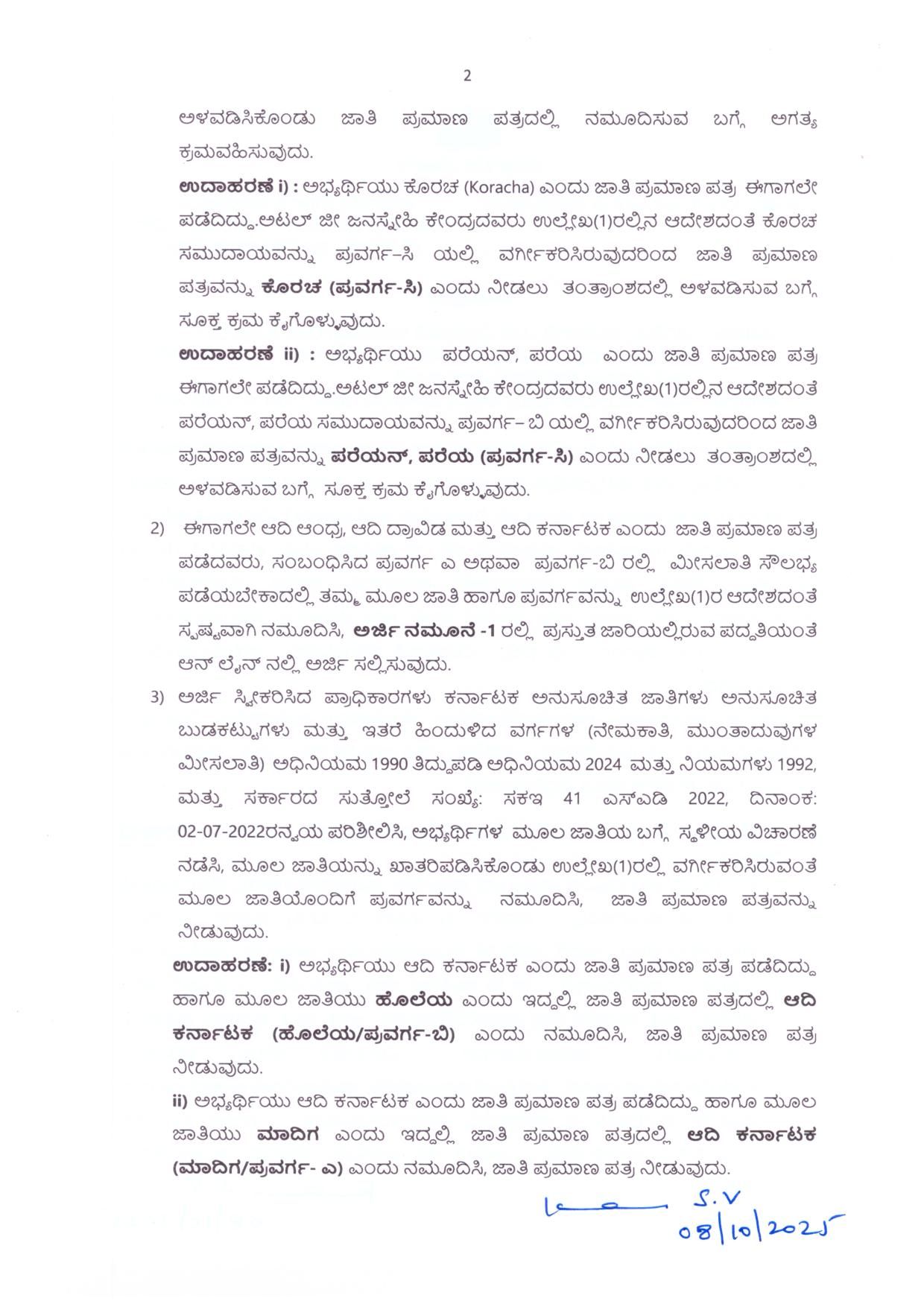 2) ಅಭ್ಯರ್ಥಿಯ ತಮ್ಮ ಮೂಲ ಜಾತಿಯನ್ನು ಘೋಷಿಸಿ ಅರ್ಜಿ ಸಲ್ಲಿಸಿರುತ್ತಾರೆ. ಆದರೆ, ಅಭ್ಯರ್ಥಿಯ ತಂದೆ-ತಾಯಿ/ಪಾಲಕರ ದಾಖಲೆಗಳಲ್ಲಿ ಆದಿ ಆಂಧ್ರ, ಆದಿ ದ್ರಾವಿಡ ಮತ್ತು ಆದಿ ಕರ್ನಾಟಕ ಜಾತಿಯೆಂದು ನಮೂದಾಗಿರುವಂತಹ ಪುಕರಣಗಳಲ್ಲಿ ಸಕ್ಷಮ ಪ್ರಾಧಿಕಾರವು ಕರ್ನಾಟಕ ಅನುಸೂಚಿತ ಜಾತಿಗಳು ಅನುಸೂಚಿತ ಬುಡಕಟ್ಟುಗಳು ಮತ್ತು ಇತರೆ ಹಿಂದುಳಿದ ವರ್ಗಗಳ (ನೇಮಕಾತಿ, ಮುಂತಾದುವುಗಳ ಮೀಸಲಾತಿ) ಅಧಿನಿಯಮ 1990 ತಿದ್ದುಪಡಿ ಅಧಿನಿಯಮ 2024 ಮತ್ತು ನಿಯಮಗಳು 1992, ಮತ್ತು ಸರ್ಕಾರದ ಸುತ್ತೋಲೆ ಸಂಖ್ಯೆ: ಸಕಇ 41 ಎಸ್ಡಿ 2022, ದಿನಾಂಕ: 02-07-2022ರನ್ವಯ ಪರಿಶೀಲಿಸಿ, ಸಂಬಂಧಪಟ್ಟ ಪ್ರಾಧಿಕಾರಗಳು, ಅಭ್ಯರ್ಥಿಗಳ ಜಾತಿಯ ಬಗ್ಗೆ ಸ್ಥಳೀಯ ವಿಚಾರಣೆ ನಡೆಸಿ, ಜಾತಿಯನ್ನು ಖಾತರಿಪಡಿಸಿಕೊಂಡು ಉಲ್ಲೇಖ(1)ರಲ್ಲಿ ವರ್ಗೀಕರಿಸಿರುವಂತೆ ಜಾತಿಯೊಂದಿಗೆ ಪವರ್ಗವನ್ನು ನಮೂದಿಸಿ, ಜಾತಿ ಪ್ರಮಾಣ ಪತ್ರವನ್ನು ನೀಡುವುದು.