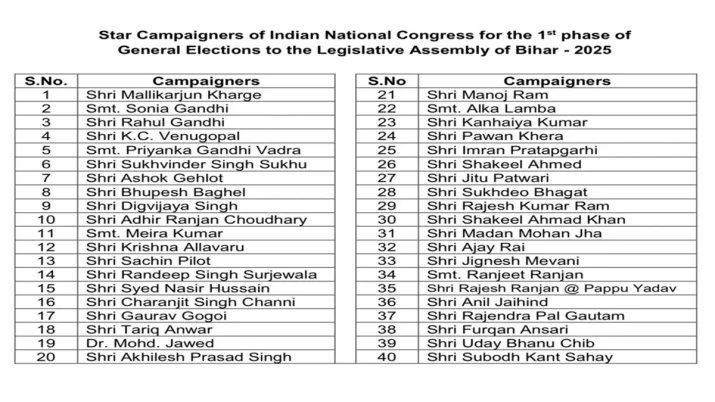 ಪಾಟ್ನಾ: ಬಿಹಾರದಲ್ಲಿ 2025 ರ ನಿರ್ಣಾಯಕ ವಿಧಾನಸಭಾ ಚುನಾವಣೆಗೆ ಸಜ್ಜಾಗುತ್ತಿರುವಂತೆಯೇ, ಕಾಂಗ್ರೆಸ್ ಪಕ್ಷವು ಭಾನುವಾರ (ಅಕ್ಟೋಬರ್ 26) ಮೊದಲ ಹಂತದ ಮತದಾನಕ್ಕಾಗಿ 40 ಸ್ಟಾರ್ ಪ್ರಚಾರಕರ ಅಧಿಕೃತ ಪಟ್ಟಿಯನ್ನು ಬಿಡುಗಡೆ ಮಾಡಿದೆ.