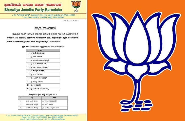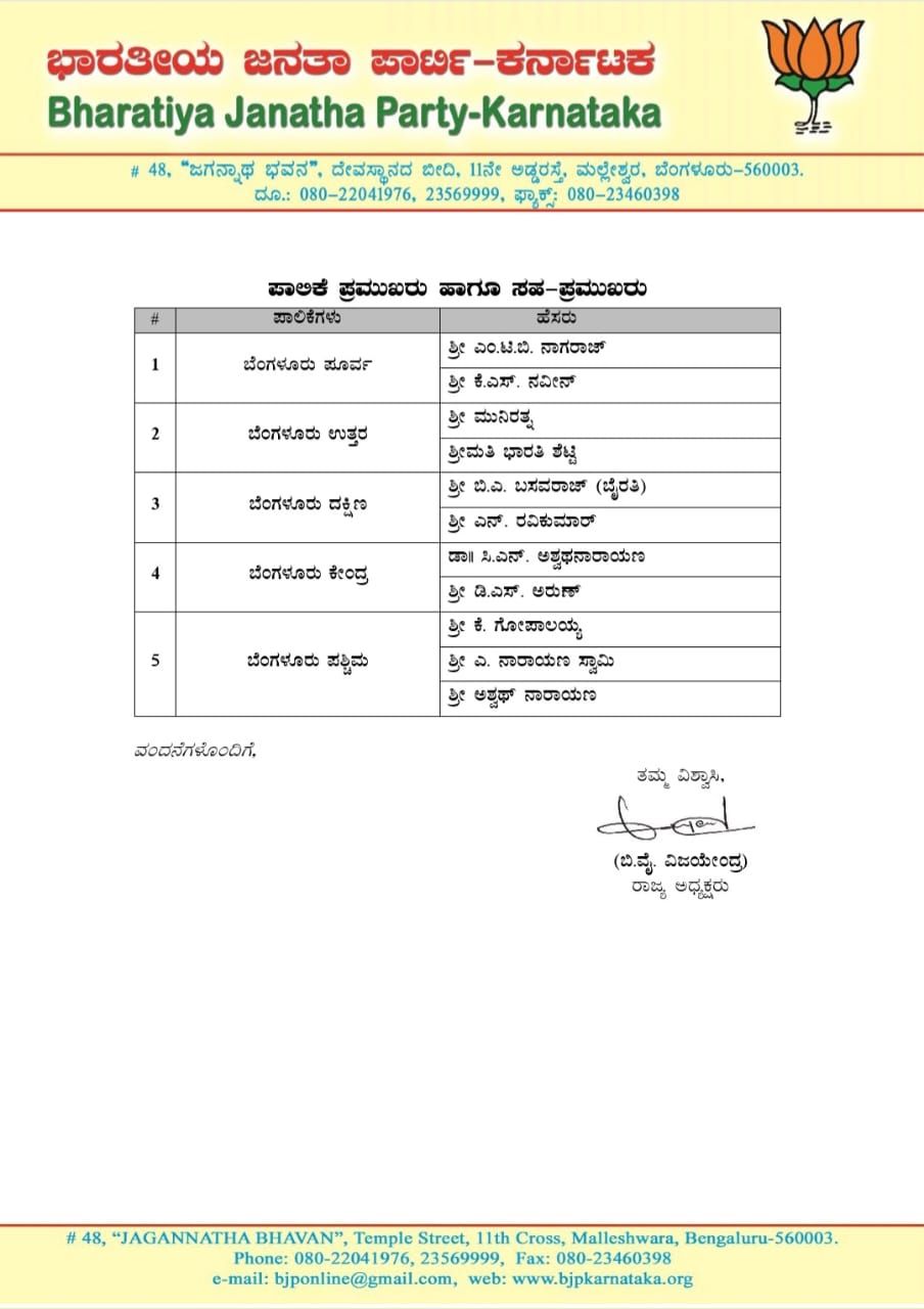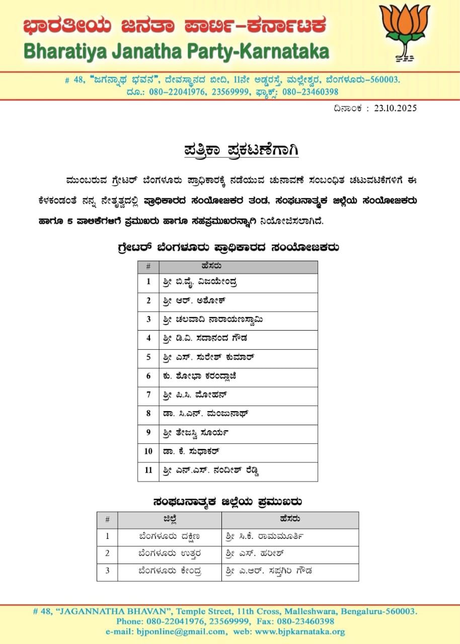 ಈ ಸಂಬಂಧ ರಾಜ್ಯಾಧ್ಯಕ್ಷ ಬಿವೈ ವಿಜಯೇಂದ್ರ ಪತ್ರಿಕಾ ಪ್ರಕಟಣೆಯಲ್ಲಿ ಮಾಹಿತಿ ನೀಡಿದ್ದು, ಮುಂಬರುವ ಗ್ರೇಟರ್ ಬೆಂಗಳೂರು ಪ್ರಾಧಿಕಾರಕ್ಕೆ ನಡೆಯುವ ಚುನಾವಣೆ ಸಂಬಂಧಿತ ಚಟುವಟಿಕೆಗಳಿಗೆ ಈ ಕೆಳಕಂಡಂತೆ ನನ್ನ ನೇತೃತ್ವದಲ್ಲಿ ಪ್ರಾಧಿಕಾರದ ಸಂಯೋಜಕರ ತಂಡ, ಸಂಘಟನಾತ್ಮಕ ಜಿಲ್ಲೆಯ ಸಂಯೋಜಕರು ಹಾಗೂ 5 ಪಾಲಿಕೆಗಳಿಗೆ ಪ್ರಮುಖರು ಹಾಗೂ ಸಹ ಪ್ರಮುಖರನ್ನಾಗಿ ನಿಯೋಜಿಸಿರುವುದಾಗಿ ತಿಳಿಸಿದ್ದಾರೆ.