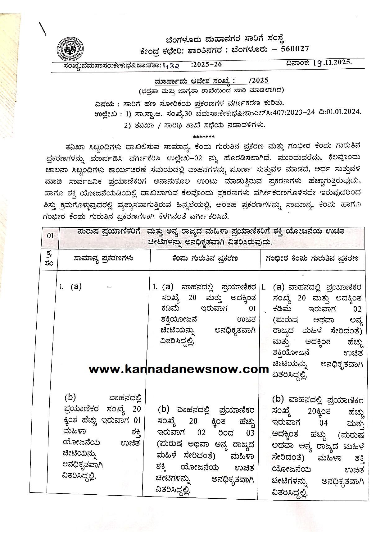ಬಿಎಂಟಿಸಿ ಬಸ್ಸಿನಲ್ಲಿ ಪ್ರಯಾಣಿಕರ ಸಂಖ್ಯೆ 20 ಮತ್ತು ಅದಕ್ಕಿಂತ ಕಡಿಮೆ ಇರುವಾಗ ಇಬ್ಬರು ಪುರುಷ ಅಥವಾ ಅನ್ಯ ರಾಜ್ಯದ ಮಹಿಳೆ ಸೇರಿದಂತೆ ಮತ್ತು ಅದಕ್ಕಿಂತ ಹೆಚ್ಚು ಶಕ್ತಿ ಯೋಜನೆ ಉಚಿತ ಚೀಟಿಯನ್ನು ಅನಧಿಕೃತವಾಗಿ ನೀಡಿದ್ದರೇ ಅದನ್ನು ಗಂಭೀರ ಕೆಂಪು ಗುರುತಿನ ಕೇಸ್ ಎಂಬುದಾಗಿ ಪರಿಗಣಿಸುವುದಾಗಿ ತಿಳಿಸಿದೆ.