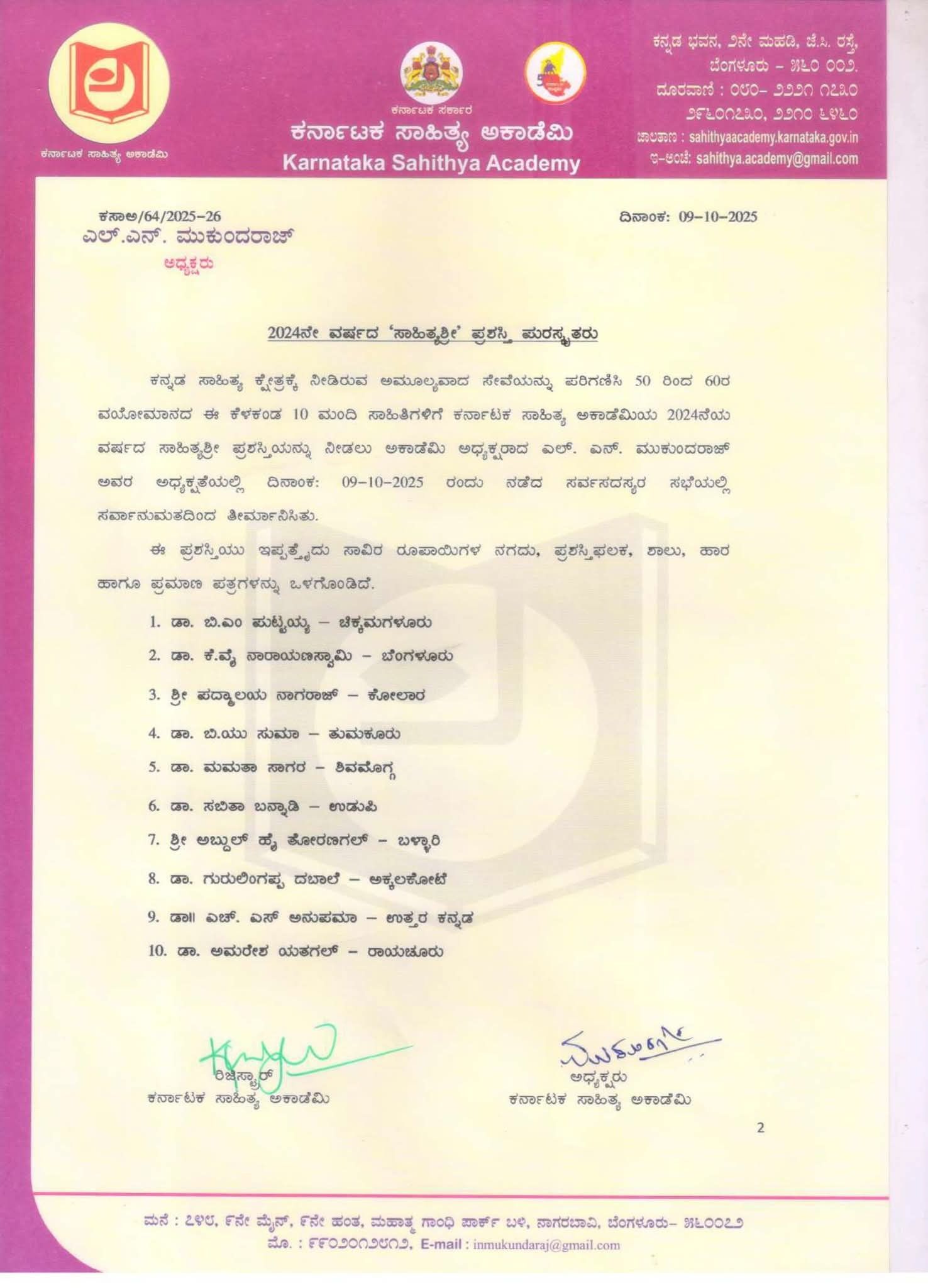 ಕನ್ನಡ ಸಾಹಿತ್ಯ ಕ್ಷೇತ್ರಕ್ಕೆ ನೀಡಿರುವ ಅಮೂಲ್ಯವಾದ ಸೇವೆಯನ್ನು ಪರಿಗಣಿಸಿ 50 ರಿಂದ 60ರ ವಯೋಮಾನದ ಈ ಕೆಳಕಂಡ 10 ಮಂದಿ ಸಾಹಿತಿಗಳಿಗೆ ಕರ್ನಾಟಕ ಸಾಹಿತ್ಯ ಅಕಾಡೆಮಿಯ 2024ನೆಯ ವರ್ಷದ ಸಾಹಿತ್ಯಶ್ರೀ ಪ್ರಶಸ್ತಿಯನ್ನು ನೀಡಲು ಅಕಾಡೆಮಿ ಅಧ್ಯಕ್ಷರಾದ ಎಲ್. ಎನ್. ಮುಕುಂದರಾಜ್ ಅವರ ಅಧ್ಯಕ್ಷತೆಯಲ್ಲಿ ದಿನಾಂಕ: 09-10-2025 ರಂದು ನಡೆದ ಸರ್ವಸದಸ್ಯರ ಸಭೆಯಲ್ಲಿ ಸರ್ವಾನುಮತದಿಂದ ತೀರ್ಮಾನಿಸಿತು.