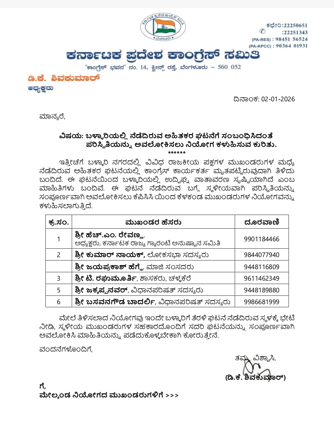 ಇತ್ತೀಚೆಗೆ ಬಳ್ಳಾರಿ ನಗರದಲ್ಲಿ ವಿವಿಧ ರಾಜಕೀಯ ಪಕ್ಷಗಳ ಮುಖಂಡರುಗಳ ಮಧ್ಯೆ ನೆಡೆದಿರುವ ಅಹಿತಕರ ಘಟನೆಯಲ್ಲಿ ಕಾಂಗ್ರೆಸ್ ಕಾರ್ಯಕರ್ತ ಮೃತಪಟ್ಟಿರುವುದಾಗಿ ತಿಳಿದು ಬಂದಿದೆ. ಈ ಘಟನೆಯಿಂದ ಬಳ್ಳಾರಿಯಲ್ಲಿ ಉದ್ವಿಘ್ನ ವಾತಾವರಣ ಸೃಷ್ಟಿಯಾಗಿದೆ ಎಂಬ ಮಾಹಿತಿಗಳು ಬಂದಿವೆ. ಈ ಘಟನೆ ನೆಡೆದಿರುವ ಬಗ್ಗೆ ಸ್ಥಳೀಯವಾಗಿ ಪರಿಸ್ಥಿತಿಯನ್ನು ಸಂಪೂರ್ಣವಾಗಿ ಅವಲೋಕಿಸಲು ಕೆಪಿಸಿಸಿ ಯಿಂದ ಕೆಳಕಂಡ ಮುಖಂಡರುಗಳ ನಿಯೋಗವನ್ನು ಕಳುಹಿಸಲಾಗುತ್ತಿದೆ.
