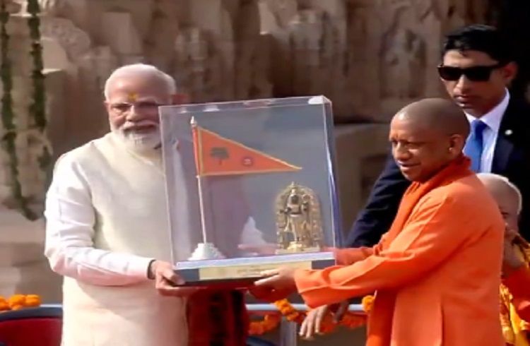 ಧರ್ಮ ಧ್ವಜಾರೋಹಣ ನೆರವೇರಿಸಿದ ಪ್ರಧಾನಿ ಮೋದಿಗೆ ಉತ್ತರ ಪ್ರದೇಶ ಯೋಗಿ ಆದಿತ್ಯನಾಥ್ ಉಡುಗೊರೆ ನೀಡಿದ್ದಾರೆ. ಉತ್ತರ ಪ್ರದೇಶ ಸಿಎಂ ಯೋಗಿ ಆದಿತ್ಯನಾಥ್ ಅವರು ಶ್ರೀ ರಾಮ ಜನ್ಮಭೂಮಿ ಮಂದಿರದ ‘ಶಿಖರ್’ ಮತ್ತು ದೇವಾಲಯದ ರಾಮಲಲ್ಲಾ ವಿಗ್ರಹದ ಮೇಲೆ ವಿಧ್ಯುಕ್ತವಾಗಿ ಹಾರಿಸಲಾದ ಕೇಸರಿ ಧ್ವಜದ ಚಿಕಣಿ ಮಾದರಿಗಳನ್ನು ಪ್ರಧಾನಿ ನರೇಂದ್ರ ಮೋದಿ ಮತ್ತು ಆರ್ಎಸ್ಎಸ್ ಸರ್ಸಂಘಚಾಲಕ್ ಮೋಹನ್ ಭಾಗವತ್ ಅವರಿಗೆ ಉಡುಗೊರೆಯಾಗಿ ನೀಡಿದರು.