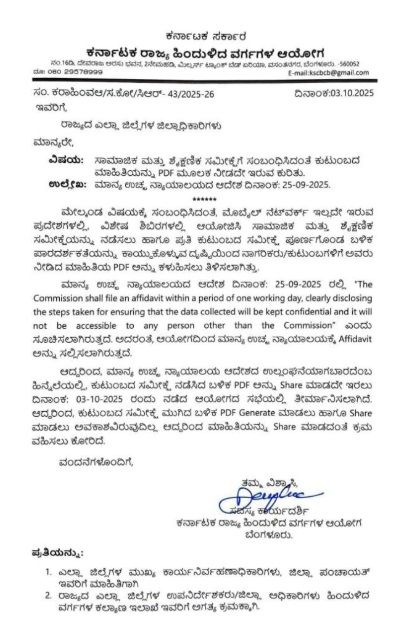 ಆದ್ದರಿಂದ, ಮಾನ್ಯ ಉಚ್ಚ ನ್ಯಾಯಾಲಯ ಆದೇಶದ ಉಲ್ಲಂಘನೆಯಾಗಬಾರದೆಂಬ ಹಿನ್ನೆಲೆಯಲ್ಲಿ, ಕುಟುಂಬದ ಸಮೀಕ್ಷೆ ನಡೆಸಿದ ಬಳಿಕ PDF ಅನ್ನು Share ಮಾಡದೇ ಇರಲು ದಿನಾಂಕ: 03-10-2025 ರಂದು ನಡೆದ ಆಯೋಗದ ಸಭೆಯಲ್ಲಿ ತೀರ್ಮಾನಿಸಲಾಗಿದೆ. ಆದ್ದರಿಂದ, ಕುಟುಂಬದ ಸಮೀಕ್ಷೆ ಮುಗಿದ ಬಳಿಕ PDF Generate ಮಾಡಲು ಹಾಗೂ Share ಮಾಡಲು ಅವಕಾಶವಿರುವುದಿಲ್ಲ ಆದ್ದರಿಂದ ಮಾಹಿತಿಯನ್ನು Share ಮಾಡದಂತೆ ಕ್ರಮ ವಹಿಸಲು ಕೋರಿದೆ.