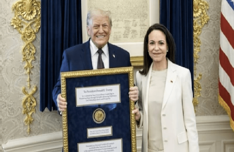 ಮಚಾದೊ ಅವರು ಟ್ರಂಪ್ ಅವರನ್ನು ಶ್ವೇತಭವನದಲ್ಲಿ ಭೇಟಿಯಾದರು. ವಾಷಿಂಗ್ಟನ್ನಲ್ಲಿ ಸುದ್ದಿಗಾರರೊಂದಿಗೆ ಮಾತನಾಡಿದ ಮಚಾದೊ, ಅಧ್ಯಕ್ಷ ಟ್ರಂಪ್ಗೆ ಪುರಸ್ಕಾರ ಪ್ರಧಾನ ಮಾಡಿರುವುದಾಗಿ ಹೇಳಿದರು. ಟ್ರಂಪ್ ಅದನ್ನು ಸ್ವೀಕರಿಸಿದ್ದಾರೆಯೇ ಎಂದು ಅವರು ಹೇಳಲಿಲ್ಲ. ಈ ವಿಷಯದ ಕುರಿತು ಹೆಚ್ಚಿನ ಪ್ರಶ್ನೆಗಳಿಗೆ ಉತ್ತರಿಸಲು ಮಚಾದೊ ನಿರಾಕರಿಸಿದರು. ವೆನೆಜುವೆಲಾದ ಸ್ವಾತಂತ್ರ್ಯಕ್ಕೆ ಅವರ ವಿಶೇಷ ಕೊಡುಗೆಗಾಗಿ ಪುರಸ್ಕಾರವನ್ನು ಅವರಿಗೆ ಅರ್ಪಿಸಿದ್ದೇನೆ ಎಂದಷ್ಟೇ ಹೇಳಿದ್ದಾರೆ.