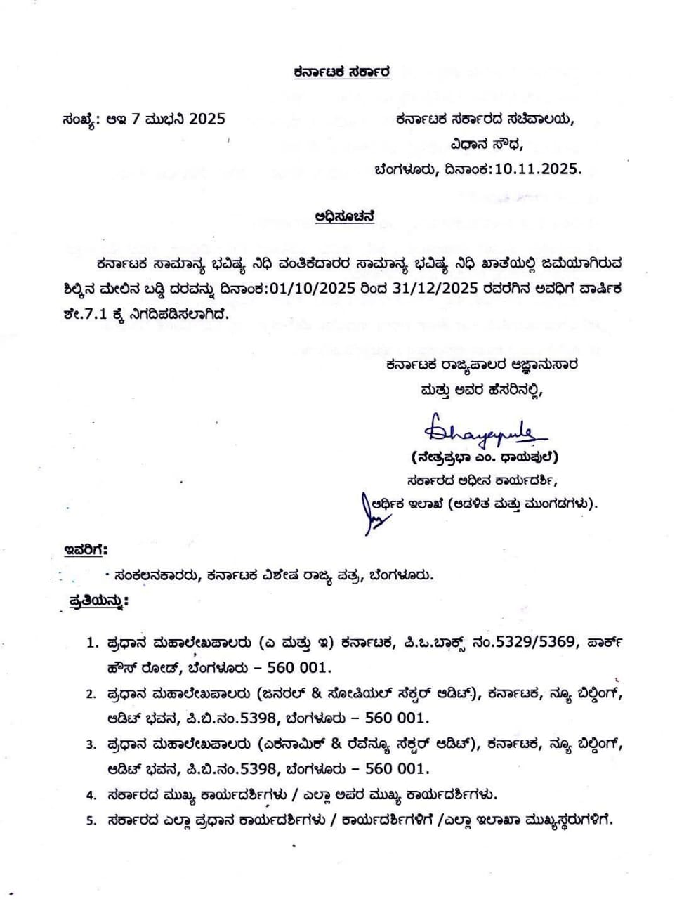 ಬೆಂಗಳೂರು : ಕರ್ನಾಟಕ ಸಾಮಾನ್ಯ ಭವಿಷ್ಯ ನಿಧಿ ವಂತಿಕೆದಾರರ ಸಾಮಾನ್ಯ ಭವಿಷ್ಯ ನಿಧಿ ಖಾತೆಯಲ್ಲಿ ಜಮೆಯಾಗಿರುವ ಶಿಲ್ಕಿನ ಮೇಲಿನ ಬಡ್ಡಿ ದರವನ್ನು ದಿನಾಂಕ: 01-10-2025 ರಿಂದ ದಿನಾಂಕ: 31-12-2025 ರವರೆಗಿನ ಅವಧಿಗೆ ವಾರ್ಷಿಕ ಶೇ 7.1 ಕ್ಕೆ ನಿಗದಿಪಡಿಸಿ ರಾಜ್ಯ ಸರ್ಕಾರ ಆದೇಶ ಹೊರಡಿಸಿದೆ. BREAKING: Karnataka `Bhavishya Nidhi' depositors. 7.1 percent `interest rate' fixed: State government orders.!