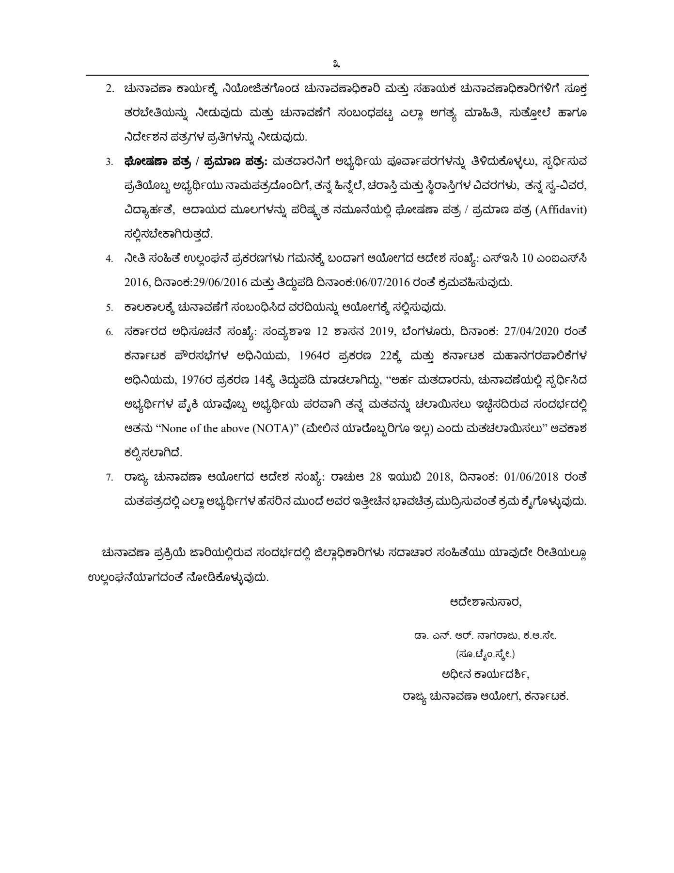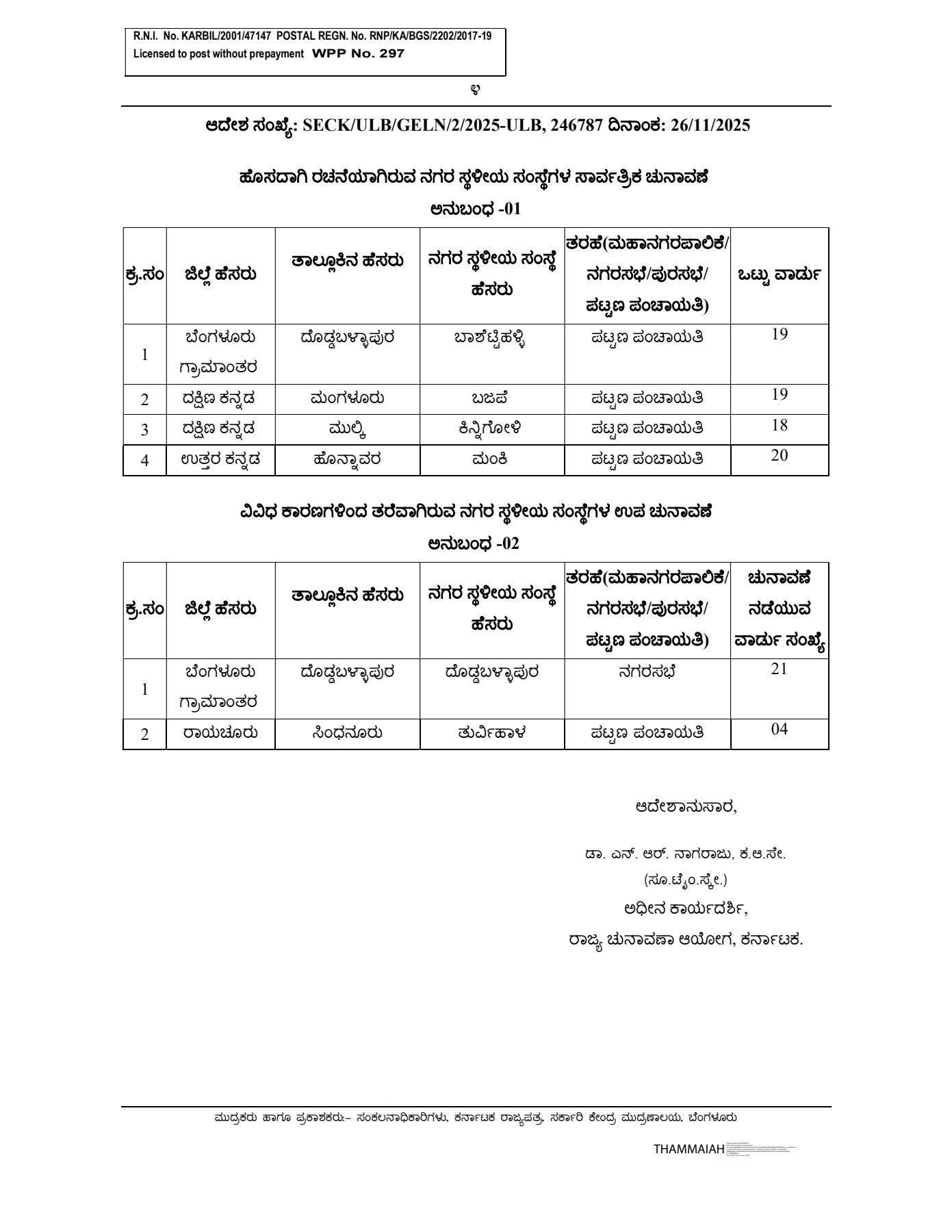 ರಾಜ್ಯ ಚುನಾವಣಾ ಆಯೋಗವು ಸಂವಿಧಾನದ ಪರಿಚ್ಛೇದ 243-ಜೆಡ್ ರಲ್ಲಿ ಪ್ರದತ್ತವಾದ ಅಧಿಕಾರದ ಮೇರೆಗೆ ಕರ್ನಾಟಕ ಪೌರಸಭೆಗಳ ಅಧಿನಿಯಮ, 1964 ರ ಪ್ರಕರಣ 17 ಮತ್ತು 19 ಹಾಗೂ ಕರ್ನಾಟಕ ಪೌರಸಭೆಗಳ (ಕೌನ್ಸಿಲರುಗಳ ಚುನಾವಣೆ) ನಿಯಮಗಳು, 1977ರ ನಿಯಮ 3(1) ರನ್ವಯ ಅನುಬಂಧ-01 ರಲ್ಲಿ ಹೆಸರಿಸಲಾದ ಹೊಸದಾಗಿ ರಚನೆಯಾಗಿರುವ 04 ಪಟ್ಟಣ ಪಂಚಾಯತಿಗಳಿಗೆ ಸಾರ್ವತ್ರಿಕ ಚುನಾವಣೆಯನ್ನು ಹಾಗೂ ನಗರ ಸ್ಥಳೀಯ ಸಂಸ್ಥೆಗಳಲ್ಲಿ ವಿವಿಧ ಕಾರಣಗಳಿಂದ ತೆರವಾಗಿರುವ ಅನುಬಂಧ -02 ರಲ್ಲಿ ಹೆಸರಿಸಲಾದ ವಾರ್ಡುಗಳಿಗೆ ಉಪ ಚುನಾವಣೆಯನ್ನು ಈ ಕೆಳಕಂಡ ಚುನಾವಣಾ ವೇಳಾಪಟ್ಟಿಯನುಸಾರ ನಡೆಸಲು ಆದೇಶಿಸಲಾಗಿದೆ.