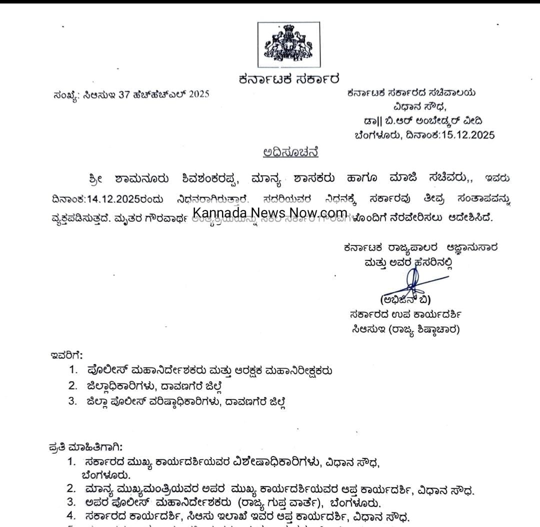 ಶಾಮನೂರು ಶಿವಶಂಕರಪ್ಪ, ಮಾನ್ಯ ಶಾಸಕರು ಹಾಗೂ ಮಾಜಿ ಸಚಿವರು,, ಇವರು ದಿನಾಂಕ:14.12.2025ರಂದು ನಿಧನರಾಗಿರುತ್ತಾರೆ. ಸದರಿಯವರ ನಿಧನಕ್ಕೆ ಸರ್ಕಾರವು ತೀವ್ರ ಸಂತಾಪವನ್ನು ವ್ಯಕ್ತಪಡಿಸುತ್ತದೆ. ಮೃತರ ಗೌರವಾರ್ಥ ಅಂತ್ಯಕ್ರಿಯೆಯನ್ನು ಸಕಲ ಸರ್ಕಾರಿ ಗೌರವಗಳೊಂದಿಗೆ ನೆರವೇರಿಸಲು ಆದೇಶಿಸಿದೆ.