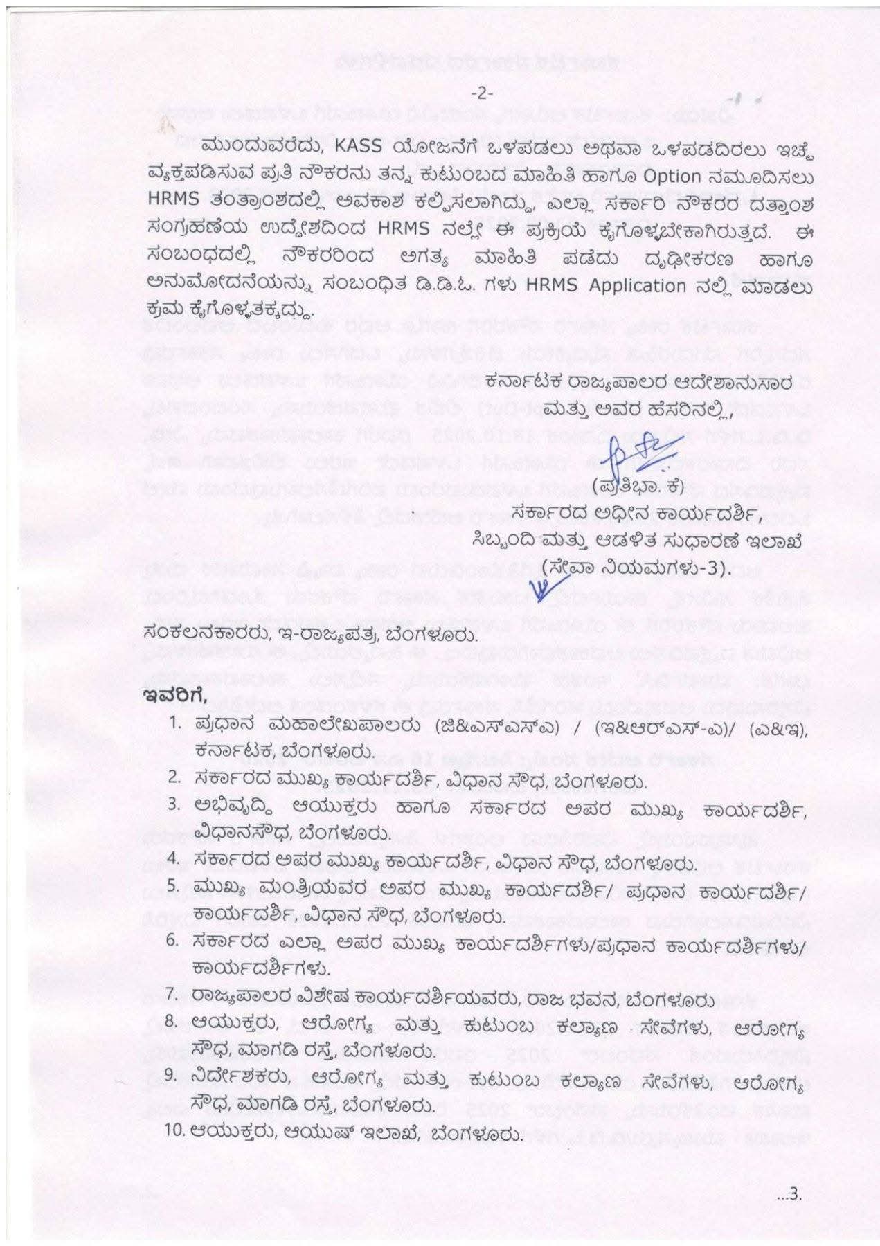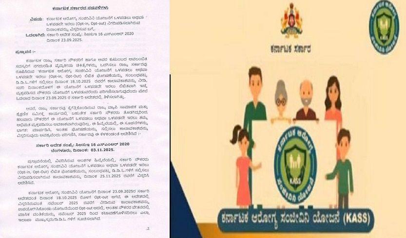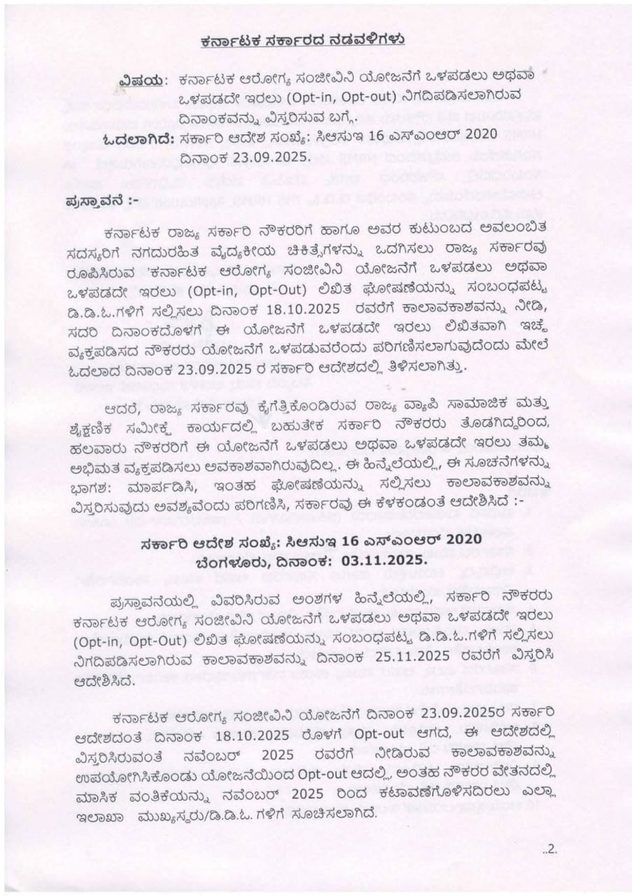 ಪ್ರಸ್ತಾವನೆಯಲ್ಲಿ ವಿವರಿಸಿರುವ ಅಂಶಗಳ ಹಿನ್ನೆಲೆಯಲ್ಲಿ, ಸರ್ಕಾರಿ ನೌಕರರು ಕರ್ನಾಟಕ ಆರೋಗ್ಯ ಸಂಜೀವಿನಿ ಯೋಜನೆಗೆ ಒಳಪಡಲು ಅಥವಾ ಒಳಪಡದೇ ಇರಲು (Opt-in, Opt-out) ಲಿಖಿತ ಘೋಷಣೆಯನ್ನು ಸಂಬಂಧಪಟ್ಟ ಡಿ.ಡಿ.ಓ.ಗಳಿಗೆ ಸಲ್ಲಿಸಲು ನಿಗದಿಪಡಿಸಲಾಗಿರುವ ಕಾಲಾವಕಾಶವನ್ನು ದಿನಾಂಕ 25.11.2025 ರವರೆಗೆ ವಿಸ್ತರಿಸಿ ಆದೇಶಿಸಿದೆ.