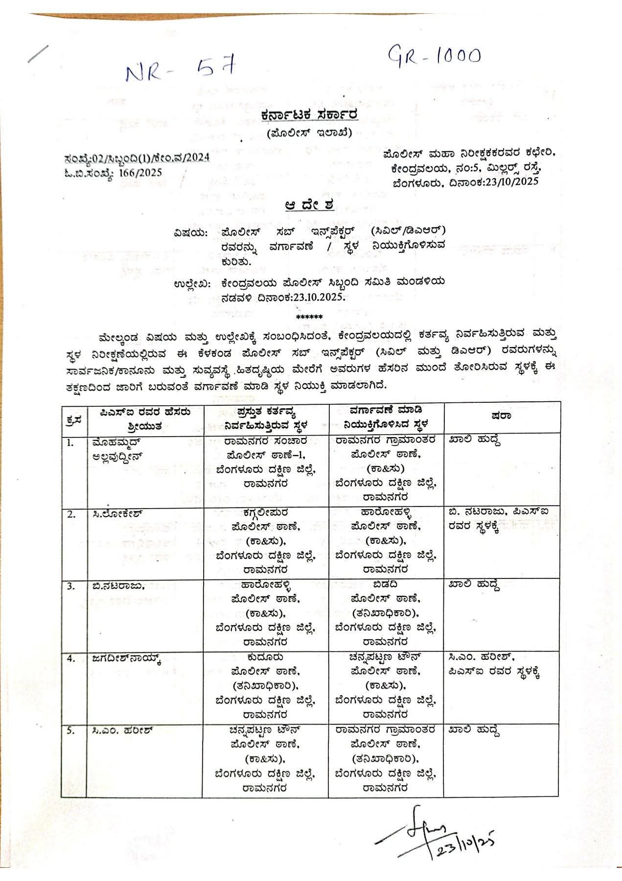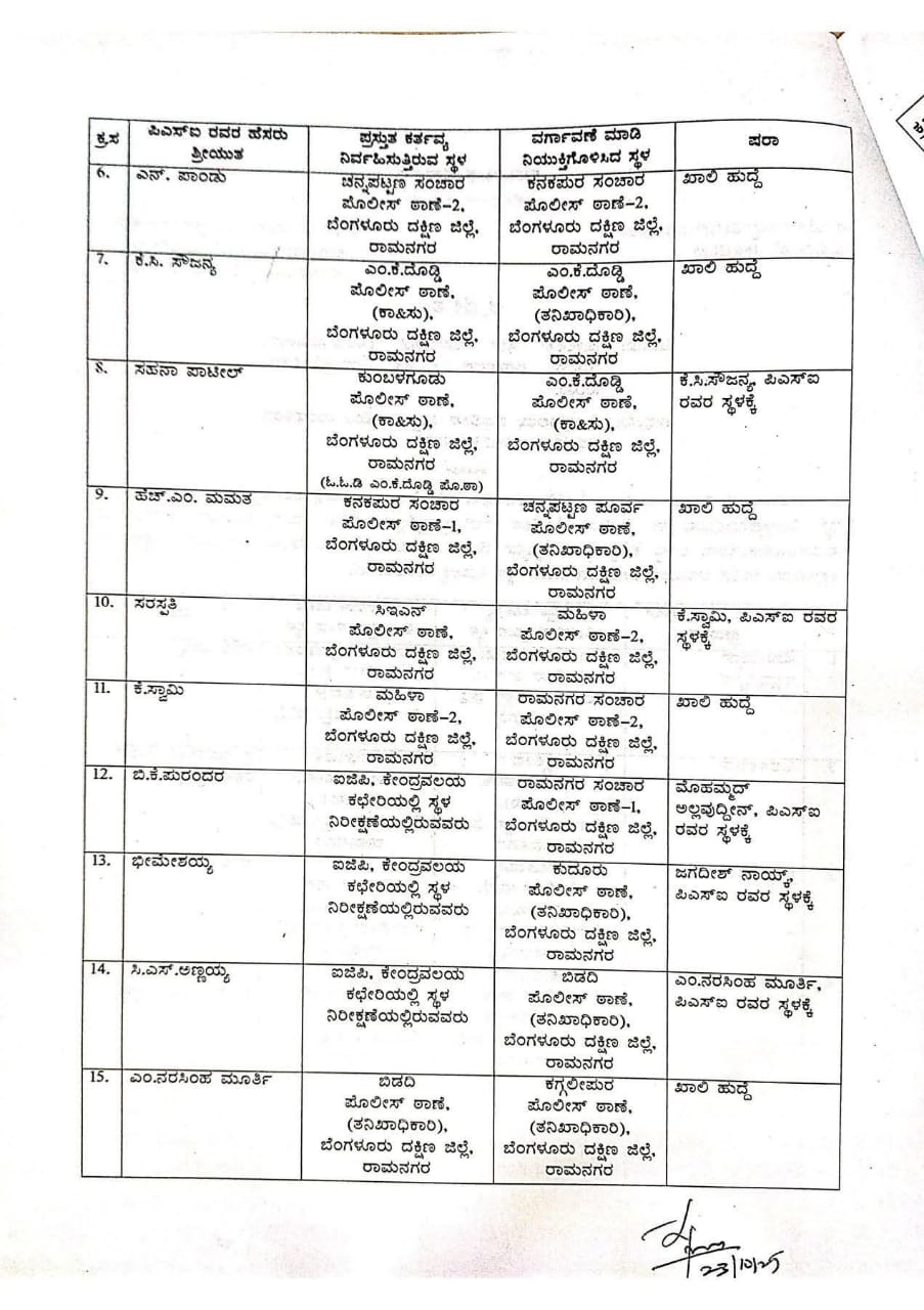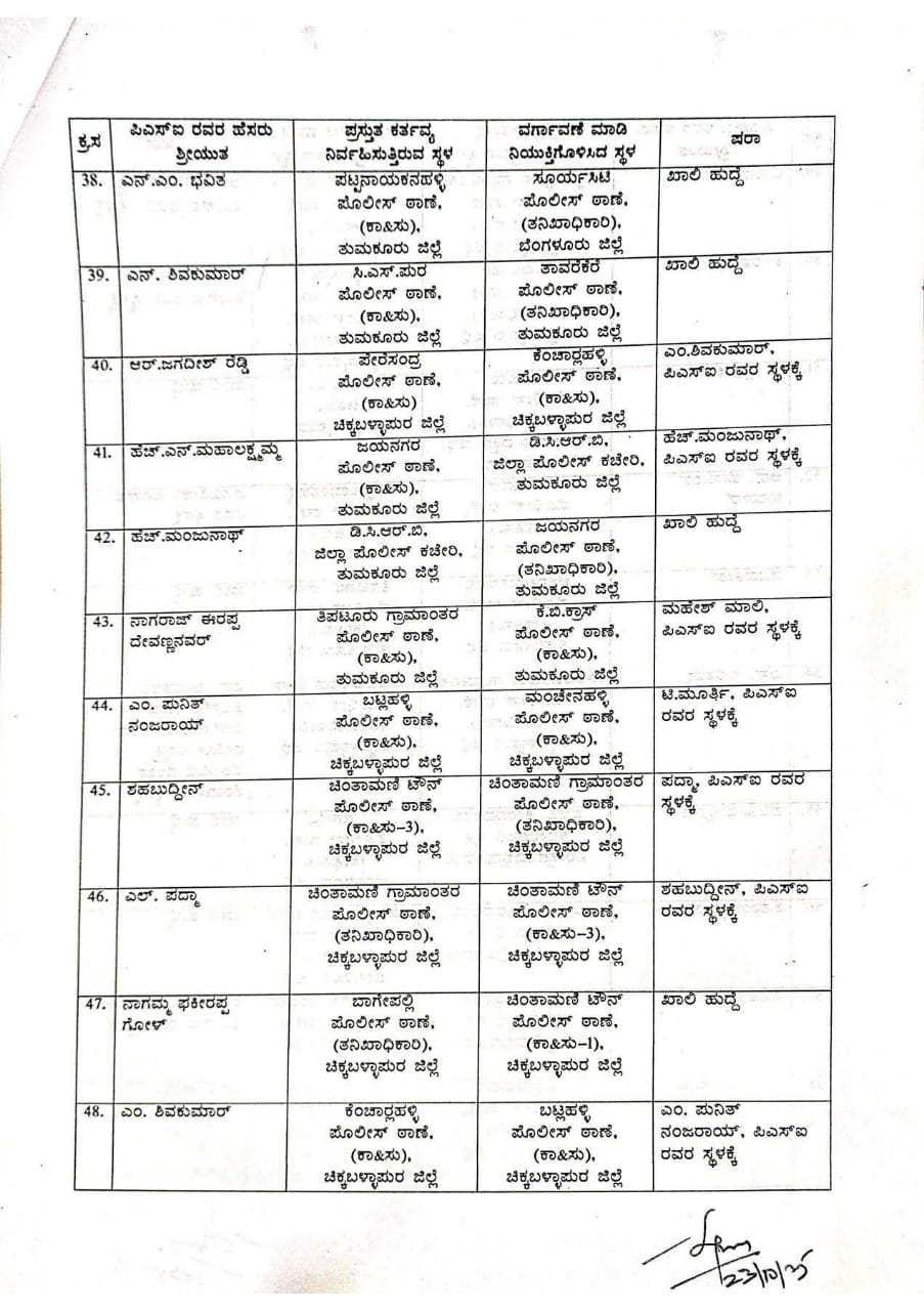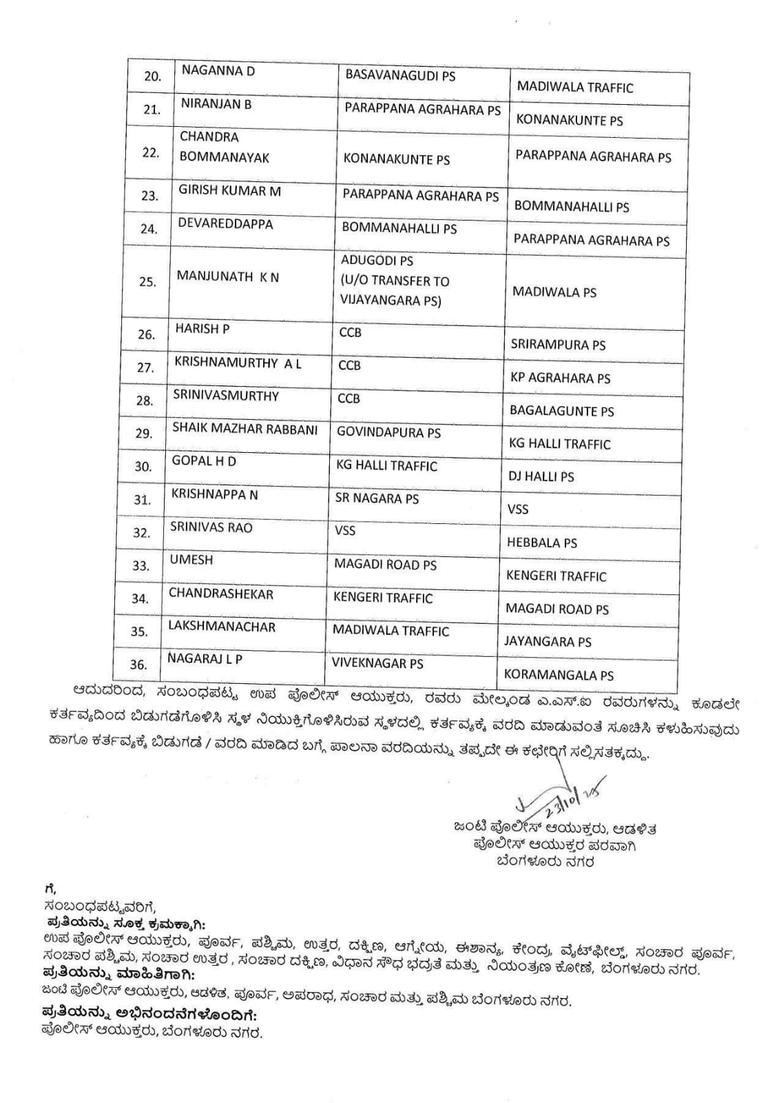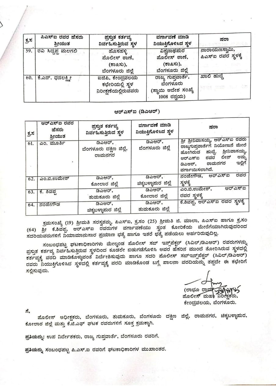 ಮೇಲ್ಕಂಡ ವಿಷಯ ಮತ್ತು ಉಲ್ಲೇಖಕ್ಕೆ ಸಂಬಂಧಿಸಿದಂತೆ, ಕೇಂದ್ರವಲಯದಲ್ಲಿ ಕರ್ತವ್ಯ ನಿರ್ವಹಿಸುತ್ತಿರುವ ಮತ್ತು ಸ್ಥಳ ನಿರೀಕ್ಷಣೆಯಲ್ಲಿರುವ ಈ ಕೆಳಕಂಡ ಪೊಲೀಸ್ ಸಬ್ ಇನ್ಸ್ಪೆಕ್ಟರ್ (ಸಿವಿಲ್ ಮತ್ತು ಡಿಎಆರ್) ರವರುಗಳನ್ನು ಸಾರ್ವಜನಿಕ/ಕಾನೂನು ಮತ್ತು ಸುವ್ಯವಸ್ಥೆ ಹಿತದೃಷ್ಠಿಯ ಮೇರೆಗೆ ಅವರುಗಳ ಹೆಸರಿನ ಮುಂದೆ ತೋರಿಸಿರುವ ಸ್ಥಳಕ್ಕೆ ಈ ತಕ್ಷಣದಿಂದ ಜಾರಿಗೆ ಬರುವಂತೆ ವರ್ಗಾವಣೆ ಮಾಡಿ ಸ್ಥಳ ನಿಯುಕ್ತಿ ಮಾಡಲಾಗಿದೆ.