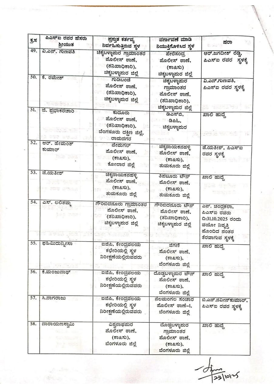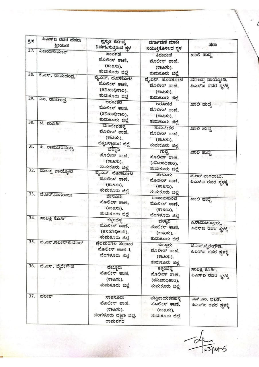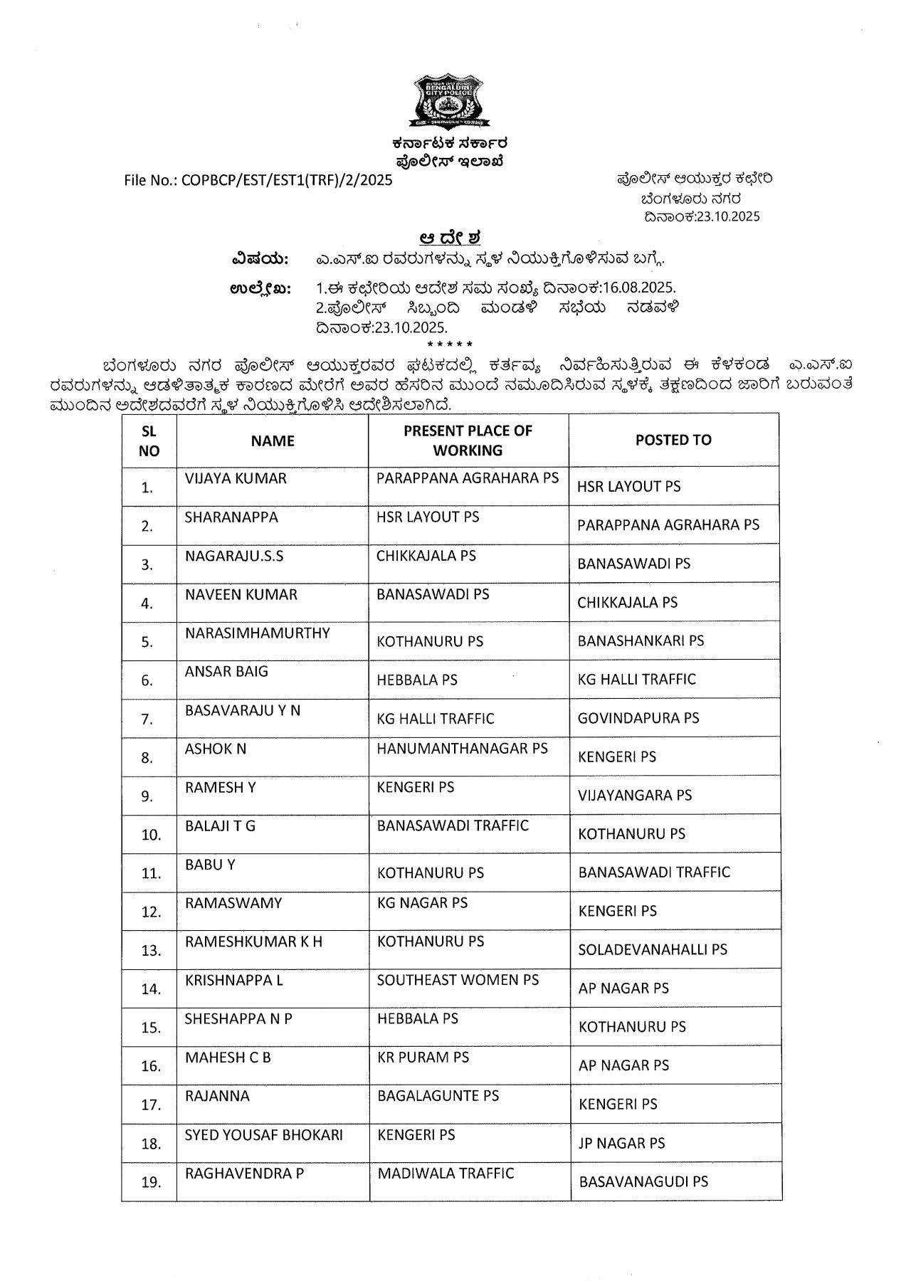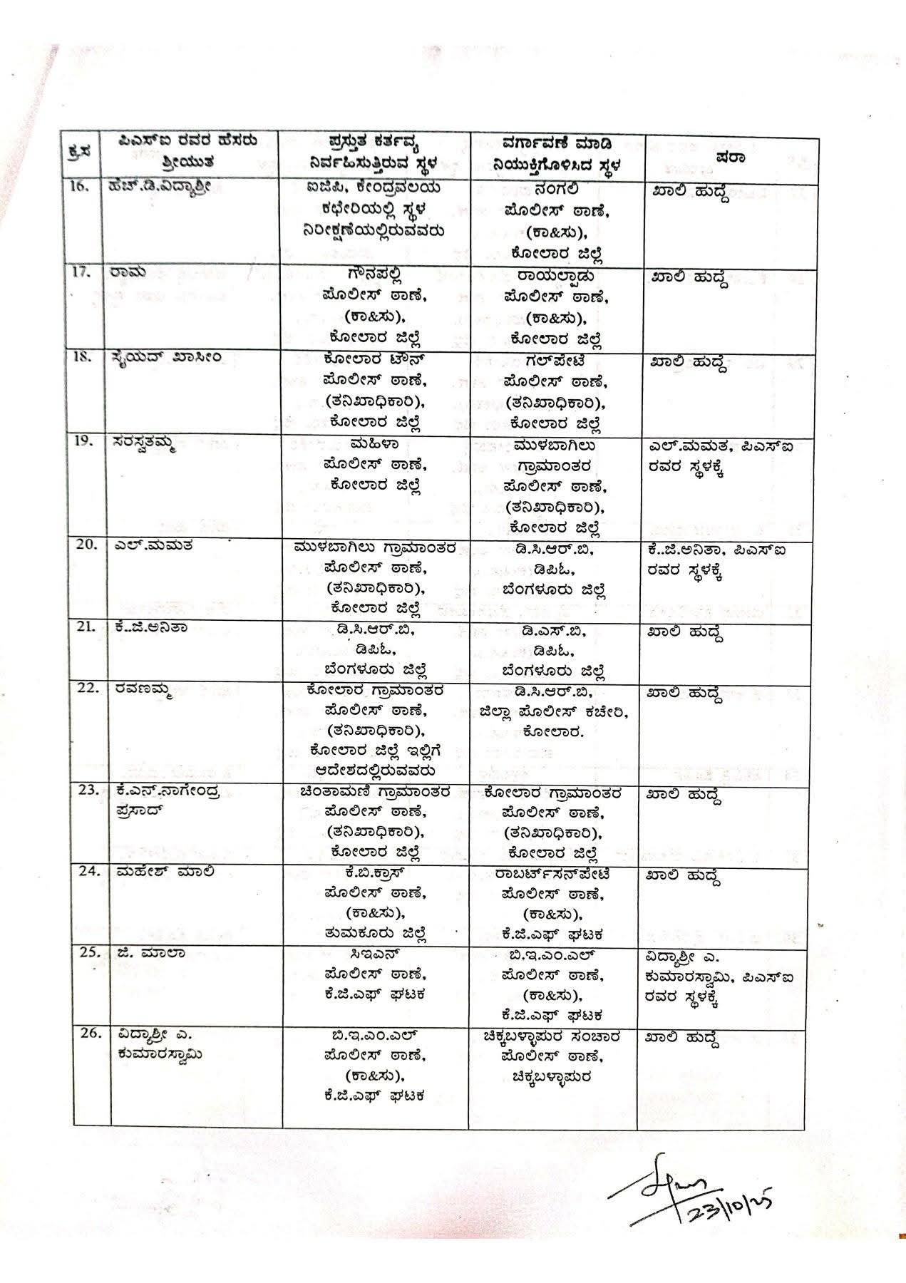 ಮೇಲ್ಕಂಡ ವಿಷಯ ಮತ್ತು ಉಲ್ಲೇಖಕ್ಕೆ ಸಂಬಂಧಿಸಿದಂತೆ, ಕೇಂದ್ರವಲಯದಲ್ಲಿ ಕರ್ತವ್ಯ ನಿರ್ವಹಿಸುತ್ತಿರುವ ಮತ್ತು ಸ್ಥಳ ನಿರೀಕ್ಷಣೆಯಲ್ಲಿರುವ ಈ ಕೆಳಕಂಡ ಪೊಲೀಸ್ ಸಬ್ ಇನ್ಸ್ಪೆಕ್ಟರ್ (ಸಿವಿಲ್ ಮತ್ತು ಡಿಎಆರ್) ರವರುಗಳನ್ನು ಸಾರ್ವಜನಿಕ/ಕಾನೂನು ಮತ್ತು ಸುವ್ಯವಸ್ಥೆ ಹಿತದೃಷ್ಠಿಯ ಮೇರೆಗೆ ಅವರುಗಳ ಹೆಸರಿನ ಮುಂದೆ ತೋರಿಸಿರುವ ಸ್ಥಳಕ್ಕೆ ಈ ತಕ್ಷಣದಿಂದ ಜಾರಿಗೆ ಬರುವಂತೆ ವರ್ಗಾವಣೆ ಮಾಡಿ ಸ್ಥಳ ನಿಯುಕ್ತಿ ಮಾಡಲಾಗಿದೆ.