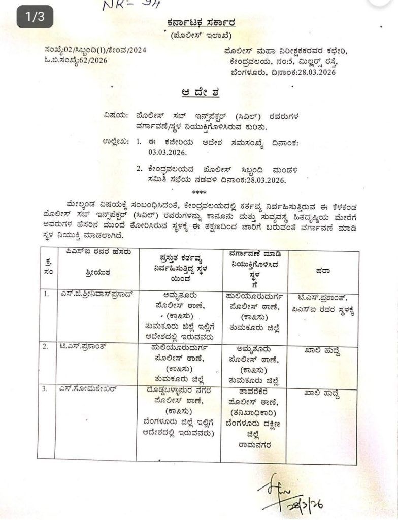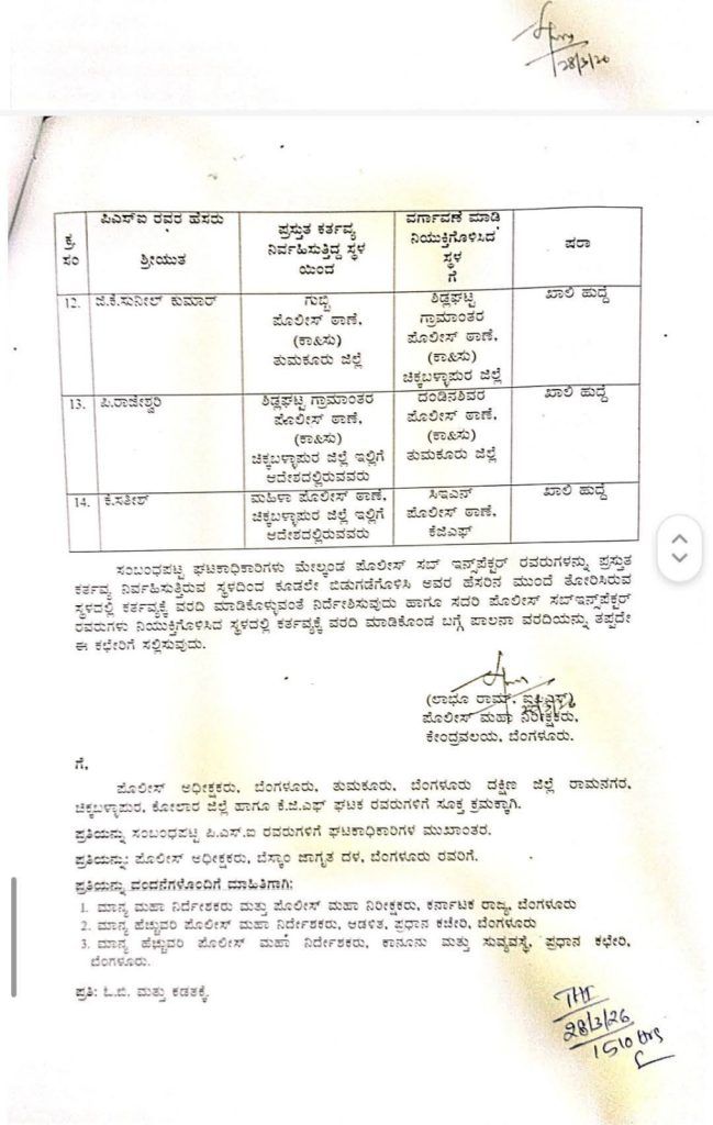 ಮಾರ್ಚ್ 28 ರಂದು ಹೊರಬಿದ್ದಿರುವ ಈ ಆದೇಶದ ಅನ್ವಯ, ತುಮಕೂರು, ಬೆಂಗಳೂರು ಗ್ರಾಮಾಂತರ, ಚಿಕ್ಕಬಳ್ಳಾಪುರ ಮತ್ತು ರಾಮನಗರ ಜಿಲ್ಲೆಗಳ ವಿವಿಧ ಪೊಲೀಸ್ ಠಾಣೆಗಳ ಪಿಎಸ್ಐಗಳನ್ನು ಸ್ಥಳಾಂತರಿಸಲಾಗಿದೆ. ವರ್ಗಾವಣೆಗೊಂಡ ಪ್ರಮುಖ ಅಧಿಕಾರಿಗಳ ಪಟ್ಟಿ ಈ ಕೆಳಗಿನಂತಿದೆ: