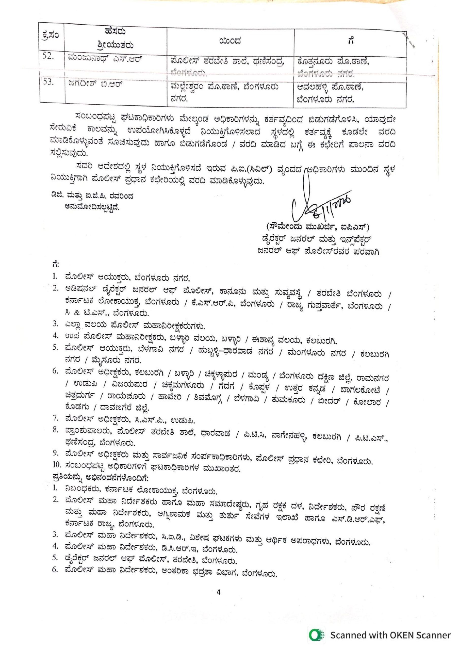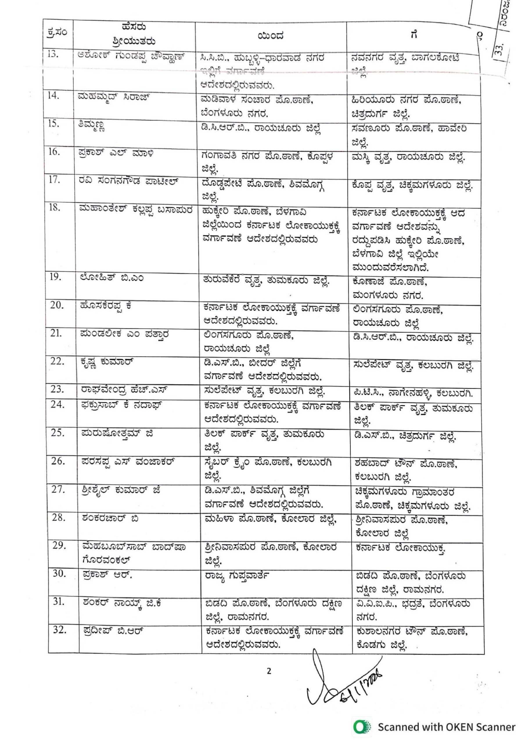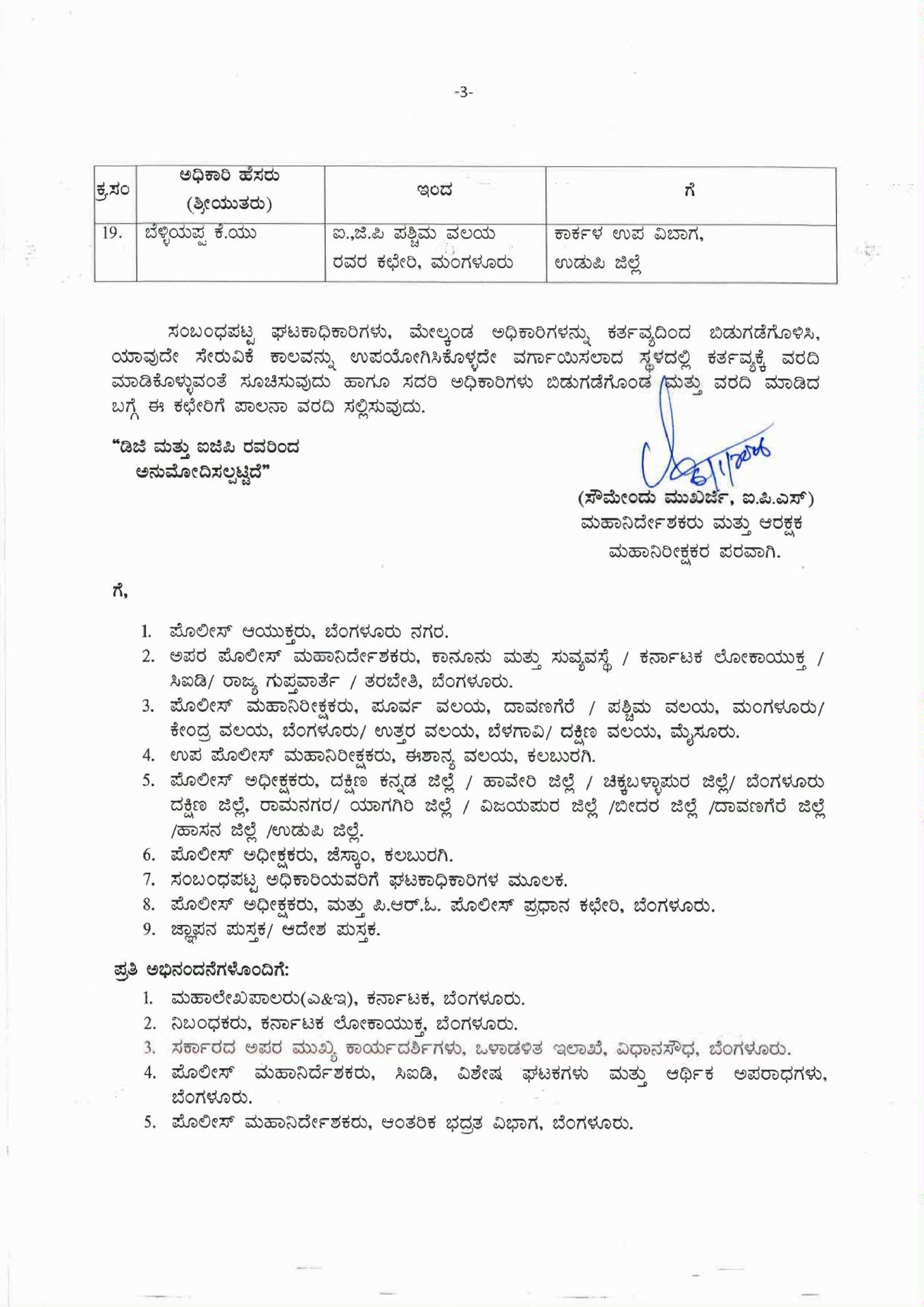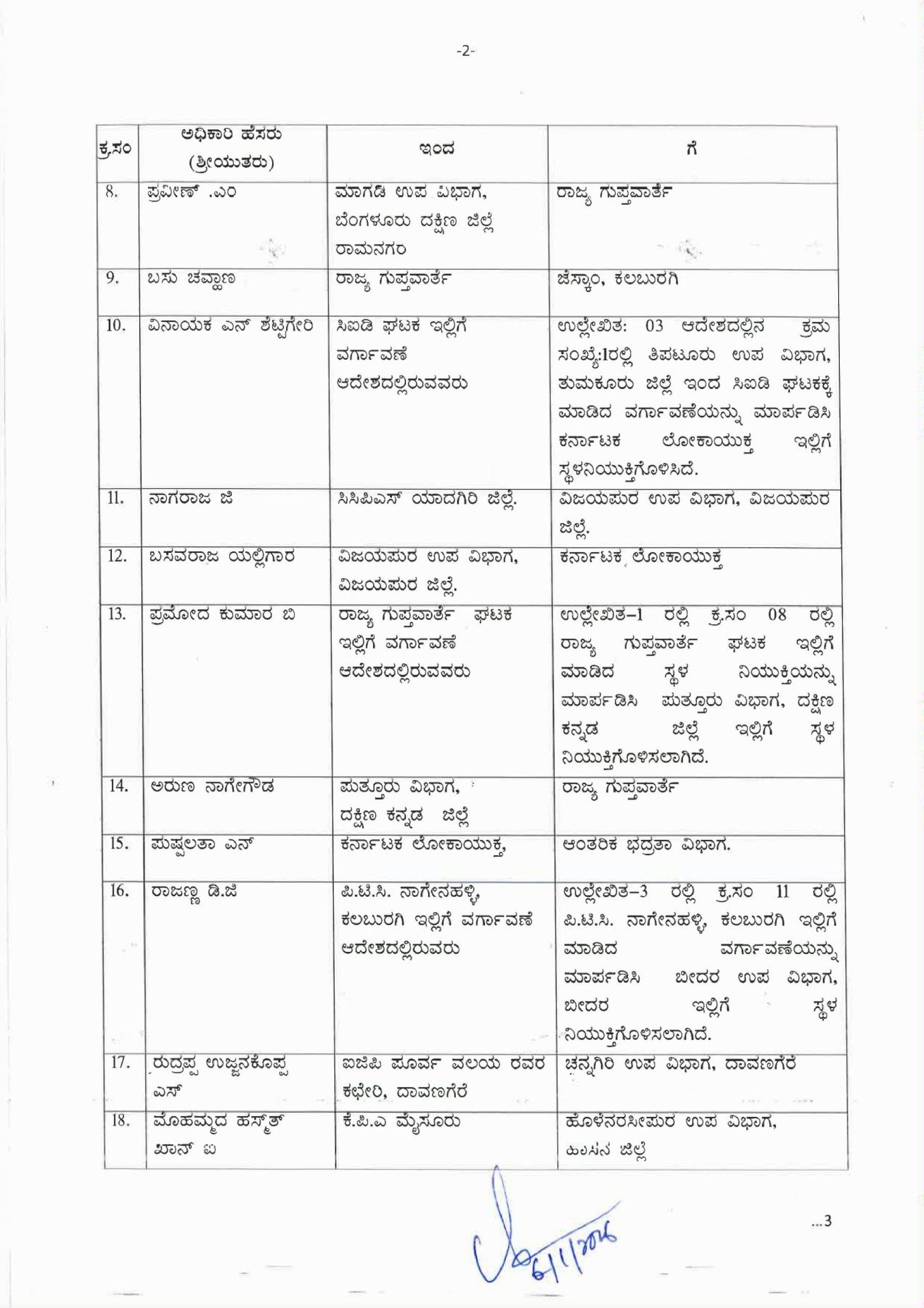 ತುಮಕೂರಿನ ತುರುವೆಕೆರೆ ವೃತ್ತದಿಂದ ಲೋಹಿತ್ ಬಿ.ಎಂ ಅವರನ್ನು ಮಂಗಳೂರಿನ ಕೊಣಾದೆ ಪೊಲೀಸ್ ಠಾಣೆಗೆ, ಕೃಷ್ಣ ಕುಮಾರ್ ಅವರನ್ನು ಕಲಬುರ್ಗಿಯ ಸುಲೆಪೇಟ್ ವೃತ್ತಕ್ಕೆ, ಪುರುಷೋತ್ತಮ್ ಜಿ ಅವರನ್ನು ಚಿತ್ರದುರ್ಗ ಡಿಎಸ್ ಬಿಗೆ ವರ್ಗಾವಣೆ ಮಾಡಲಾಗಿದೆ.