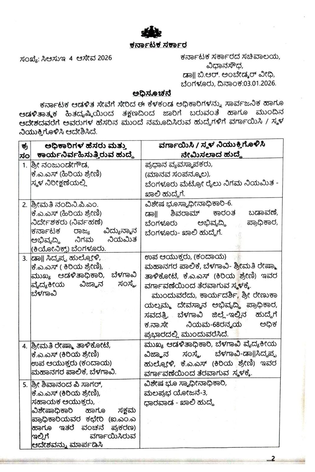 ಕರ್ನಾಟಕ ಆಡಳಿತ ಸೇವೆಗೆ ಸೇರಿದ ಈ ಕೆಳಕಂಡ ಅಧಿಕಾರಿಗಳನ್ನು ಸಾರ್ವಜನಿಕ ಹಾಗೂ ಆಡಳಿತಾತ್ಮಕ ಹಿತದೃಷ್ಠಿಯಿಂದ ತಕ್ಷಣದಿಂದ ಜಾರಿಗೆ ಬರುವಂತೆ ಹಾಗೂ ಮುಂದಿನ ಆದೇಶದವರೆಗೆ ಅವರುಗಳ ಹೆಸರಿನ ಮುಂದೆ ನಮೂದಿಸಿರುವ ಹುದ್ದೆಗಳಿಗೆ ವರ್ಗಾಯಿಸಿ / ಸ್ಥಳ ನಿಯುಕ್ತಿಗೊಳಿಸಿ ಆದೇಶಿಸಿದೆ.
