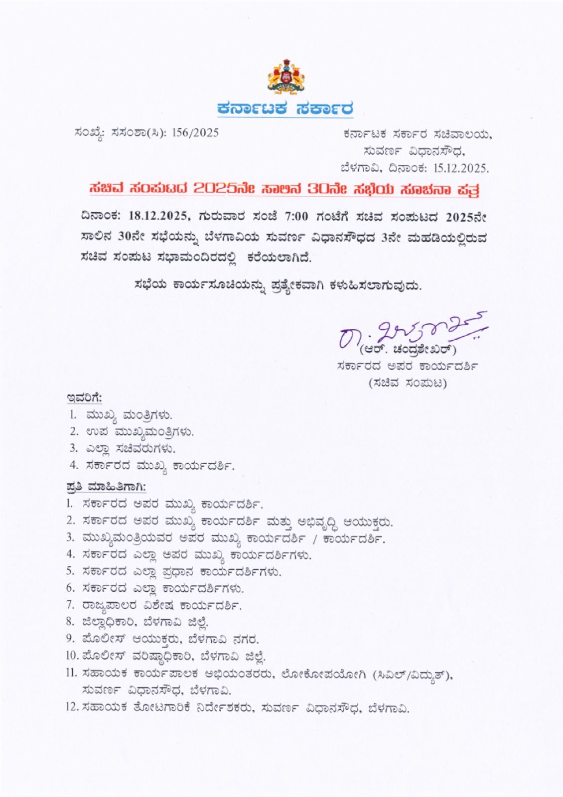 ದಿನಾಂಕ: 18.12.2025, ಗುರುವಾರ ಸಂಜೆ 7:00 ಗಂಟೆಗೆ ಸಚಿವ ಸಂಪುಟದ 2025ನೇ ಸಾಲಿನ 30ನೇ ಸಭೆಯನ್ನು ಬೆಳಗಾವಿಯ ಸುವರ್ಣ ವಿಧಾನಸೌಧದ 3ನೇ ಮಹಡಿಯಲ್ಲಿರುವ ಸಚಿವ ಸಂಪುಟ ಸಭಾಮಂದಿರದಲ್ಲಿ ಕರೆಯಲಾಗಿದೆ.