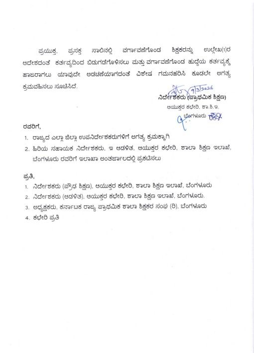 ಬಿಡುಗಡೆ ಮತ್ತು ಹಾಜರಾತಿ: ವರ್ಗಾವಣೆಗೊಂಡ ಶಿಕ್ಷಕರು ದಿನಾಂಕ 09.04.2026 ರಂದು ಪ್ರಸ್ತುತ ಕರ್ತವ್ಯದಿಂದ ಬಿಡುಗಡೆಗೊಂಡು, ದಿನಾಂಕ 10.04.2026 ರಂದು ಹೊಸ ಹುದ್ದೆಗೆ ಹಾಜರಾಗಲು ಸೂಚಿಸಲಾಗಿದೆ.