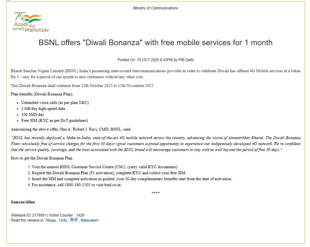 “BSNL ಇತ್ತೀಚೆಗೆ ದೇಶಾದ್ಯಂತ ಮೇಕ್-ಇನ್-ಇಂಡಿಯಾ, ಅತ್ಯಾಧುನಿಕ 4G ಮೊಬೈಲ್ ನೆಟ್ವರ್ಕ್ ಅನ್ನು ನಿಯೋಜಿಸಿದೆ, ಇದು ಆತ್ಮನಿರ್ಭರ ಭಾರತದ ದೃಷ್ಟಿಕೋನವನ್ನು ಮುನ್ನಡೆಸುತ್ತಿದೆ. ಮೊದಲ 30 ದಿನಗಳವರೆಗೆ ಸೇವಾ ಶುಲ್ಕಗಳಿಲ್ಲದೆ ಸಂಪೂರ್ಣವಾಗಿ ಉಚಿತವಾದ ದೀಪಾವಳಿ ಬೊನಾಂಜಾ ಯೋಜನೆಯು ನಮ್ಮ ಸ್ಥಳೀಯವಾಗಿ ಅಭಿವೃದ್ಧಿಪಡಿಸಿದ 4G ನೆಟ್ವರ್ಕ್ ಅನ್ನು ಅನುಭವಿಸಲು ಗ್ರಾಹಕರಿಗೆ ಹೆಮ್ಮೆಯ ಅವಕಾಶವನ್ನು ನೀಡುತ್ತದೆ. BSNL ಬ್ರ್ಯಾಂಡ್ನೊಂದಿಗೆ ಸಂಬಂಧಿಸಿದ ಸೇವಾ ಗುಣಮಟ್ಟ, ವ್ಯಾಪ್ತಿ ಮತ್ತು ನಂಬಿಕೆಯು ಗ್ರಾಹಕರು ಉಚಿತ 30 ದಿನಗಳ ಅವಧಿಯನ್ನು ಮೀರಿ ನಮ್ಮೊಂದಿಗೆ ಇರಲು ಪ್ರೋತ್ಸಾಹಿಸುತ್ತದೆ ಎಂದು ನಮಗೆ ವಿಶ್ವಾಸವಿದೆ ಮೇಲಿನ ಕೊಡುಗೆಯನ್ನು ಪ್ರಕಟಿಸುತ್ತಾ, BSNL ನ CMD ಶ್ರೀ ಎ. ರಾಬರ್ಟ್ ಜೆ. ರವಿ ಹೇಳಿದ್ದಾರೆ.