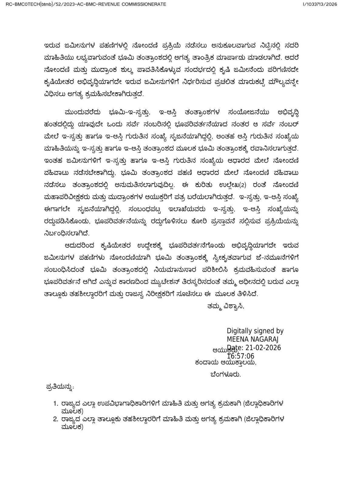 ಮ್ಯುಟೇಷನ್ ತಿರಸ್ಕರಿಸುವಂತಿಲ್ಲ: ಕೇವಲ ಭೂಪರಿವರ್ತನೆಯಾಗಿದೆ ಎಂಬ ಕಾರಣ ನೀಡಿ ಯಾವುದೇ ಮ್ಯುಟೇಷನ್ (ಖಾತಾ ಬದಲಾವಣೆ) ಅರ್ಜಿಗಳನ್ನು ತಿರಸ್ಕರಿಸಬಾರದು ಎಂದು ತಹಶೀಲ್ದಾರ್ ಮತ್ತು ರಾಜಸ್ವ ನಿರೀಕ್ಷಕರಿಗೆ ಸ್ಪಷ್ಟ ನಿರ್ದೇಶನ ನೀಡಲಾಗಿದೆ.