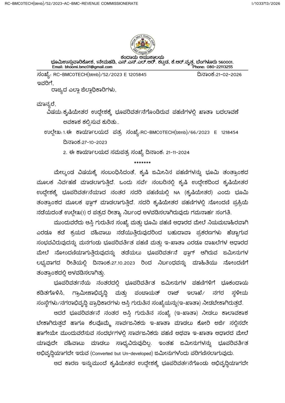 ಮ್ಯುಟೇಷನ್ ತಿರಸ್ಕರಿಸುವಂತಿಲ್ಲ: ಕೇವಲ ಭೂಪರಿವರ್ತನೆಯಾಗಿದೆ ಎಂಬ ಕಾರಣ ನೀಡಿ ಯಾವುದೇ ಮ್ಯುಟೇಷನ್ (ಖಾತಾ ಬದಲಾವಣೆ) ಅರ್ಜಿಗಳನ್ನು ತಿರಸ್ಕರಿಸಬಾರದು ಎಂದು ತಹಶೀಲ್ದಾರ್ ಮತ್ತು ರಾಜಸ್ವ ನಿರೀಕ್ಷಕರಿಗೆ ಸ್ಪಷ್ಟ ನಿರ್ದೇಶನ ನೀಡಲಾಗಿದೆ.