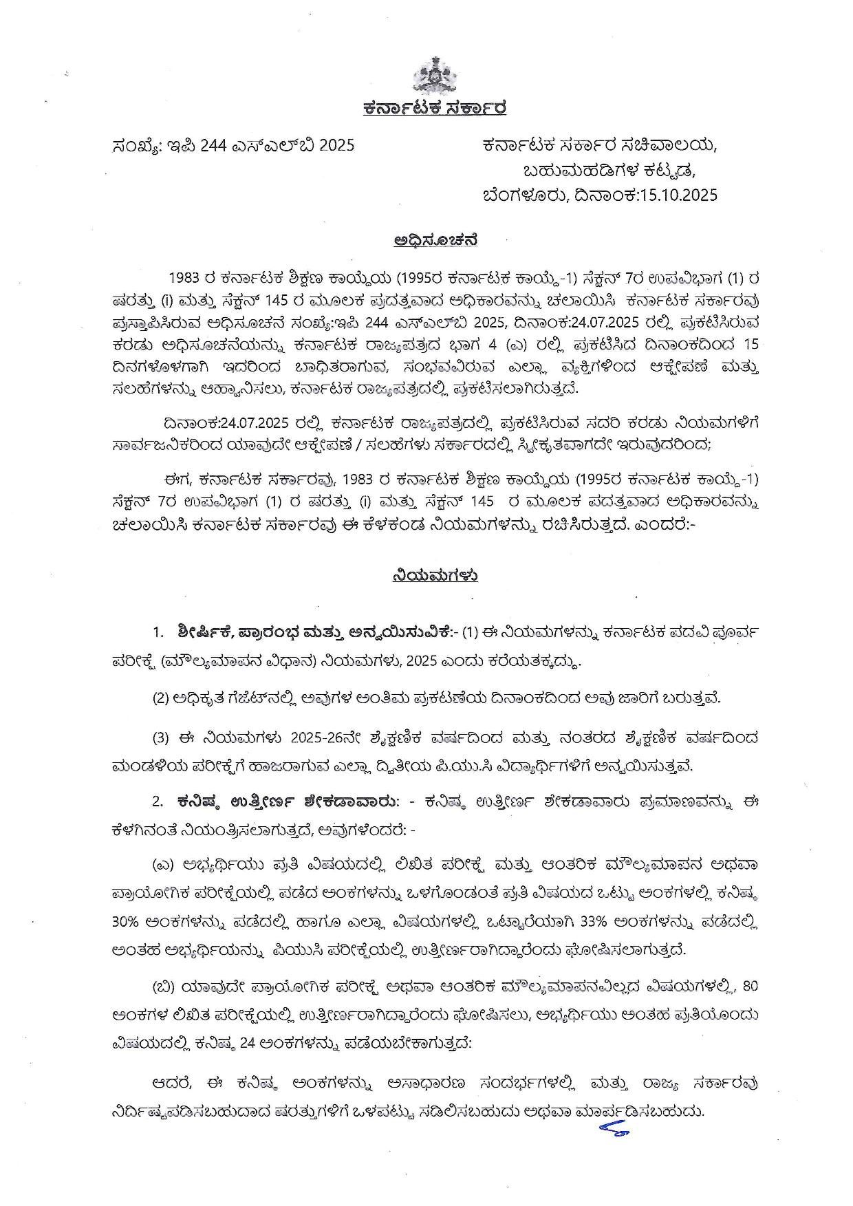ಈ ಕುರಿತಂತೆ ಅಧೀನ ಕಾರ್ಯದರ್ಶಿ (ಪ್ರೌಢ) ಶಾಲಾ ಶಿಕ್ಷಣ ಮತ್ತು ಸಾಕ್ಷರತಾ ಇಲಾಖೆ ಅಧಿಕೃತ ಆದೇಶ ಹೊರಡಿಸಿದ್ದು, ಅದರಲ್ಲಿ 1983 ರ ಕರ್ನಾಟಕ ಶಿಕ್ಷಣ ಕಾಯ್ದೆಯ (1995ರ ಕರ್ನಾಟಕ ಕಾಯ್ದೆ -1) ಸೆಕ್ಷನ್ 7ರ ಉಪವಿಭಾಗ (1) ರ ಷರತ್ತು (1) ಮತ್ತು ಸೆಕ್ಷನ್ 145 ರ ಮೂಲಕ ಪ್ರದತ್ತವಾದ ಅಧಿಕಾರವನ್ನು ಚಲಾಯಿಸಿ ಕರ್ನಾಟಕ ಸರ್ಕಾರವು ಪ್ರಸ್ತಾಪಿಸಿರುವ ಅಧಿಸೂಚನೆ ಸಂಖ್ಯೆ:ಇಪಿ 244 ಎಸ್ಎಲ್ಬಿ 2025, ದಿನಾಂಕ:24.07.2025 ರಲ್ಲಿ ಪ್ರಕಟಿಸಿರುವ ಕರಡು ಅಧಿಸೂಚನೆಯನ್ನು ಕರ್ನಾಟಕ ರಾಜ್ಯಪತ್ರದ ಭಾಗ 4 (ಎ) ರಲ್ಲಿ ಪ್ರಕಟಿಸಿದ ದಿನಾಂಕದಿಂದ 15 ದಿನಗಳೊಳಗಾಗಿ ಇದರಿಂದ ಬಾಧಿತರಾಗುವ, ಸಂಭವವಿರುವ ಎಲ್ಲಾ ವ್ಯಕ್ತಿಗಳಿಂದ ಆಕ್ಷೇಪಣೆ ಮತ್ತು ಸಲಹೆಗಳನ್ನು ಆಹ್ವಾನಿಸಲು, ಕರ್ನಾಟಕ ರಾಜ್ಯಪತ್ರದಲ್ಲಿ ಪ್ರಕಟಿಸಲಾಗಿರುತ್ತದೆ.