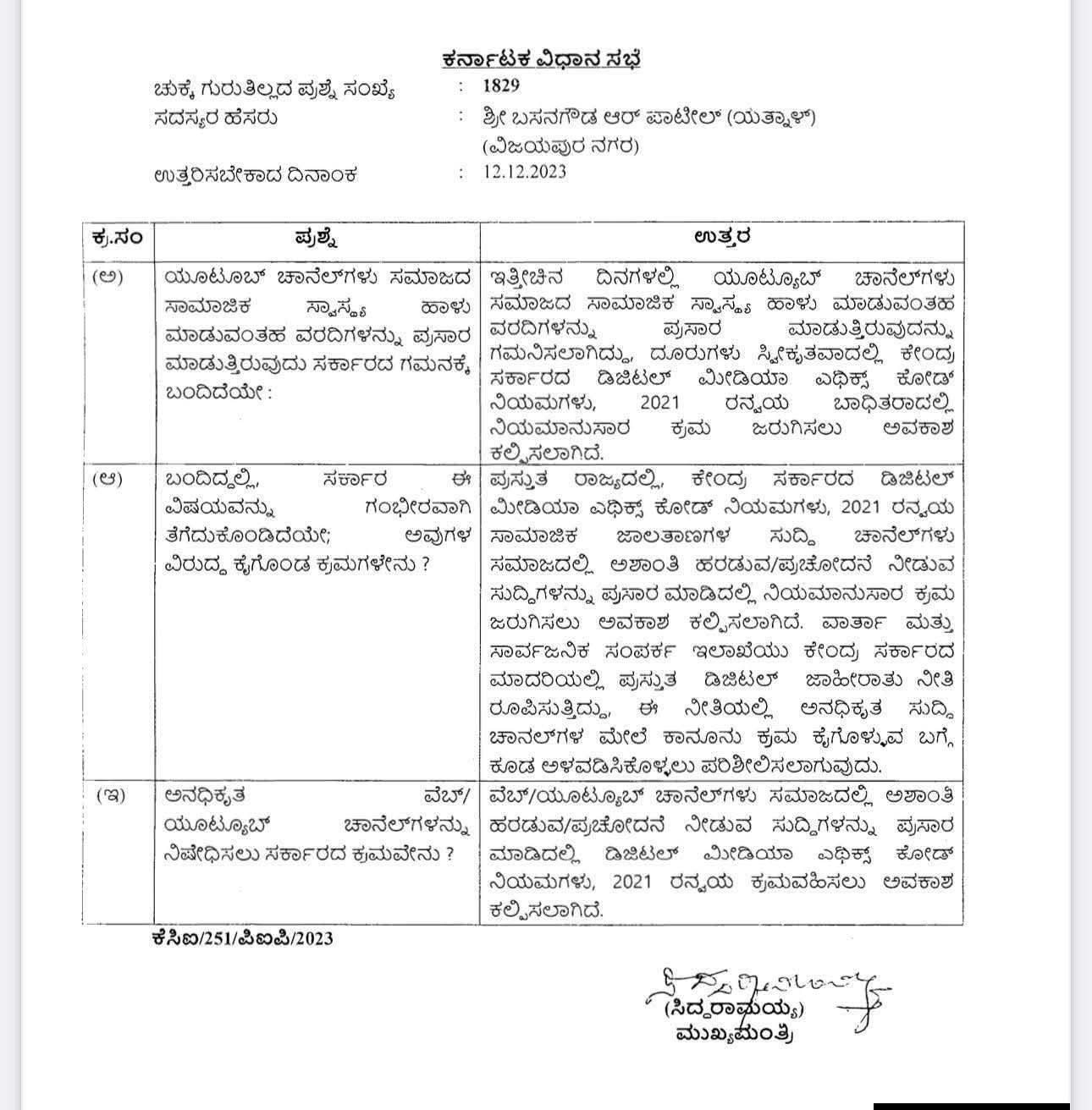 ಬೆಂಗಳೂರು: ಇತ್ತೀಚಿನ ದಿನಗಳಲ್ಲಿ ಸಮಾಜದ ಶಾಂತಿ ಮತ್ತು ಸಾಮರಸ್ಯಕ್ಕೆ ಧಕ್ಕೆ ತರುವಂತಹ ವರದಿಗಳನ್ನು ಪ್ರಸಾರ ಮಾಡುತ್ತಿರುವ ಯೂಟ್ಯೂಬ್ ಚಾನಲ್ಗಳ ಮೇಲೆ ಕಾನೂನು ಕ್ರಮ ಜರುಗಿಸಲು ಸರ್ಕಾರ ಮುಂದಾಗಿದೆ. ವಿಧಾನ ಸಭೆಯ ಅಧಿವೇಶನದಲ್ಲಿ ಶಾಸಕ ಬಸನಗೌಡ ಆರ್. ಪಾಟೀಲ್ (ಯತ್ನಾಳ್) ಅವರ ಪ್ರಶ್ನೆಗೆ ಮುಖ್ಯಮಂತ್ರಿ ಸಿದ್ದರಾಮಯ್ಯನವರು ಈ ಕುರಿತು ಲಿಖಿತ ಉತ್ತರ ನೀಡಿದ್ದಾರೆ.