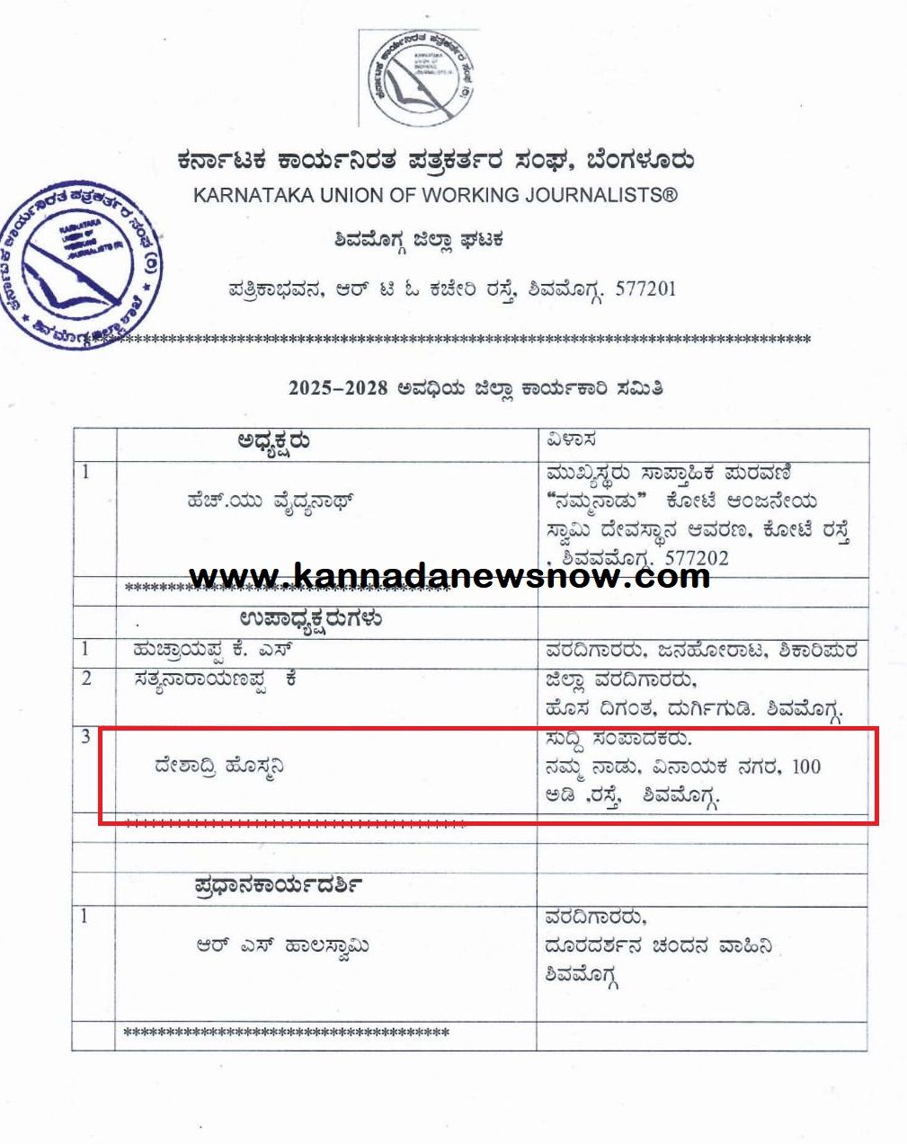 ಕರ್ನಾಟಕ ಕಾರ್ಯನಿರತ ಪತ್ರಕರ್ತರ ಸಂಘ(KUWJ)ಯ ಶಿವಮೊಗ್ಗ ಜಿಲ್ಲಾ ಘಟಕದ ಉಪಾಧ್ಯಕ್ಷರನ್ನಾಗಿ ದೇಶಾದ್ರಿ ಹೊಸ್ಮನೆ ಅವರನ್ನು ನೇಮಕ ಮಾಡಿರುವುದಾಗಿ ಜಿಲ್ಲಾಧ್ಯಕ್ಷರಾದಂತ ಹೆಚ್.ಯು ವೈದ್ಯನಾಥ್ ಹಾಗೂ ಪ್ರಧಾನ ಕಾರ್ಯದರ್ಶಿ ಆರ್.ಎಸ್ ಹಾಲಸ್ವಾಮಿ ಘೋಷಿಸಿದ್ದಾರೆ.