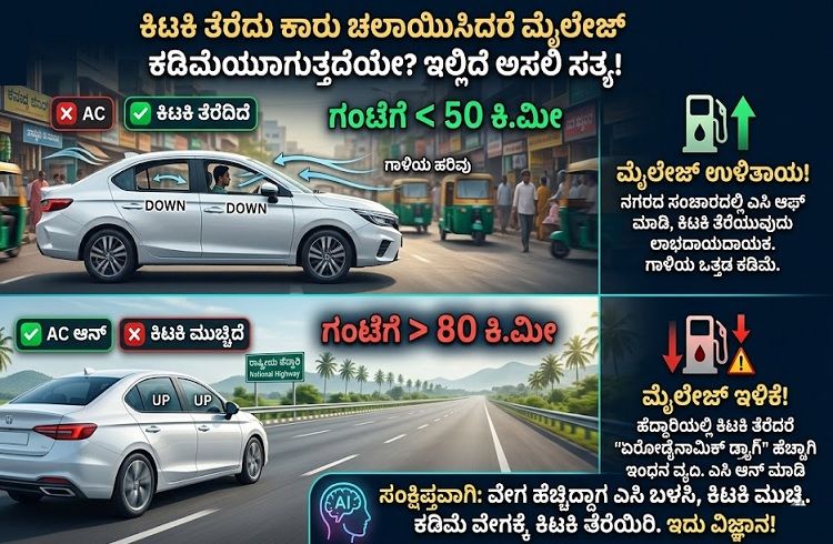 ಸಾಮಾನ್ಯವಾಗಿ ಕಾರಿನಲ್ಲಿ ಎಸಿ (AC) ಹಾಕಿದರೆ ಇಂಧನ ಹೆಚ್ಚು ಖರ್ಚಾಗುತ್ತದೆ ಎಂದು ಭಾವಿಸಿ ಅನೇಕರು ಕಿಟಕಿಗಳನ್ನು ತೆರೆದು ಪ್ರಯಾಣಿಸುತ್ತಾರೆ. ಆದರೆ, ಇದು ಯಾವಾಗಲೂ ಸರಿಯಲ್ಲ. ಕಾರಿನ ವೇಗ ಮತ್ತು ‘ಏರೋಡೈನಾಮಿಕ್ಸ್’ (ಗಾಳಿಯ ಒತ್ತಡ) ಆಧಾರದ ಮೇಲೆ ಇದು ಕೆಲಸ ಮಾಡುತ್ತದೆ.