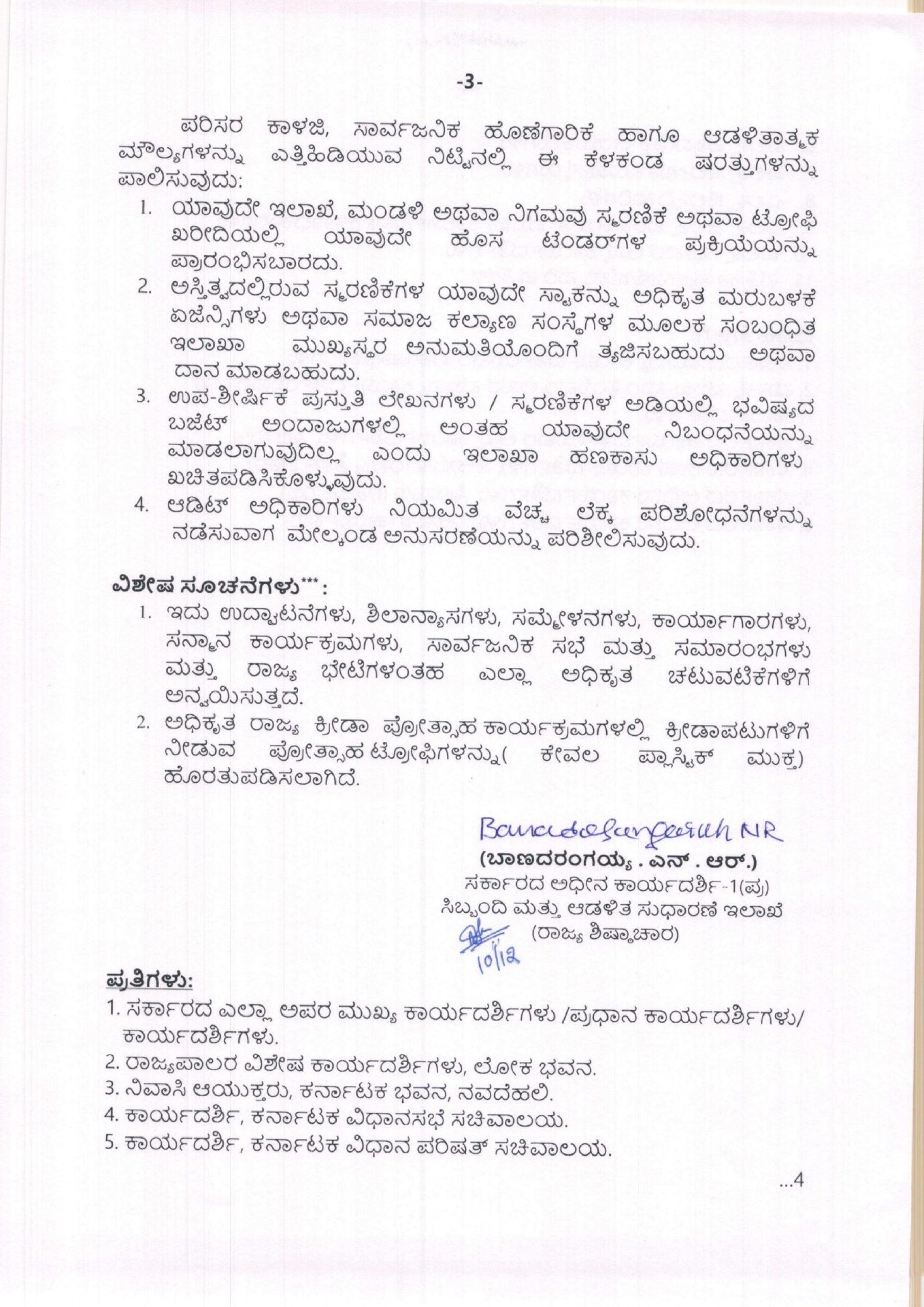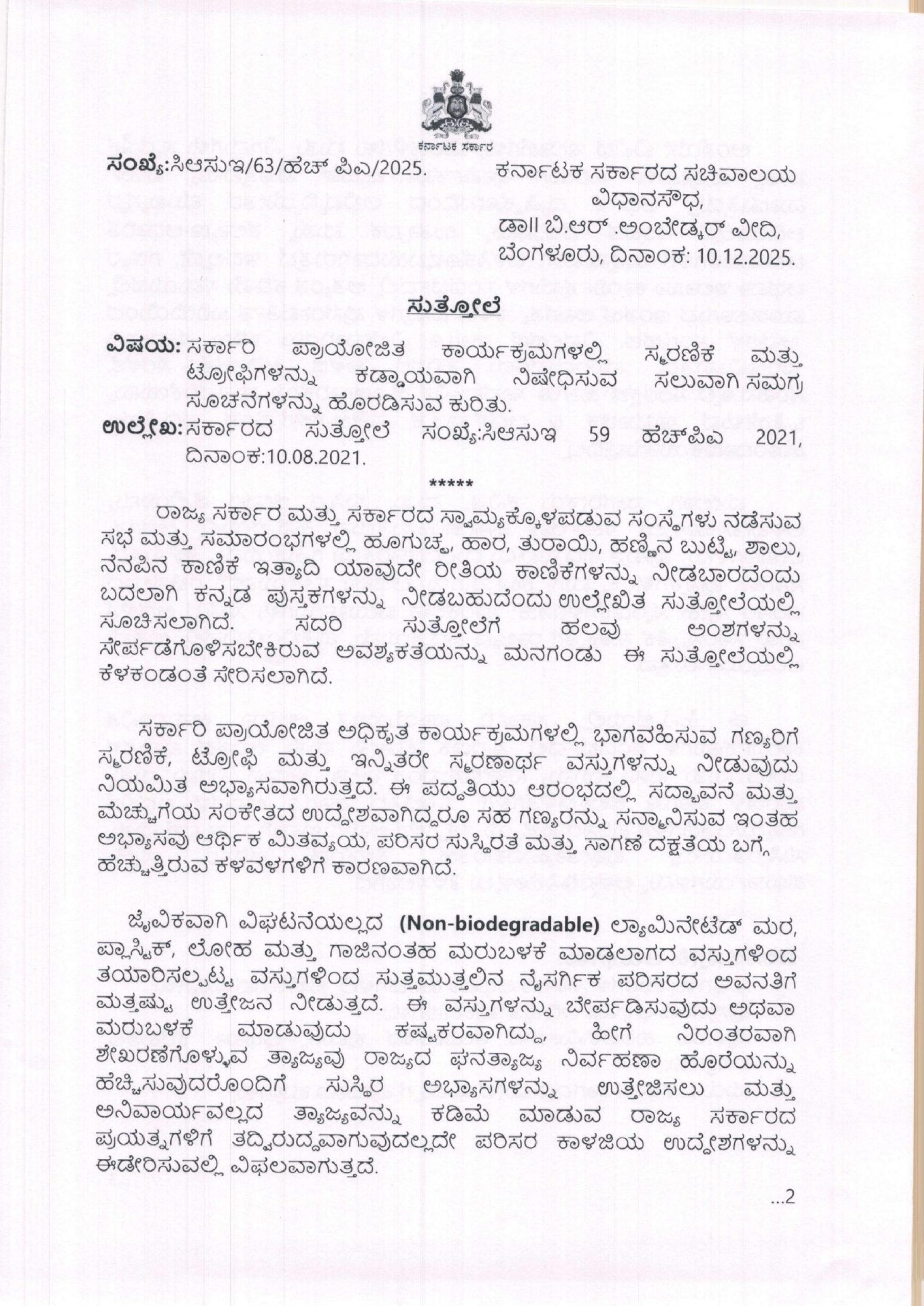 ದಿನಾಂಕ 10-12-2025ರಂದು ರಾಜ್ಯದ ಸಿಬ್ಬಂದಿ ಮತ್ತು ಆಡಳಿತ ಸುಧಾರಣೆ ಇಲಾಖೆಯ ಸರ್ಕಾರದ ಅಧೀನ ಕಾರ್ಯದರ್ಶಿಯವರು ಸುತ್ತೋಲೆಯೊಂದನ್ನು ಹೊರಡಿಸಿದ್ದಾರೆ. ಆ ಸುತ್ತೋಲೆಯಂತೆ ಸರ್ಕಾರಿ ಪ್ರಾಯೋಜಿತ ಕಾರ್ಯಕ್ರಮಗಳಲ್ಲಿ ಸ್ಮರಣಿಕೆ ಮತ್ತು ಟ್ರೋಫಿಗಳನ್ನು ಕಡ್ಡಾಯವಾಗಿ ನಿಷೇಧಿಸಲಾಗಿದೆ. ಇದಷ್ಟೇ ಅಲ್ಲದೇ ಹೂಗುಚ್ಚ, ಹಾರ, ತುರಾಯಿ, ಹಣ್ಣಿನ ಬುಟ್ಟಿ, ಶಾಲು, ನೆನಪಿನ ಕಾಣಿಕೆ ಇತ್ಯಾದಿ ಯಾವುದೇ ರೀತಿಯ ಕಾಣಿಕೆಗಳನ್ನು ನೀಡಬಾರದೆಂಬುದಾಗಿಯೇ ಖಡಕ್ ಸೂಚನೆ ನೀಡಲಾಗಿದೆ.