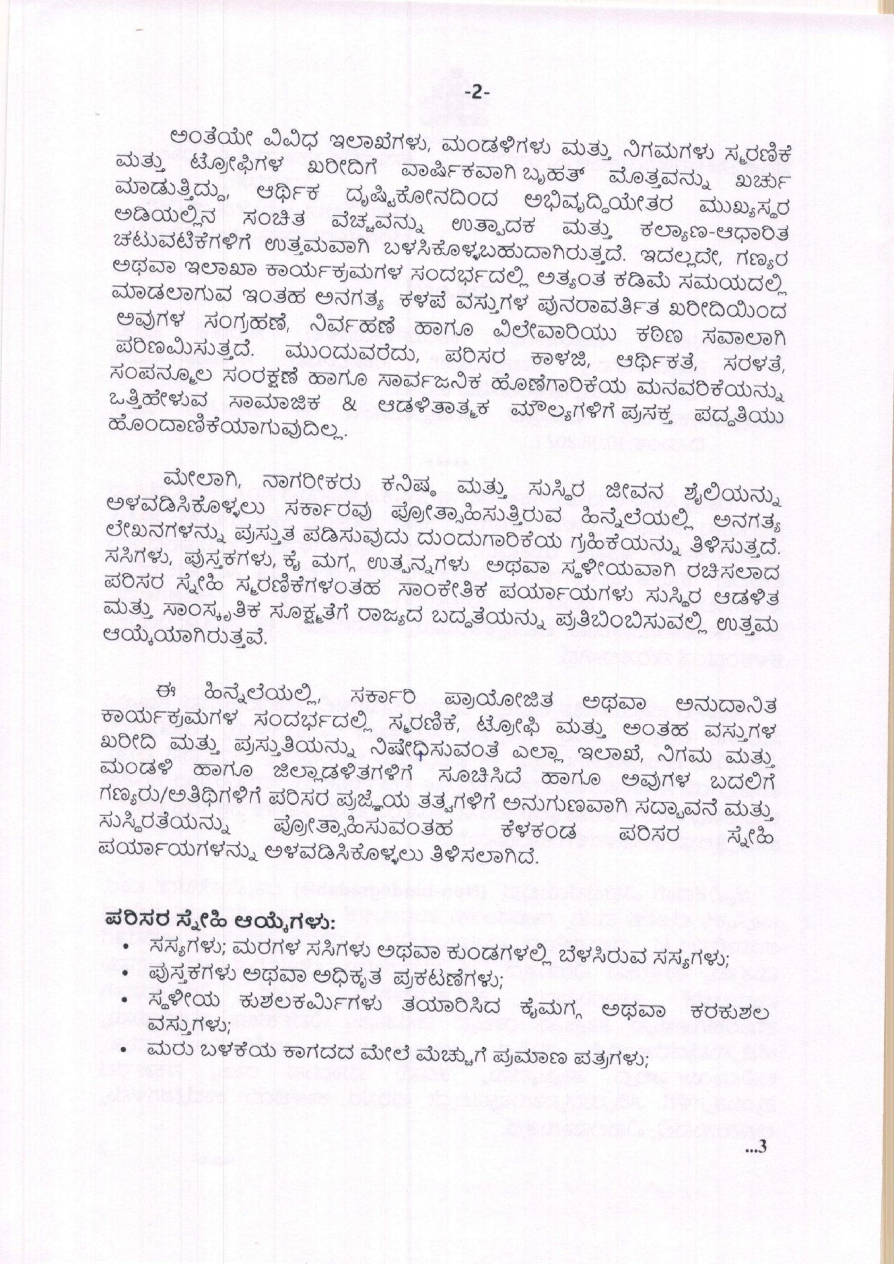 ಈ ಎಲ್ಲಾ ಕಾರಣದಿಂದಾಗಿ ಪರಿಸರ ಸ್ನೇಹಿ ಆಯ್ಕೆಗಳನ್ನು ಆಯ್ಕೆ ಮಾಡಿಕೊಳ್ಳಬೇಕು. ಸರ್ಕಾರಿ ಪ್ರಾಯೋಜಿತ ಕಾರ್ಯಕ್ರಮಗಳಲ್ಲಿ ಮರಗಳ ಸಸಿಗಳು ಅಥವಾ ಕುಂಡಗಳಲ್ಲಿ ಬೆಳಸಿರುವ ಸಸ್ಯಗಳನ್ನು ವಿತರಿಸಬೇಕು. ಪುಸ್ತಕಗಳು ಅಥವಾ ಅಧಿಕೃತ ಪ್ರಕಟಣೆಗಳನ್ನು ನೀಡುವುದು. ಸ್ಥಳೀಯ ಕುಶಲಕರ್ಮಿಗಳು ತಯಾರಿಸಿದ ಕೈಮಗ್ಗ ಅಥವಾ ಕರಕುಶಲ ವಸ್ತುಗಳನ್ನು ನೀಡಬೇಕು. ಮರು ಬಳಕೆಯ ಕಾಗದದ ಮೇಲೆ ಮೆಚ್ಚುಗೆ ಪ್ರಮಾಣಪತ್ರಗಳನ್ನು ನೀಡಬಹುದು ಎಂದಿದೆ.