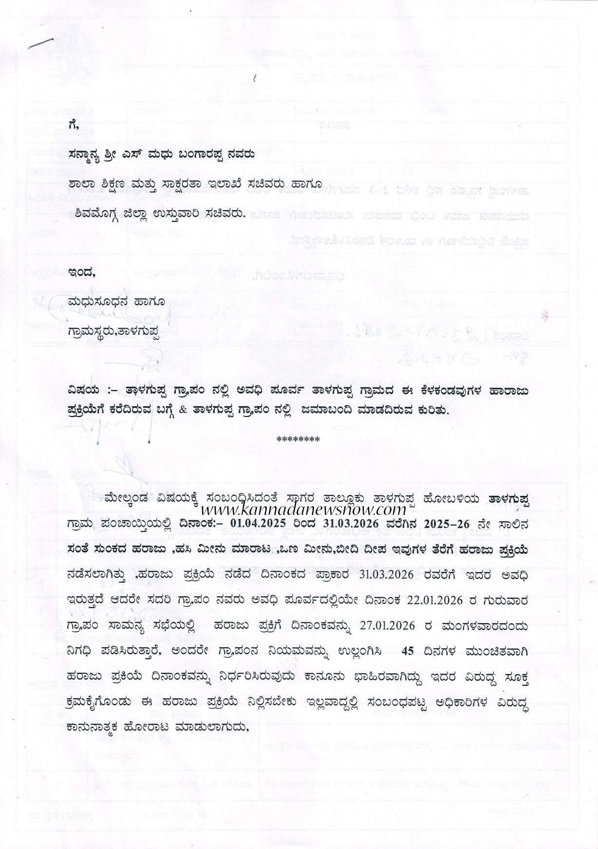 ಅವರು ಸಲ್ಲಿಸಿರುವಂತ ದೂರಿನಲ್ಲಿ ತಾಳಗುಪ್ಪ ಗ್ರಾಮ ಪಂಚಾಯ್ತಿ ವ್ಯಾಪ್ತಿಯಲ್ಲಿ ದಿನಾಂಕ 01-04-2025ರಿಂದ 31-03-2026ರವರೆಗೆ 2025-26ನೇ ಸಾಲಿನ ಸಂತೆ ಸುಂಕದ ಹರಾಜು, ಹಸಿ ಮೀನು ಮಾರಾಟ, ಒಣ ಮೀನು, ಬೀದಿ ದೀಪ ಇವುಗಳ ಹರಾಜನ್ನು ದಿನಾಂಕ 27-01-2026ರಂದು ನಡೆಸಲಾಗುತ್ತಿದೆ. ಇದು ಗ್ರಾಮ ಪಂಚಾಯ್ತಿ ನಿಯಮ ಉಲ್ಲಂಘಿಸಿ 45 ದಿನಗಳ ಮುಂಚಿತವಾಗಿ ಹರಾಜು ಪ್ರಕ್ರಿಯೆಯಾಗಿದೆ. ಇದು ಕಾನೂನು ಬಾಹಿರವಾದಂತದ್ದು. ಇದರ ವಿರುದ್ಧ ಸೂಕ್ತ ಕ್ರಮ ಕೈಗೊಂಡು, ಹರಾಜು ಪ್ರಕ್ರಿಯೆ ನಿಲ್ಲಿಸಬೇಕು. ಇಲ್ಲವಾದಲ್ಲಿ ಸಂಬಂಧಪಟ್ಟ ಅಧಿಕಾರಿಗಳ ವಿರುದ್ಧ ಕಾನೂನು ಹೋರಾಟ ಮಾಡುವುದಾಗಿ ತಿಳಿಸಿದ್ದರು.