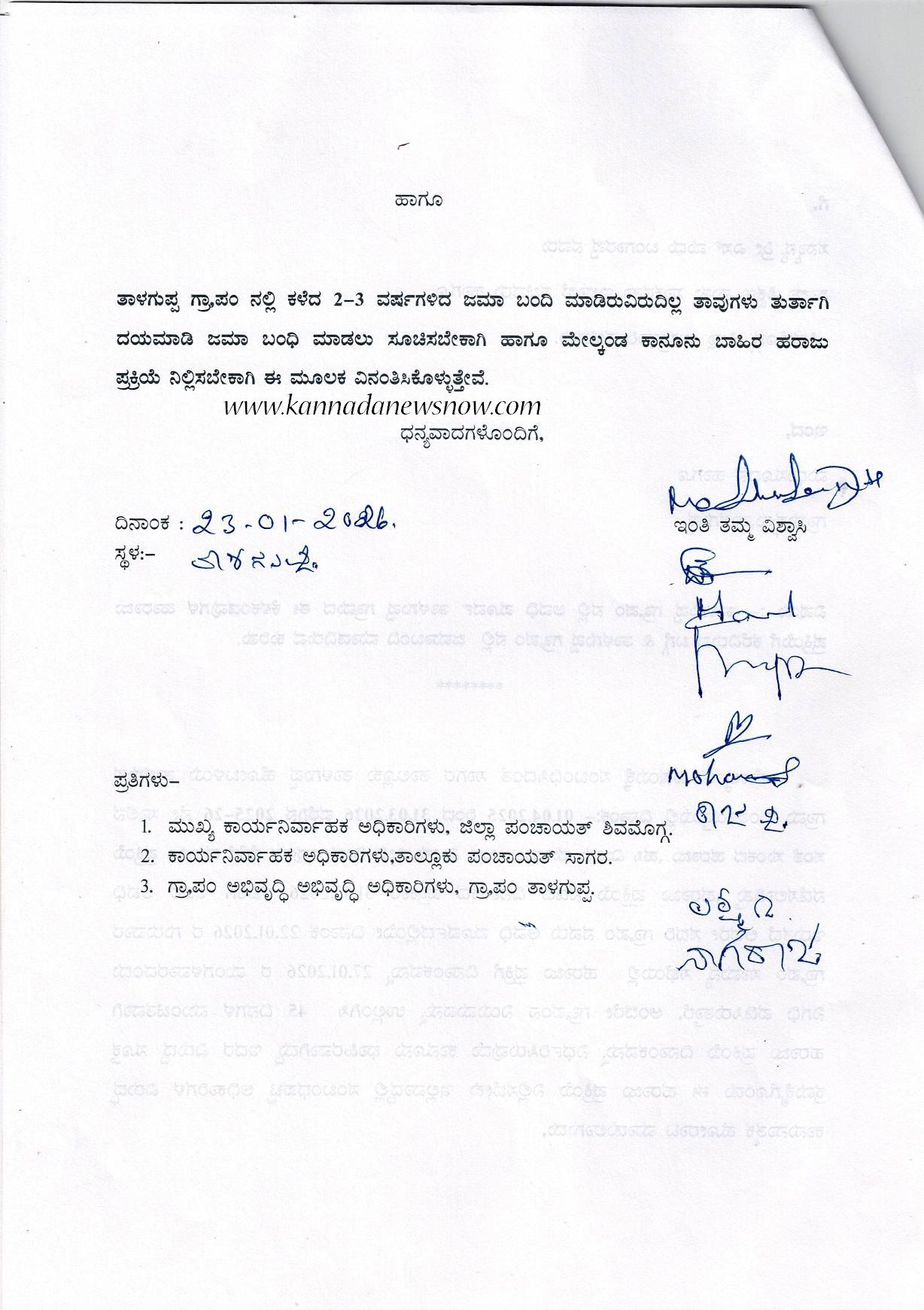 ಇದಷ್ಟೇ ಅಲ್ಲದೇ ತಾಳಗುಪ್ಪ ಗ್ರಾಮ ಪಂಚಾಯ್ತಿಯಲ್ಲಿ ಕಳೆದ 2-3 ವರ್ಷಗಳಿಂದ ಜಮಾ ಬಂದಿ ಮಾಡಿರೋದಿಲ್ಲ. ಶಿವಮೊಗ್ಗ ಜಿಲ್ಲಾ ಉಸ್ತುವಾರಿ ಸಚಿವರಾದಂತ ತಾವುಗಳು ತುರ್ತಾಗಿ ಜಮಾ ಬಂದಿ ಮಾಡಿಸಲು ಸೂಚಿಸಬೇಕು. ಕಾನೂನು ಬಾಹಿರ ಹರಾಜು ಪ್ರಕ್ರಿಯೆ ನಿಲ್ಲಿಸುವಂತೆ ವಿನಂತಿಸಲಾಗಿತ್ತು.