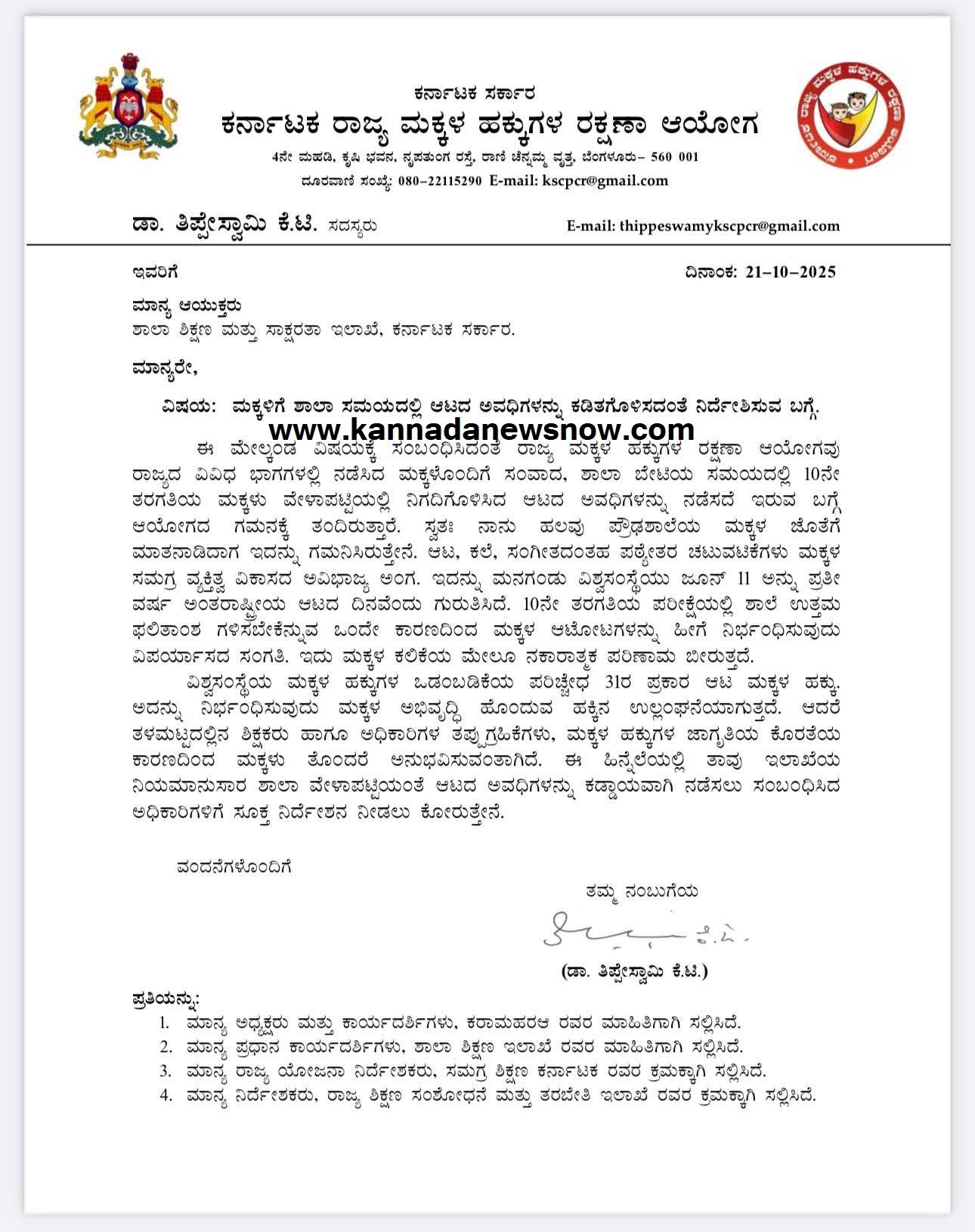 ಈ ಕುರಿತಂತೆ ಕರ್ನಾಟಕ ರಾಜ್ಯ ಮಕ್ಕಳ ಹಕ್ಕುಗಳ ಆಯೋಗದ ಸದಸ್ಯ ಡಾ.ಕೆ.ಟಿ ತಿಪ್ಪೇಸ್ವಾಮಿ ಅವರು, ಶಾಲಾ ಶಿಕ್ಷಣ ಮತ್ತು ಸಾಕ್ಷರತಾ ಇಲಾಖೆಯ ಆಯುಕ್ತರಿಗೆ ಪತ್ರ ಬರೆದಿದ್ದಾರೆ. ಅದರಲ್ಲಿ ರಾಜ್ಯ ಮಕ್ಕಳ ಹಕ್ಕುಗಳ ರಕ್ಷಣಾ ಆಯೋಗವು ರಾಜ್ಯದ ವಿವಿಧ ಭಾಗಗಳಲ್ಲಿ ನಡೆಸಿದ ಮಕ್ಕಳೊಂದಿಗೆ ಸಂವಾದ, ಶಾಲಾ ಭೇಟಿಯ ಸಮಯದಲ್ಲಿ 10ನೇ ತರಗತಿಯ ಮಕ್ಕಳು ವೇಳಾಪಟ್ಟಿಯಲ್ಲಿ ನಿಗದಿಗೊಳಿಸಿದ ಆಟದ ಅವಧಿಗಳನ್ನು ನಡೆಸದೆ ಇರುವ ಬಗ್ಗೆ ಆಯೋಗದ ಗಮನಕ್ಕೆ ತಂದಿರುತ್ತಾರೆ ಎಂದಿದ್ದಾರೆ.