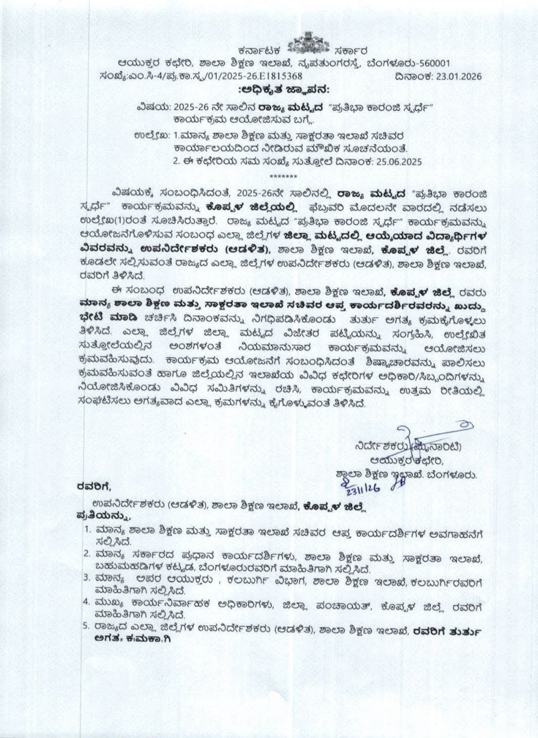 ವಿಷಯಕ್ಕೆ ಸಂಬಂಧಿಸಿದಂತೆ, 2025-26ನೇ ಸಾಲಿನಲ್ಲಿ ರಾಜ್ಯ ಮಟ್ಟದ ‘ಪ್ರತಿಭಾ ಕಾರಂಜಿ ಸ್ಪರ್ಧೆ” ಕಾರ್ಯಕ್ರಮವನ್ನು ಕೊಪ್ಪಳ ಜಿಲ್ಲೆಯಲ್ಲಿ ಫೆಬ್ರವರಿ ಮೊದಲನೇ ವಾರದಲ್ಲಿ ನಡೆಸಲು ಉಲ್ಲೇಖ(1)ರಂತೆ ಸೂಚಿಸಿರುತ್ತಾರೆ. ರಾಜ್ಯ ಮಟ್ಟದ “ಪ್ರತಿಭಾ ಕಾರಂಜಿ ಸ್ಪರ್ಧೆ” ಕಾರ್ಯಕ್ರಮವನ್ನು ಆಯೋಜನೆಗೊಳಿಸುವ ಸಂಬಂಧ ಎಲ್ಲಾ ಜಿಲ್ಲೆಗಳ ಜಿಲ್ಲಾ ಮಟ್ಟದಲ್ಲಿ ಆಯ್ಕೆಯಾದ ವಿದ್ಯಾರ್ಥಿಗಳ ವಿವರವನ್ನು ಉಪನಿರ್ದೇಶಕರು (ಆಡಳಿತ), ಶಾಲಾ ಶಿಕ್ಷಣ ಇಲಾಖೆ, ಕೊಪ್ಪಳ ಜಿಲ್ಲೆ. ರವರಿಗೆ ಕೂಡಲೇ ಸಲ್ಲಿಸುವಂತೆ ರಾಜ್ಯದ ಎಲ್ಲಾ ಜಿಲ್ಲೆಗಳ ಉಪನಿರ್ದೇಶಕರು (ಆಡಳಿತ), ಶಾಲಾ ಶಿಕ್ಷಣ ಇಲಾಖೆ, ರವರಿಗೆ ತಿಳಿಸಿದೆ.