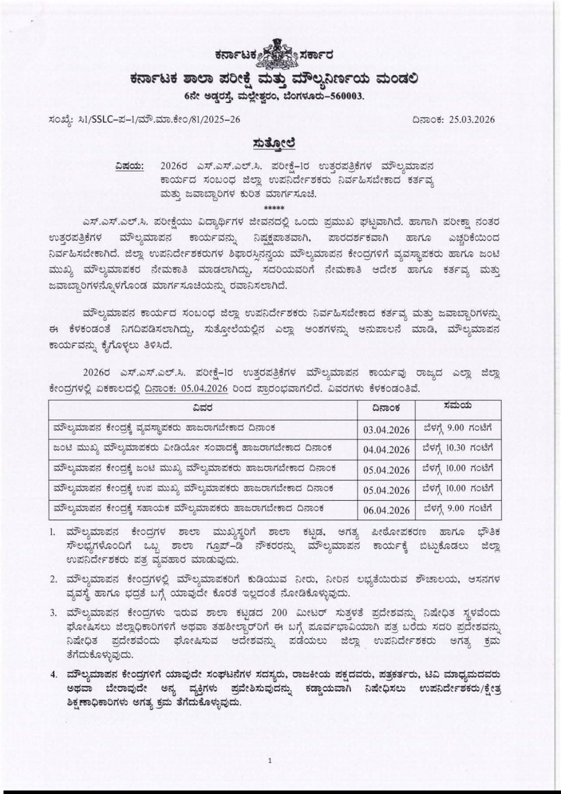 ಬೆಂಗಳೂರು: ವಿದ್ಯಾರ್ಥಿಗಳ ಜೀವನದ ಪ್ರಮುಖ ಘಟ್ಟವಾದ ಎಸ್ಎಸ್ಎಲ್ಸಿ ಪರೀಕ್ಷೆಯ ಉತ್ತರ ಪತ್ರಿಕೆಗಳ ಮೌಲ್ಯಮಾಪನ ಕಾರ್ಯವನ್ನು ಅತ್ಯಂತ ನಿಷ್ಪಕ್ಷಪಾತವಾಗಿ ಮತ್ತು ಎಚ್ಚರಿಕೆಯಿಂದ ನಿರ್ವಹಿಸಲು ಕರ್ನಾಟಕ ಶಾಲಾ ಪರೀಕ್ಷೆ ಮತ್ತು ಮೌಲ್ಯನಿರ್ಣಯ ಮಂಡಳಿಯು ಸನ್ನದ್ಧವಾಗಿದೆ. ಏಪ್ರಿಲ್ 5, 2026 ರಿಂದ ರಾಜ್ಯಾದ್ಯಂತ ಏಕಕಾಲದಲ್ಲಿ ಮೌಲ್ಯಮಾಪನ ಪ್ರಕ್ರಿಯೆ ಆರಂಭವಾಗಲಿದ್ದು, ಈ ಸಂಬಂಧ ಜಿಲ್ಲಾ ಉಪನಿರ್ದೇಶಕರು (ಆಡಳಿತ) ಪಾಲಿಸಬೇಕಾದ ಕಠಿಣ ಮಾರ್ಗಸೂಚಿಗಳನ್ನು ಬಿಡುಗಡೆ ಮಾಡಲಾಗಿದೆ.
