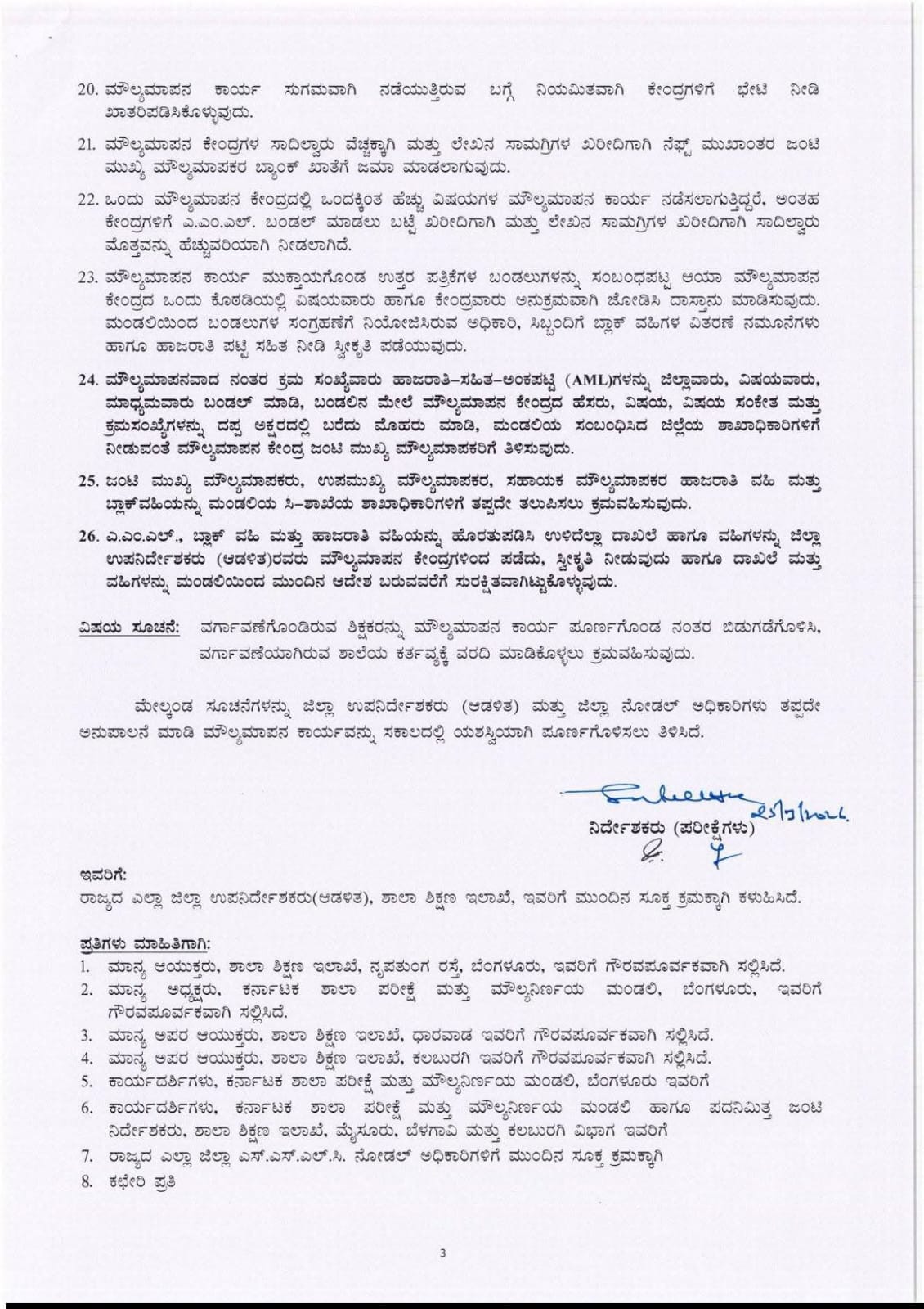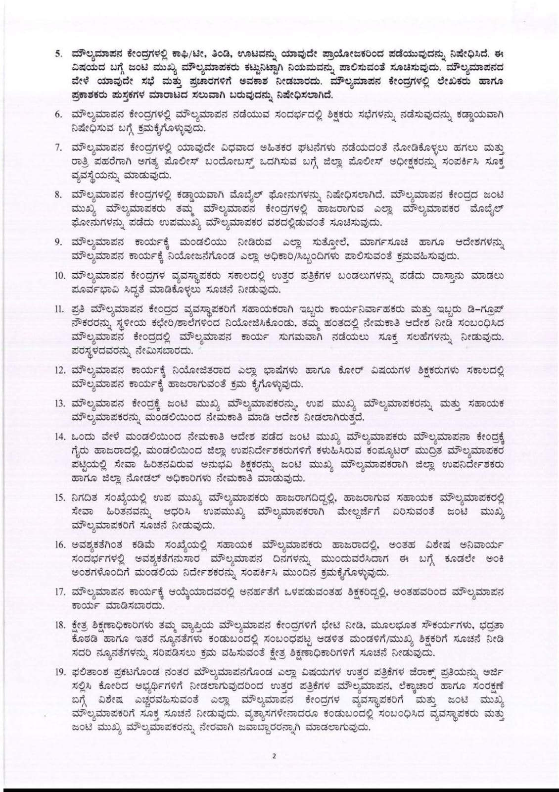 ಹಾಜರಾತಿ ಕಡ್ಡಾಯ: ನಿಯೋಜನೆಗೊಂಡ ಎಲ್ಲಾ ಭಾಷಾ ಮತ್ತು ಕೋರ್ ವಿಷಯಗಳ ಶಿಕ್ಷಕರು ನಿಗದಿತ ಸಮಯದಲ್ಲಿ ಹಾಜರಾಗುವುದು ಕಡ್ಡಾಯ. ಅನರ್ಹ ಶಿಕ್ಷಕರು ಮೌಲ್ಯಮಾಪನ ಕಾರ್ಯದಲ್ಲಿ ತೊಡಗಿದ್ದರೆ ಅಂತವರನ್ನು ಕೂಡಲೇ ಕೈಬಿಡಲು ಸೂಚಿಸಲಾಗಿದೆ.
