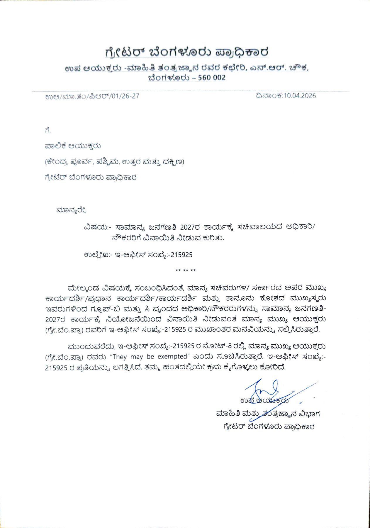 ಬೆಂಗಳೂರು: ಮುಂಬರುವ ‘ಸಾಮಾನ್ಯ ಜನಗಣತಿ 2027’ ರ ಕಾರ್ಯಕ್ಕೆ ನಿಯೋಜನೆಗೊಳ್ಳುವ ಸಚಿವಾಲಯದ ಅಧಿಕಾರಿ ಮತ್ತು ನೌಕರರಿಗೆ ವಿನಾಯಿತಿ ನೀಡುವಂತೆ ಗ್ರೇಟರ್ ಬೆಂಗಳೂರು ಪ್ರಾಧಿಕಾರವು ಸೂಚನೆ ನೀಡಿದೆ.