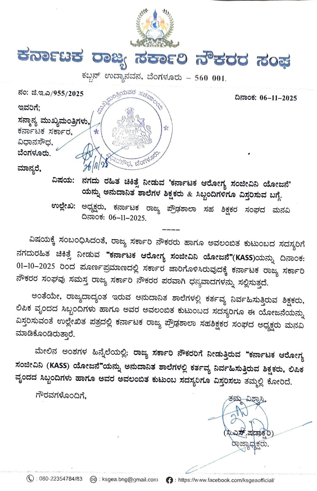 ಈ ಕುರಿತಂತೆ ಸಿಎಂ ಸಿದ್ಧರಾಮಯ್ಯ ಅವರಿಗೆ ಪತ್ರ ಬರೆದಿರುವಂತ ಅವರು, ರಾಜ್ಯದ ಸರ್ಕಾರಿ ನೌಕರರು, ಅವರ ಅವಲಂಬಿತರ ಕುಟುಂಬದ ಸದಸ್ಯರಿಗೆ ನಗದು ರಹಿತ ಚಿಕಿತ್ಸೆ ನೀಡಲು ಕರ್ನಾಟಕ ಆರೋಗ್ಯ ಸಂಜೀವನಿ ಯೋಜನೆಯನ್ನು ಜಾರಿಗೊಳಿಸಿರೋದಕ್ಕೆ ನೌಕರರ ಸಂಘದ ಪರವಾಗಿ ಧನ್ಯವಾದವನ್ನು ಸಲ್ಲಿಸಿದ್ದಾರೆ.