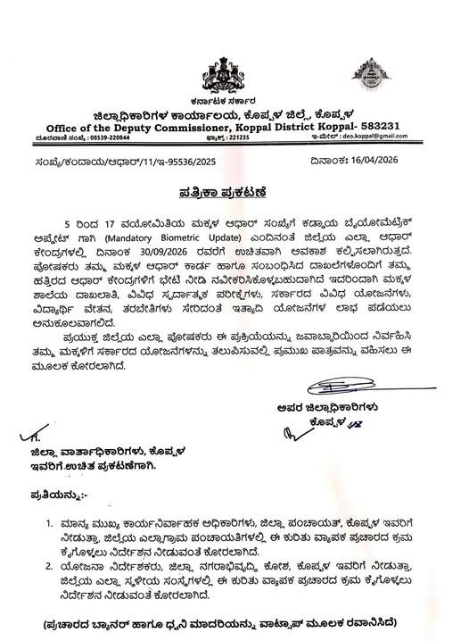 5 ರಿಂದ 17 ವರ್ಷ ವಯೋಮಿತಿಯ ಮಕ್ಕಳಿಗೆ ಆಧಾರ್ ಸಂಖ್ಯೆಯ ಕಡ್ಡಾಯ ಬಯೋಮೆಟ್ರಿಕ್ ಅಪ್ಡೇಟ್ ಮಾಡಲು ಸೆಪ್ಟೆಂಬರ್ 30, 2026 ರವರೆಗೆ ಕಾಲಾವಕಾಶ ನೀಡಲಾಗಿದೆ. ಎಲ್ಲಾ ಆಧಾರ್ ಕೇಂದ್ರಗಳಲ್ಲಿ ಈ ಸೇವೆ ಸಂಪೂರ್ಣ ಉಚಿತವಾಗಿ ಲಭ್ಯವಿರುತ್ತದೆ.