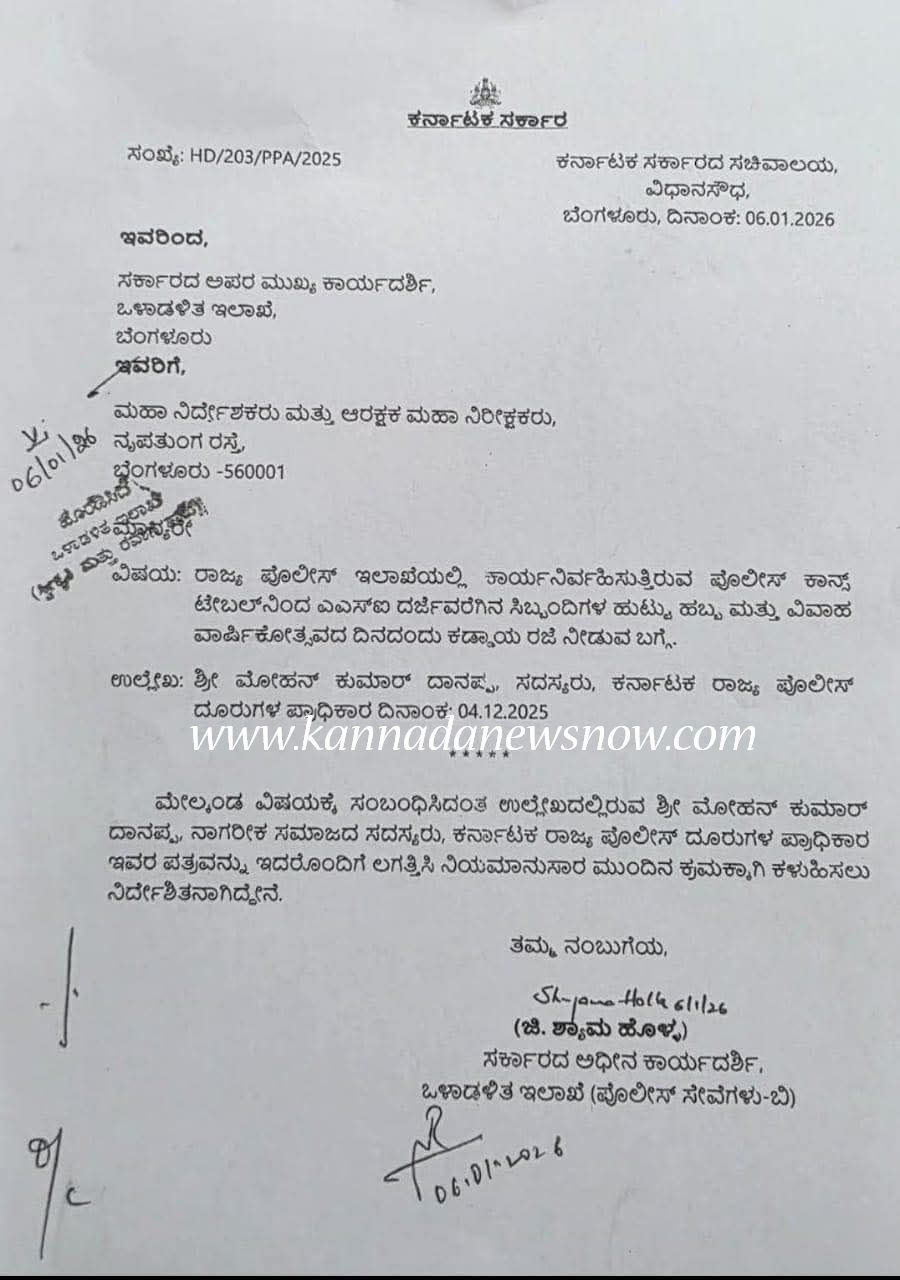 ಬೆಂಗಳೂರು: ಇನ್ಮುಂದೆ ರಾಜ್ಯದಲ್ಲಿ ಕರ್ತವ್ಯ ನಿರ್ವಹಿಸುತ್ತಿರುವಂತ ಪೊಲೀಸ್ ಅಧಿಕಾರಿ, ಸಿಬ್ಬಂದಿಗಳ ಹುಟ್ಟಿದ ಹಬ್ಬ, ವಿವಾಹ ವಾರ್ಷಿಕೋತ್ಸವಕ್ಕೆ ರಜೆ ನೀಡುವಂತೆ ಸರ್ಕಾರ ಪೊಲೀಸ್ ಮಹಾ ನಿರ್ದೇಶಕರು ಮತ್ತು ಆರಕ್ಷಕ ಮಹಾ ನಿರೀಕ್ಷಕರಿಗೆ ಪತ್ರದಲ್ಲಿ ಸೂಕ್ತ ಕ್ರಮಕ್ಕೆ ಸೂಚಿಸಿದೆ.