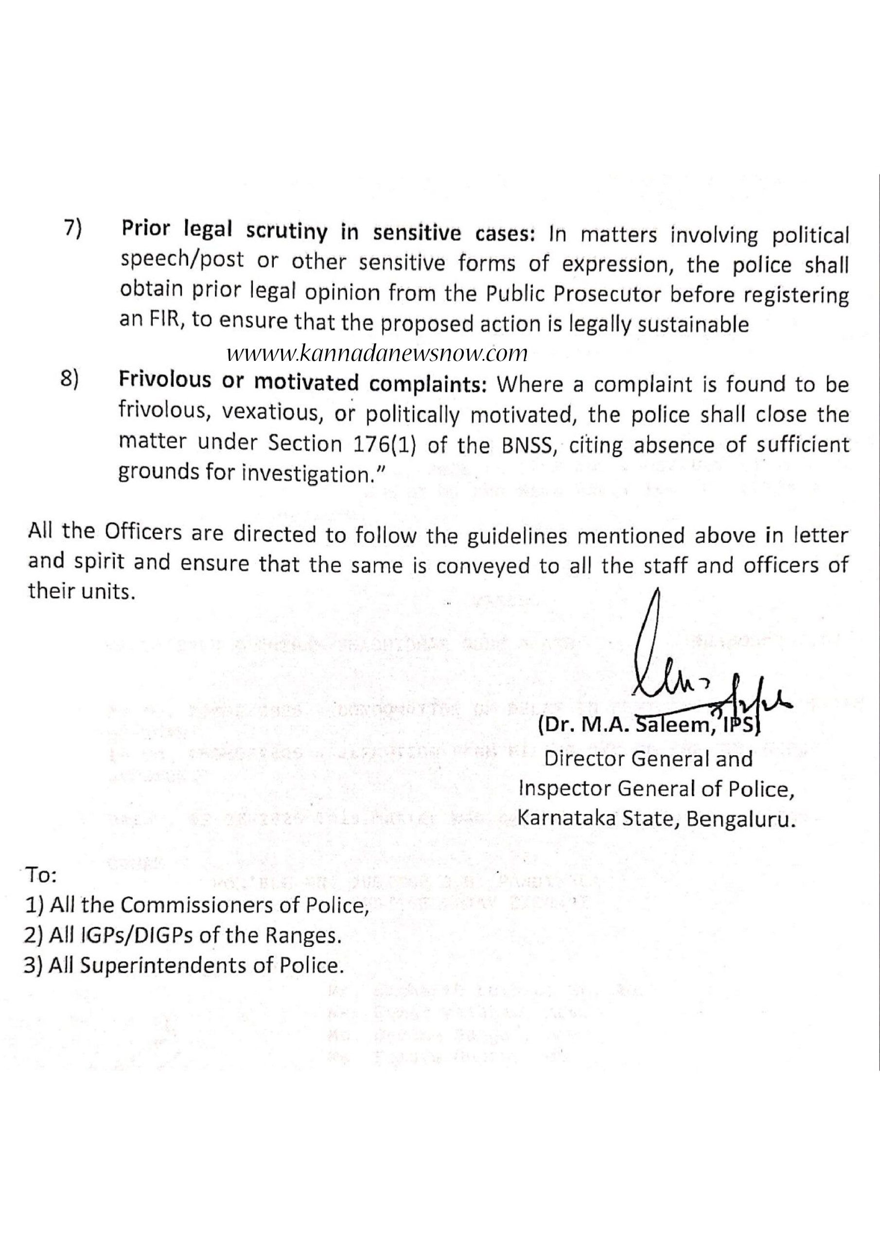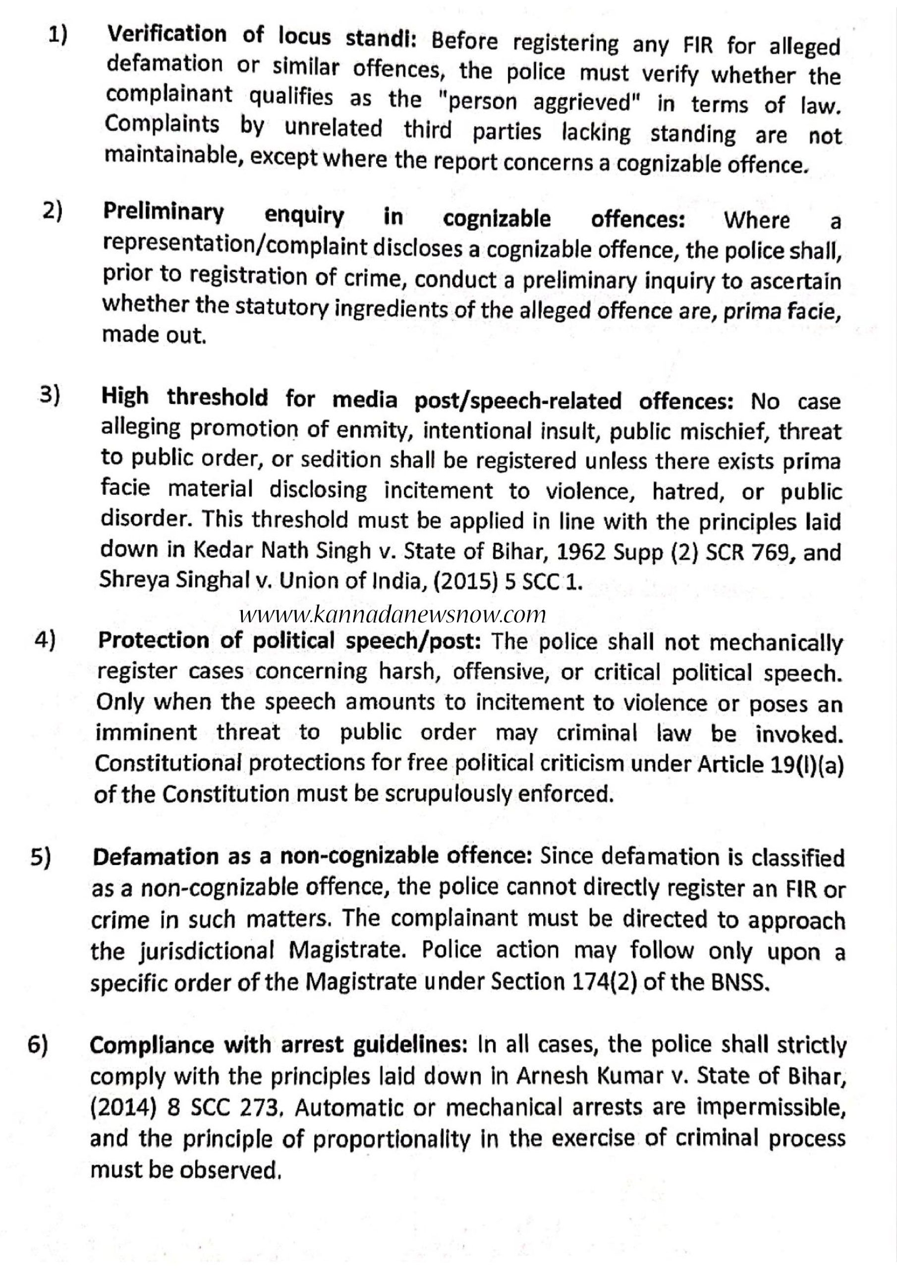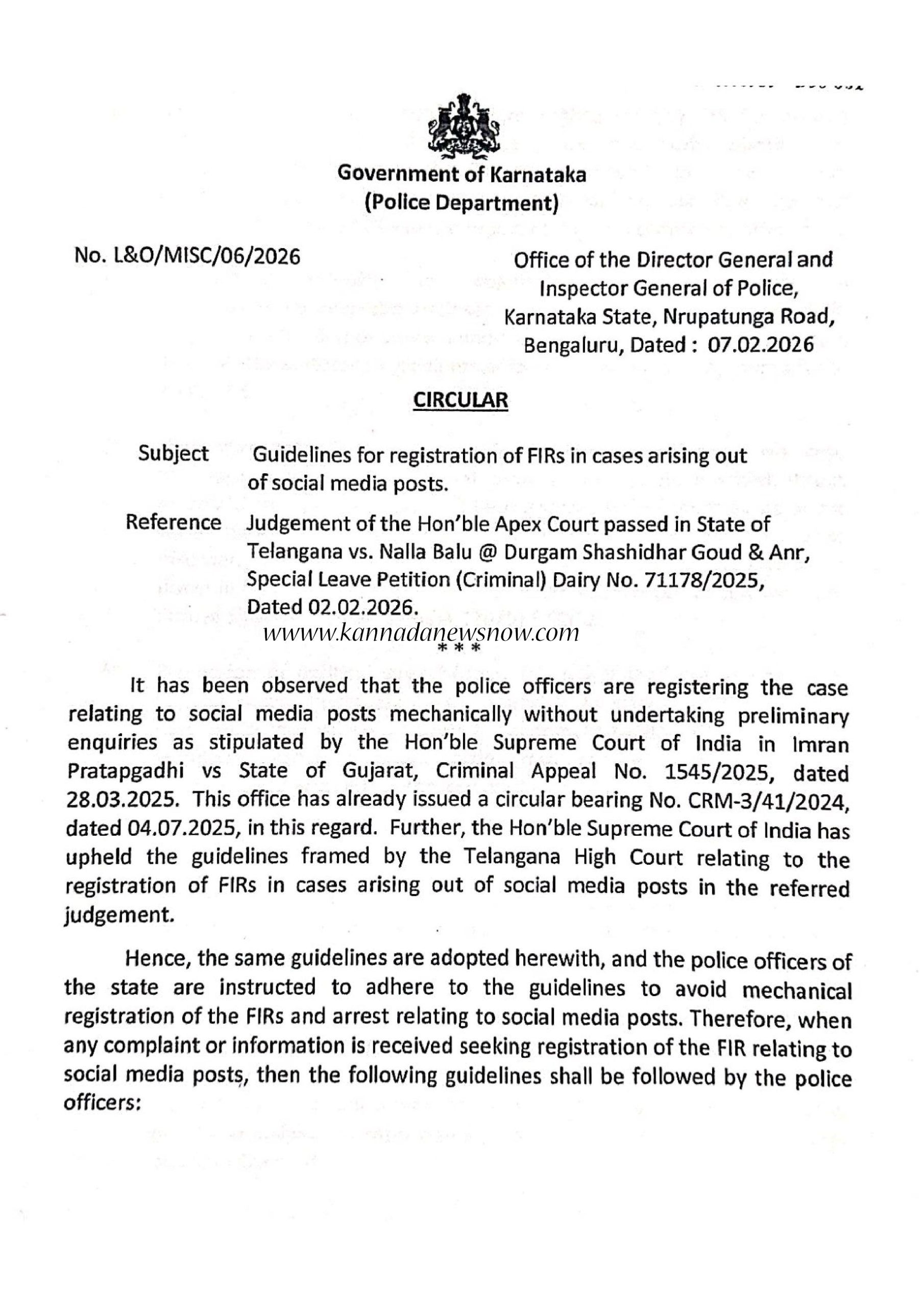 ಈ ಕುರಿತಂತೆ ರಾಜ್ಯ ಸರ್ಕಾರದಿಂದ ಮಾರ್ಗಸೂಚಿಗಳನ್ನು ಬಿಡುಗಡೆ ಮಾಡಿದ್ದು, ಸುಪ್ರೀಂ ಕೋರ್ಟ್ ನಿಗದಿಪಡಿಸಿದಂತೆ ಪ್ರಾಥಮಿಕ ವಿಚಾರಣೆಗಳನ್ನು ಕೈಗೊಳ್ಳದೆ, ಪೊಲೀಸ್ ಅಧಿಕಾರಿಗಳು ಸಾಮಾಜಿಕ ಮಾಧ್ಯಮ ಪೋಸ್ಟ್ಗಳಿಗೆ ಸಂಬಂಧಿಸಿದ ಪ್ರಕರಣವನ್ನು ಯಾಂತ್ರಿಕವಾಗಿ ದಾಖಲಿಸುತ್ತಿದ್ದಾರೆ ಎಂದು ಗಮನಿಸಲಾಗಿದೆ. ಇಮ್ರಾನ್ ಪ್ರತಾಪ್ಗಾಧಿ vs ಗುಜರಾತ್ ರಾಜ್ಯ, ಕ್ರಿಮಿನಲ್ ಮೇಲ್ಮನವಿ ಸಂಖ್ಯೆ 1545/2025, ದಿನಾಂಕ: 28.03.2025. ಈ ಕಚೇರಿಯು ಈಗಾಗಲೇ 04.07.2025 ರಂದು CRM-3/41/2024 ಸುತ್ತೋಲೆಯನ್ನು ಹೊರಡಿಸಿದೆ. ಇದಲ್ಲದೆ, ಭಾರತದ ಗೌರವಾನ್ವಿತ ಸುಪ್ರೀಂ ಕೋರ್ಟ್, ಸಾಮಾಜಿಕ ಮಾಧ್ಯಮ ಪೋಸ್ಟ್ಗಳಿಂದ ಉಂಟಾಗುವ ಪ್ರಕರಣಗಳಲ್ಲಿ FIR ಗಳ ನೋಂದಣಿಗೆ ಸಂಬಂಧಿಸಿದಂತೆ ತೆಲಂಗಾಣ ಹೈಕೋರ್ಟ್ ರೂಪಿಸಿದ ಮಾರ್ಗಸೂಚಿಗಳನ್ನು ಉಲ್ಲೇಖಿತ ತೀರ್ಪಿನಲ್ಲಿ ಎತ್ತಿಹಿಡಿದಿದೆ ಎಂದಿದೆ.