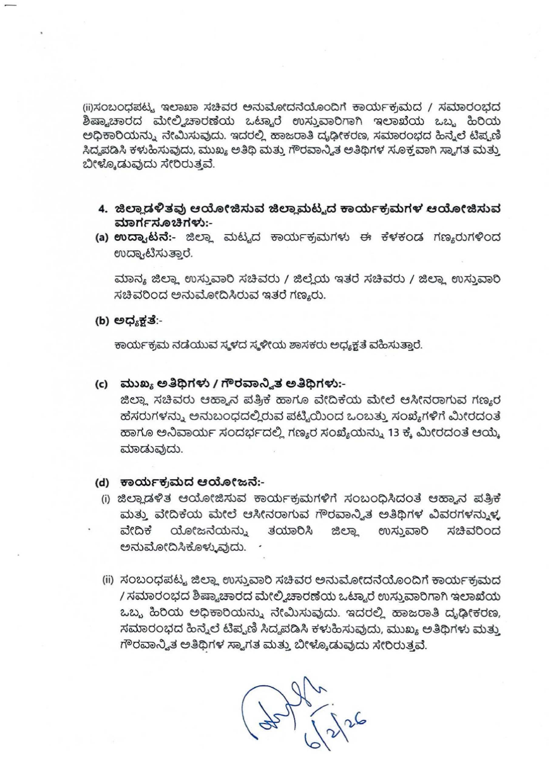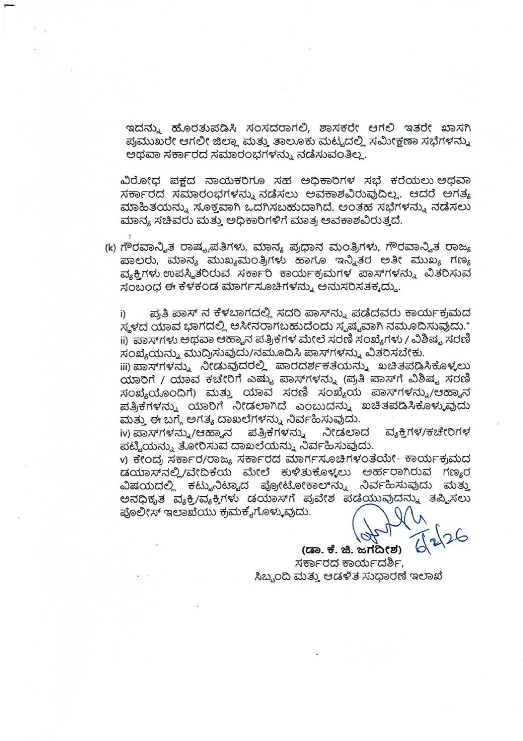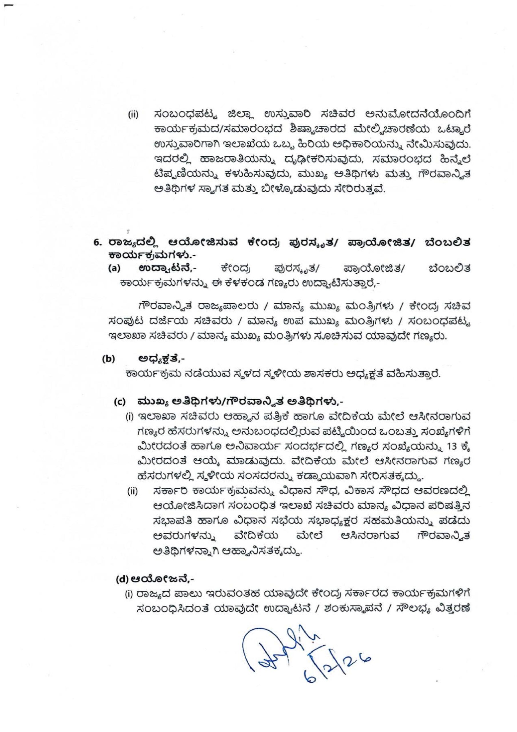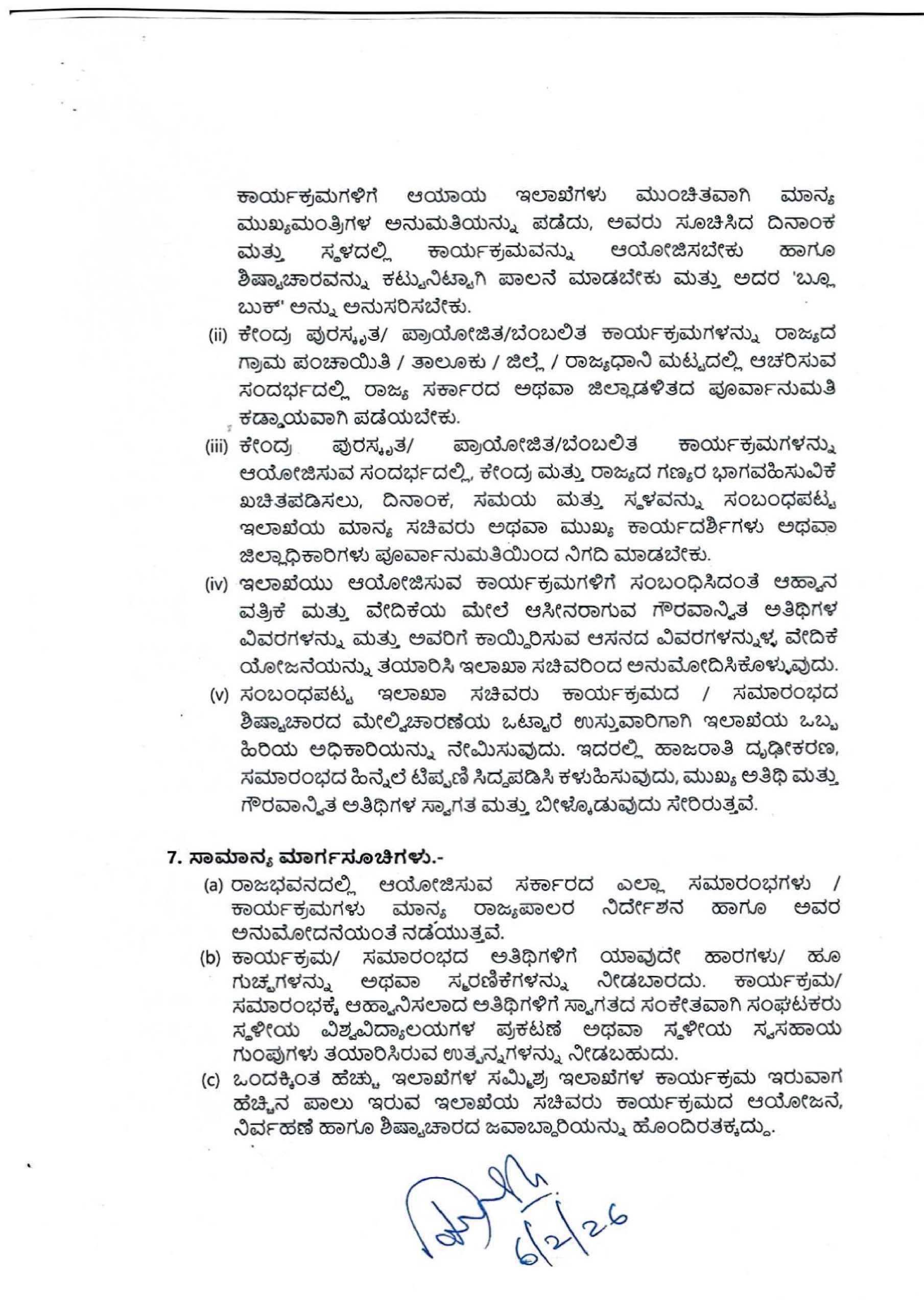 ಸಾರ್ವಜನಿಕ ಸರ್ಕಾರಿ ಕಾರ್ಯಕ್ರಮಗಳ ಆಹ್ವಾನ ಪತ್ರಿಕೆಗಳಲ್ಲಿ ಆಹಾನಿತರ ಹಾಜರಾಗುವಿಕೆಯನ್ನು ಖಚಿತಪಡಿಸಿಕೊಳ್ಳದೇ ಮುದ್ರಿಸಲಾಗುತ್ತಿರುವ ಹಿನ್ನೆಲೆಯಲ್ಲಿ ಆಹ್ವಾನಿತರ ಸಂಖ್ಯೆಯು ಹೆಚ್ಚಾಗುತ್ತಿದ್ದು ಶಿಷ್ಟಾಚಾರದನ್ವಯ ಆಸನ ವ್ಯವಸ್ಥೆಯನ್ನು ಏರ್ಪಡಿಸುವಲ್ಲಿ ಗೊಂದಲವಾಗುತ್ತಿರುವುದರಿಂದ ಸರ್ಕಾರಿ ಕಾರ್ಯಕ್ರಮಗಳನ್ನು ಯಶಸ್ವಿಗೊಳಿಸಲು ಹಾಗೂ ಸರ್ಕಾರಿ ಸಾರ್ವಜನಿಕ ಕಾರ್ಯಕ್ರಮಗಳನ್ನು ಸುಗಮವಾಗಿ ಮತ್ತು ಘನತೆಯಿಂದ ನಡೆಸಲು ಅನುವಾಗುವಂತೆ ದಿನಾಂಕ:16.04.2019ರ ಸುತ್ತೋಲೆಯನ್ನು ಸಮಗ್ರವಾಗಿ ಮಾರ್ಪಡಿಸಿ ದಿನಾಂಕ: 15.10.2025 ರಂದು ಸುತ್ತೋಲೆ ಸಂಖ್ಯೆ: ಸಿಆಸುಇ 39 ಹೆಚ್‌ಪಿಎ 2025 ಅನ್ನು ಹೊರಡಿಸಲಾಗಿದ್ದು, ಸದರಿ ಮಾರ್ಗಸೂಚಿಗಳನ್ನು ಭಾಗಶ: ಮಾರ್ಪಡಿಸಿ ಈ ಕೆಳಕಂಡಂತೆ ಅಧಿಸೂಚಿಸಲಾಗಿದೆ.