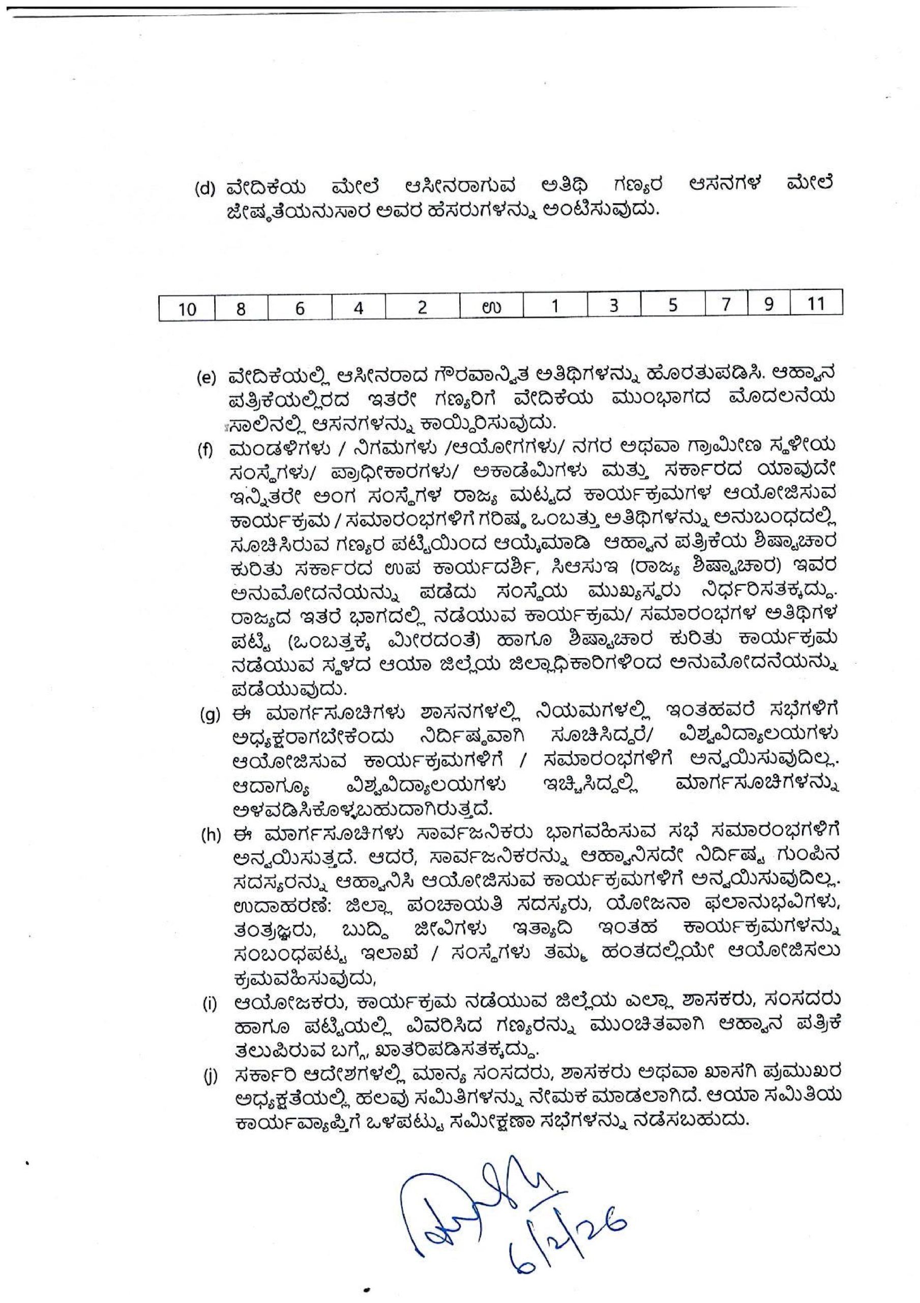(i) ಇಲಾಖಾ ಸಚಿವರು ಆಹ್ವಾನ ಪತ್ರಿಕೆ ಹಾಗೂ ವೇದಿಕೆಯ ಮೇಲೆ ಆಸೀನರಾಗುವ ಗಣ್ಯರ ಹೆಸರುಗಳನ್ನು ಅನುಬಂಧದಲ್ಲಿರುವ ಪಟ್ಟಿಯಿಂದ ಒಂಬತ್ತು ಸಂಖ್ಯೆಗಳಿಗೆ ಮೀರದಂತೆ ಹಾಗೂ ಅನಿವಾರ್ಯ ಸಂದರ್ಭದಲ್ಲಿ ಗಣ್ಯರ ಸಂಖ್ಯೆಯನ್ನು 13 ಕ್ಕೆ ಮೀರದಂತೆ ಆಯ್ಕೆ ಮಾಡುವುದು.