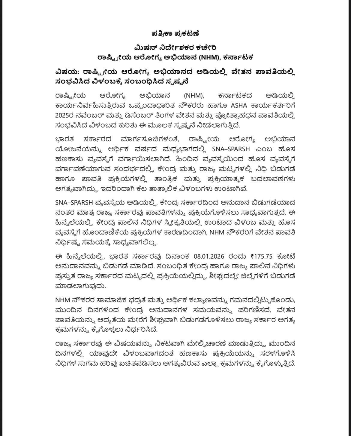 ಈ ಕುರಿತು ಸಚಿವ ದಿನೇಶ್ ಗುಂಡೂರಾವ್ ಮಾಹಿತಿ ಹಂಚಿಕೊಂಡಿದ್ದು, ರಾಷ್ಟ್ರೀಯ ಆರೋಗ್ಯ ಅಭಿಯಾನ (NHM), ಕರ್ನಾಟಕದ ಅಡಿಯಲ್ಲಿ ಕಾರ್ಯನಿರ್ವಹಿಸುತ್ತಿರುವ ಒಪ್ಪಂದಾಧಾರಿತ ನೌಕರರು ಹಾಗೂ ASHA ಕಾರ್ಯಕರ್ತರಿಗೆ 2025ರ ನವೆಂಬರ್ ಮತ್ತು ಡಿಸೆಂಬರ್ ತಿಂಗಳ ವೇತನ ಮತ್ತು ಪ್ರೋತ್ಸಾಹಧನ ಪಾವತಿಯಲ್ಲಿ ಸಂಭವಿಸಿದ ವಿಳಂಬದ ಕುರಿತು ಈ ಮೂಲಕ ಸ್ಪಷ್ಟನೆ ನೀಡಲಾಗುತ್ತಿದೆ.
