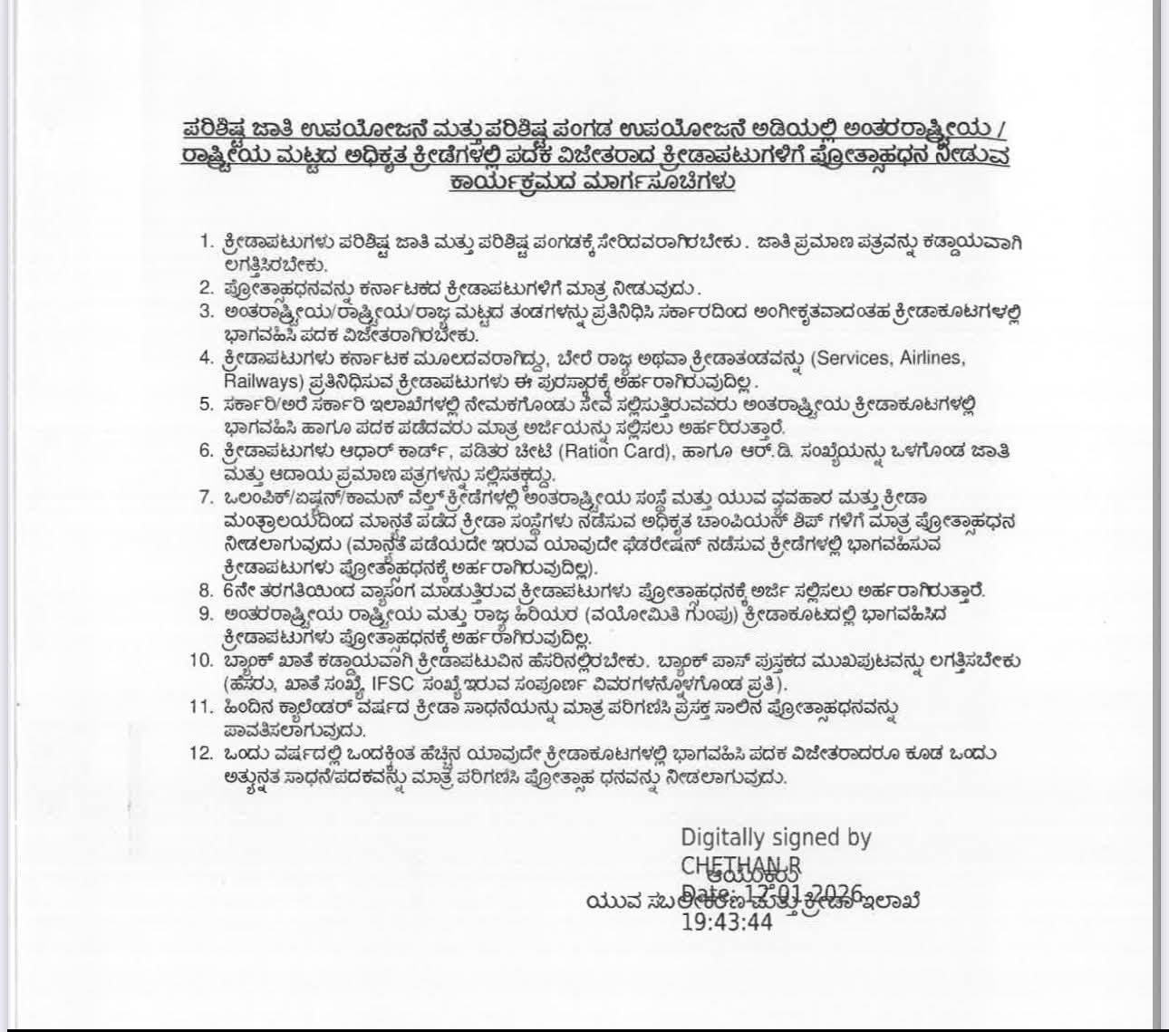 ಪರಿಶಿಷ್ಟ ಜಾತಿ ಉಪಯೋಜನೆ ಮತ್ತು ಪರಿಶಿಷ್ಟ ಪಂಗಡ ಉಪಯೋಜನೆ ಅಡಿಯಲ್ಲಿ ಅಂತರರಾಷ್ಟ್ರೀಯ /ರಾಷ್ಟ್ರೀಯ ಮಟ್ಟದ ಅಧಿಕೃತ ಕ್ರೀಡೆಗಳಲ್ಲಿ ಪದಕ ವಿಜೇತರಾದ ಕ್ರೀಡಾಪಟುಗಳಿಗೆ ಪ್ರೋತ್ಸಾಹಧನ ನೀಡುವ ಕಾರ್ಯಕ್ರಮದ ಮಾರ್ಗಸೂಚಿಗಳು