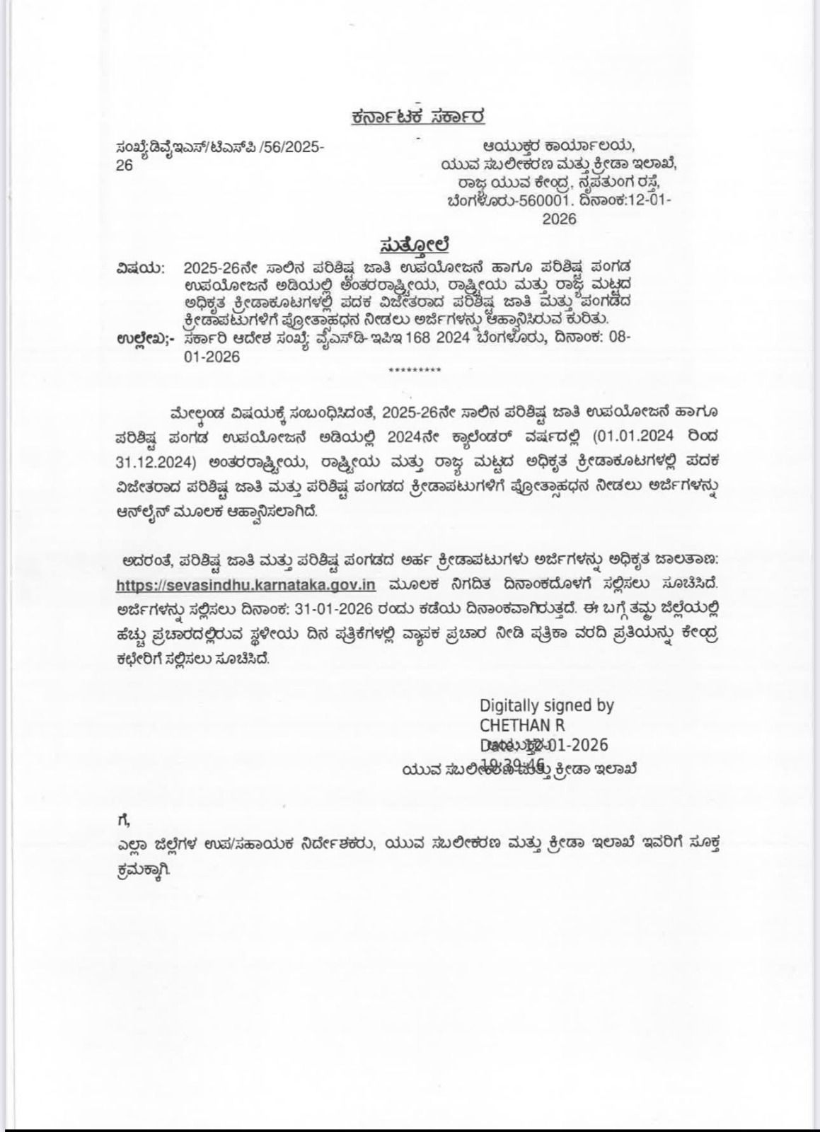 ಅದರಂತೆ, ಪರಿಶಿಷ್ಟ ಜಾತಿ ಮತ್ತು ಪರಿಶಿಷ್ಟ ಪಂಗಡದ ಅರ್ಹ ಕ್ರೀಡಾಪಟುಗಳು ಅರ್ಜಿಗಳನ್ನು ಅಧಿಕೃತ ಜಾಲತಾಣ: https://sevasindhu.karnataka.gov.in . ಅರ್ಜಿಗಳನ್ನು ಸಲ್ಲಿಸಲು ದಿನಾಂಕ: 31-01-2026 ರಂದು ಕಡೆಯ ದಿನಾಂಕವಾಗಿರುತ್ತದೆ. ಈ ಬಗ್ಗೆ ತಮ್ಮ ಜಿಲ್ಲೆಯಲ್ಲಿ ಹೆಚ್ಚು ಪ್ರಚಾರದಲ್ಲಿರುವ ಸ್ಥಳೀಯ ದಿನ ಪತ್ರಿಕೆಗಳಲ್ಲಿ ವ್ಯಾಪಕ ಪ್ರಚಾರ ನೀಡಿ ಪತ್ರಿಕಾ ವರದಿ ಪ್ರತಿಯನ್ನು ಕೇಂದ್ರ ಕಛೇರಿಗೆ ಸಲ್ಲಿಸಲು ಸೂಚಿಸಿದೆ.